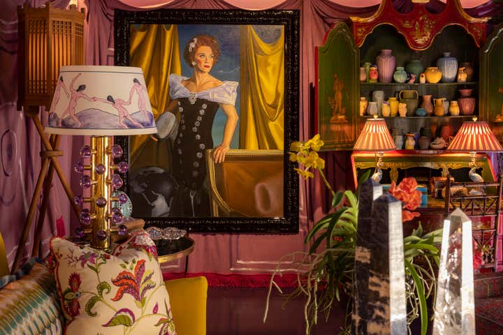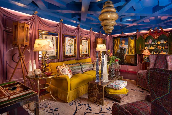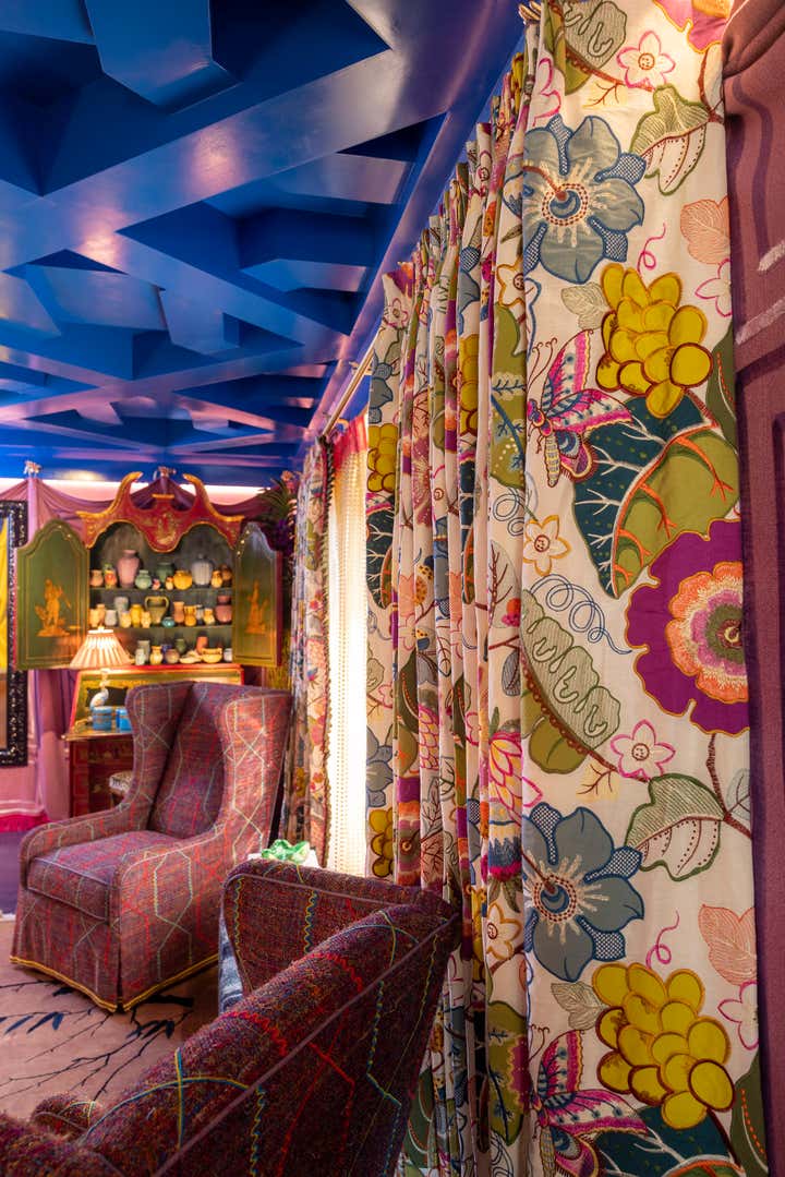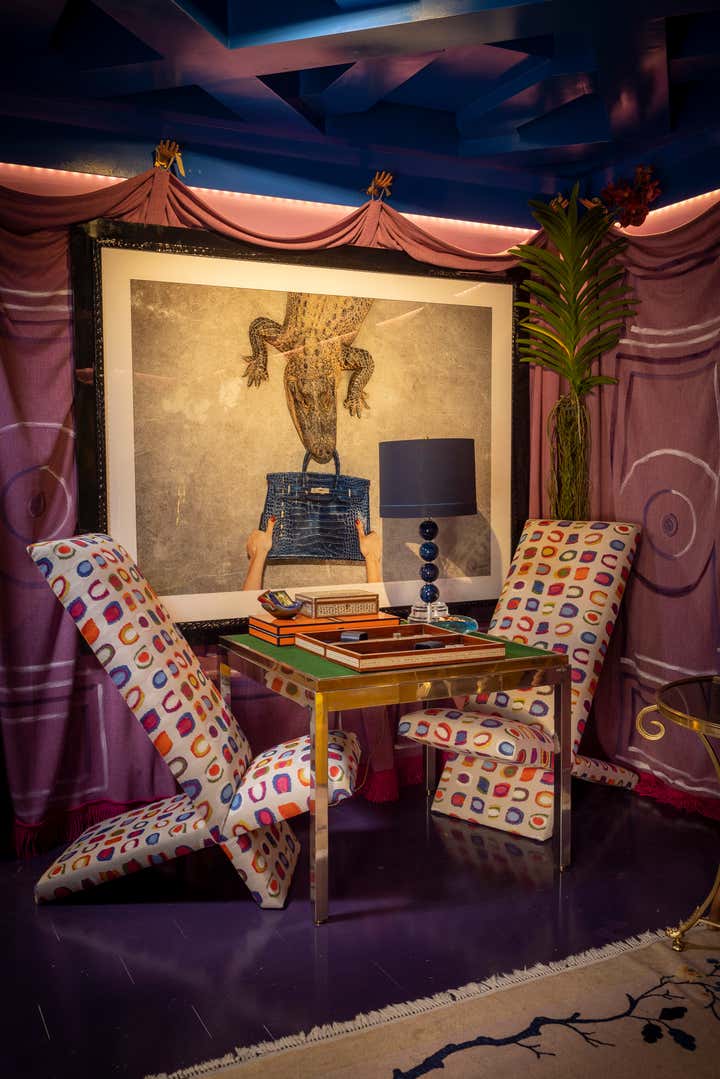 Chris Goddard of Goddard Design Group is bringing the French salon back into decorating parlance with his colorful reimagining of the guesthouse living room. The Arkansas-based designer adored the idea of creating a gathering hub away from the main house dedicated to creativity, fun, and, of course, conservation. “I wanted to take this rectangular box and turn it into something fabulous, a romantic French salon infused with lots of color and energy,” says Goddard.