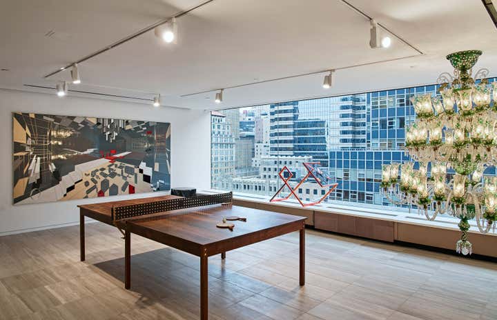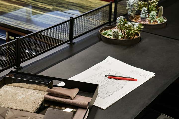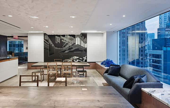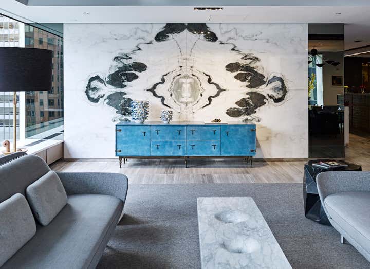 212box is a multi-disciplinary design firm covering architecture and interiors, product design, graphic design, film and animation. Our expertise is in thinking abstractly but holistically, refining the brief, and ultimately manifesting the solution in a deliverable and inspiring package through architecture and narrative. Behind the coded poplar bark door, lies our office, laden with millwork treasures and an opportunity for clients to view our factory of ideas. Three main rooms stretch out to the city cinematic-ally through 25 long, butt-jointed glass windows. The Products Room showcases art in a gallery setting, the work table for assembly of our products doubles as a ping-pong table and the entire room is used to house in-residence artists studios for months at a time. The Conference room becomes a theatrical stage for presentations and boasts a 23 long collaboration between 212box and BDDW - three tables: a Patron s coffee table, a work table for Narration and a work table for Architecture - that transform into one long table used for larger meetings or our Secret Dinner Series (and of course there are nine secret drawers hidden within the table for our induction of KeyMasters for our INTO MYSTERY project). The Living Room has a corner view of the Financial District and more importantly, a Rorschach test disguised in four marble book matched slabs.