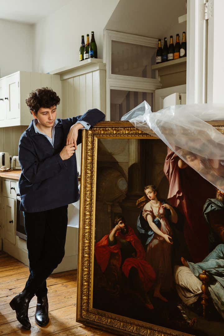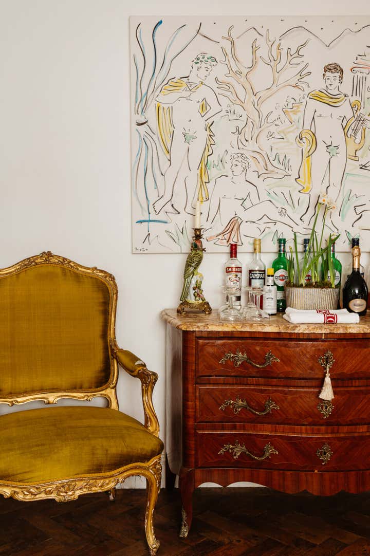 As a groundfloor and basement flat, keeping good natural light was a major consideration. The original shutters were kept free of curtains, with a pale palette chosen for the walls. In contrast, a luxurious touch was added by the use of an 18thC tapestry, silk bed-hangings and de Gournay wallpaper on the wardrobe doors.