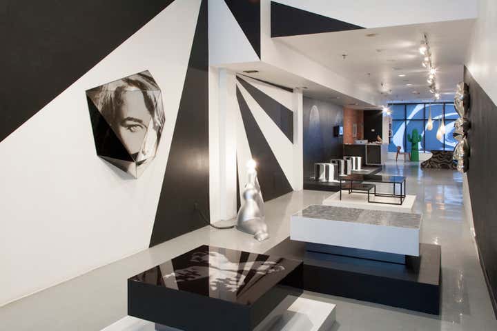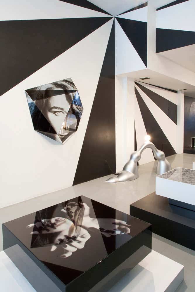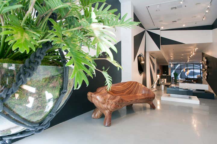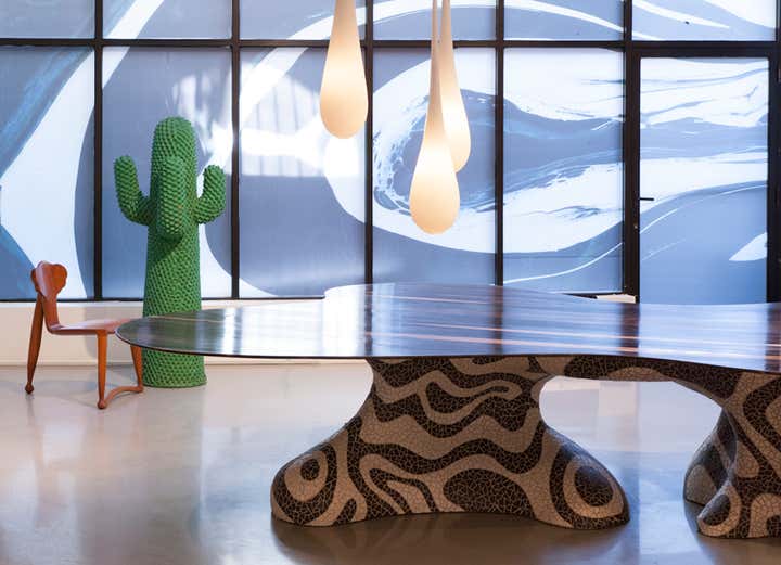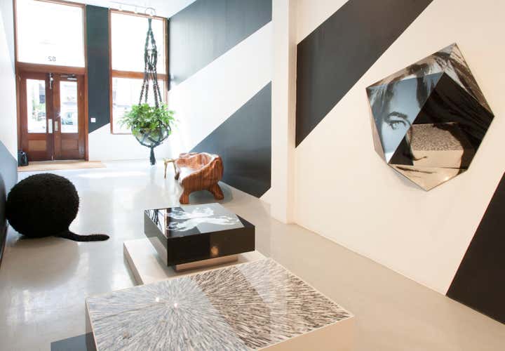 AFTER was an exhibition of contemporary and vintage furniture design that drew inspiration from methods of sampling, appropriation, and deconstruction. The title acknowledged “reference” in ways that are alternately direct, irreverent, poetic and oblique. The work featured selections from R and Co roster by Wendell Castle, the Haas Brothers Oscar Niemeyer as well as collaborations with the collage artists Lola Dupre and Gordon Magnin, fiber macrame artist Sally England, mosaic artist Rhonda Heisler, wood carver Robert Brou, and mixed-media/performance artist Alex P White, who created unique side tables by hand pouring layers of black and white resin.The exhibition included limited editions, unique pieces, several murals and original wallpaper designs. Many of the works can still be found on my 1st Dibs storefront.