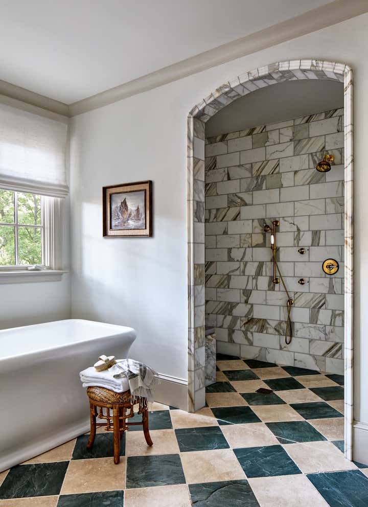Classic architecture, natural stone, and artisanal elements blend seamlessly with a neutral, warm palette in this stunning renovation of a 2005 Craftsman home in North Arlington, Virginia.