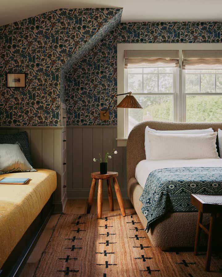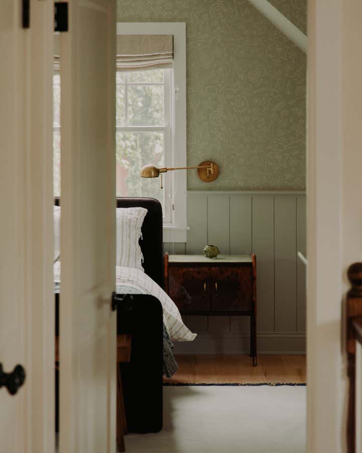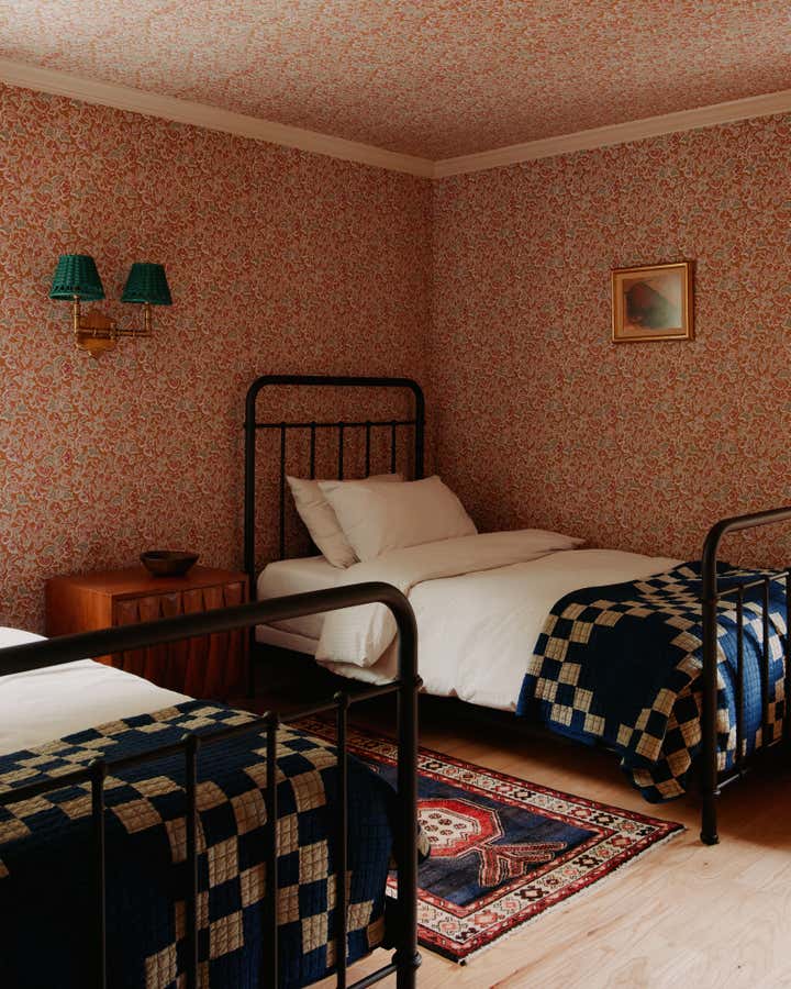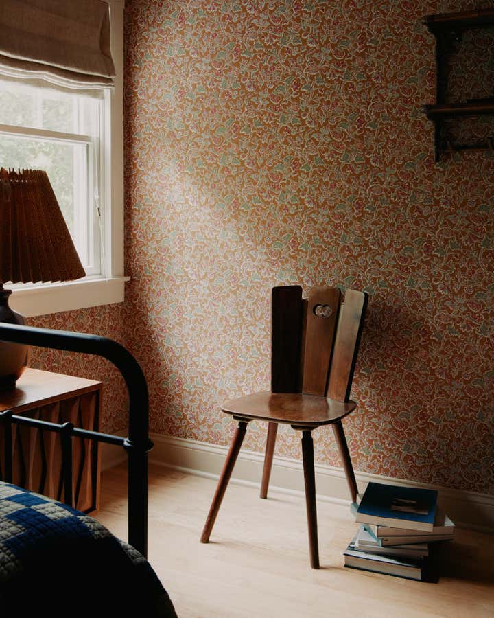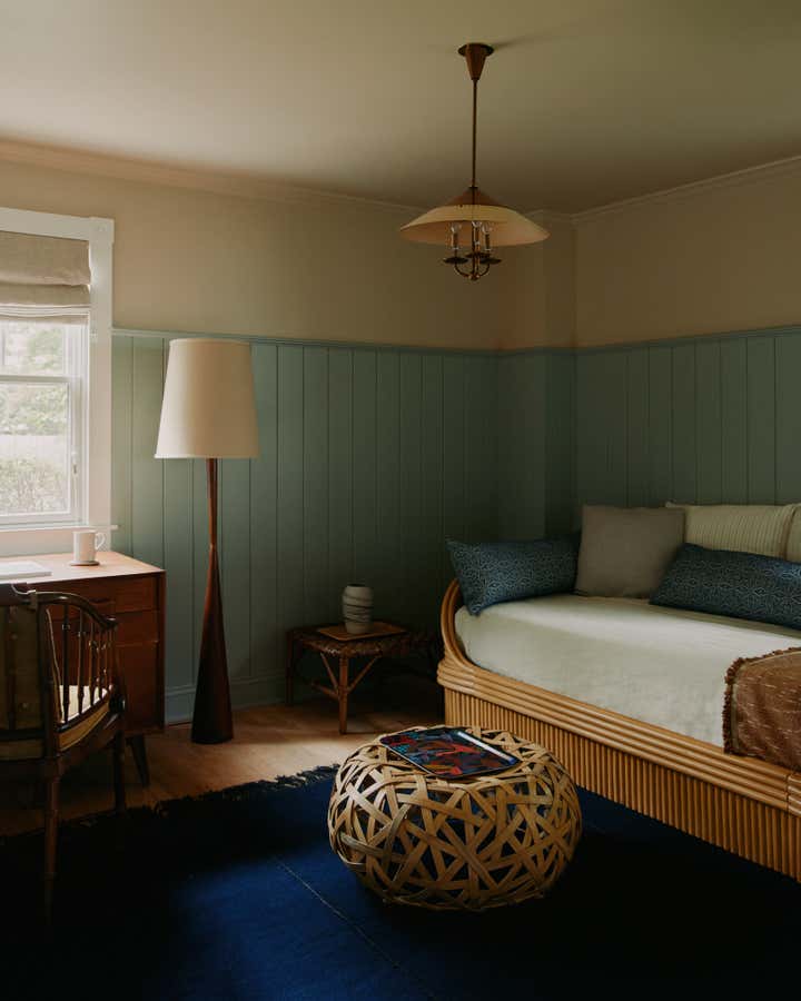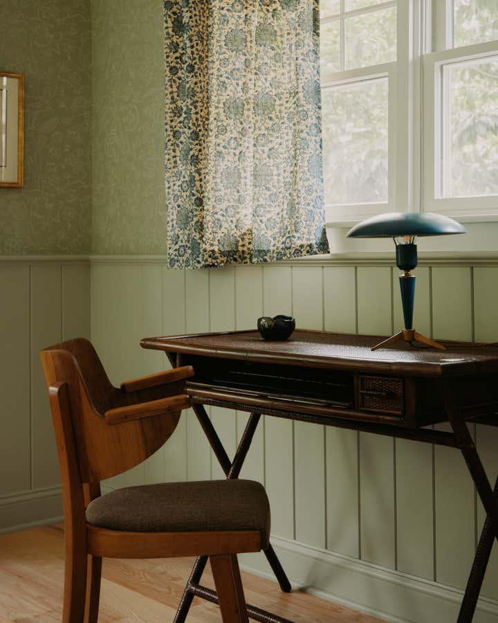 Familiar elements echo through all the rooms in the house weaving a common thread: back on the ground floor, a guest room is papered completely, wall to ceiling, in the most beautiful red floral pattern “Wild Tulip” from Soane, with a green wall sconce hanging above two wrought iron twin beds, completed with indigo quilts and a pair of antique French brutalist wooden chairs. In an adjacent office, wainscotting is treated in color blocks - the plank portion is painted in Benjamin Moore, Pearl and the upper sector in Farrow Ball, “Oxford Stone”, with a 1940s Italian Botanical pendant providing a soft glow for the moody hues.