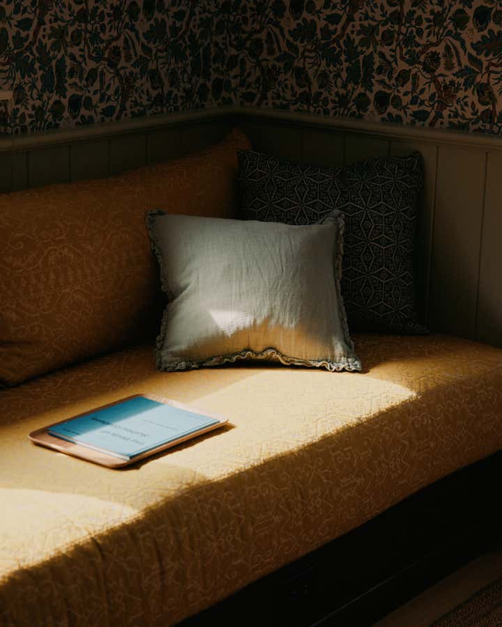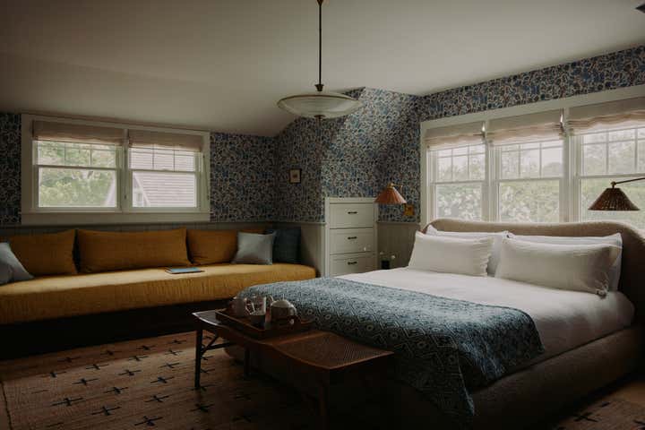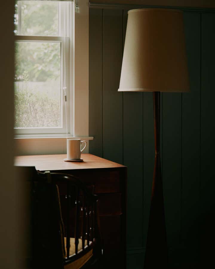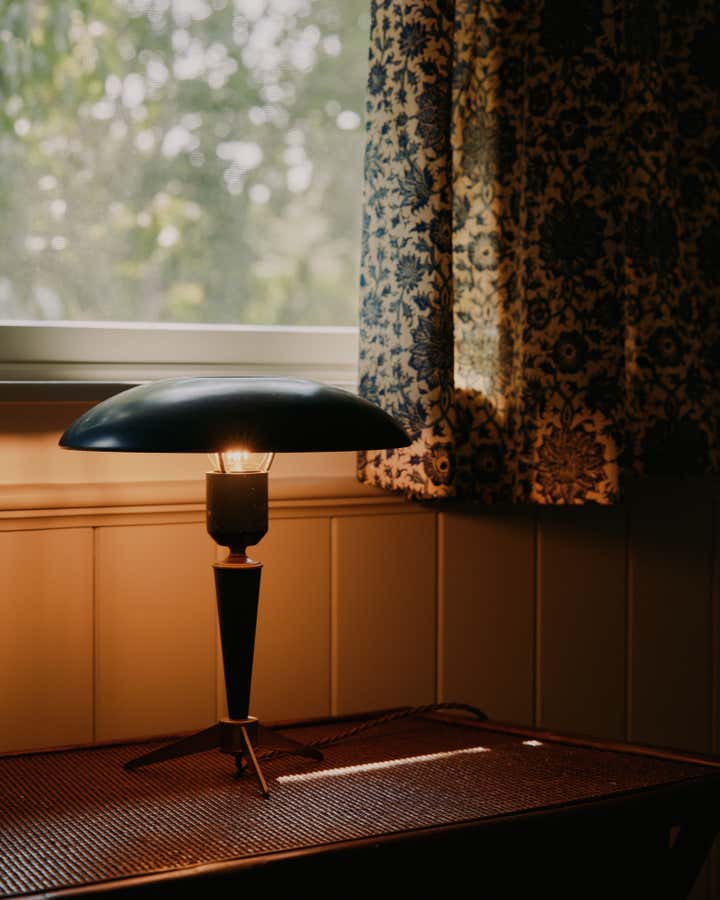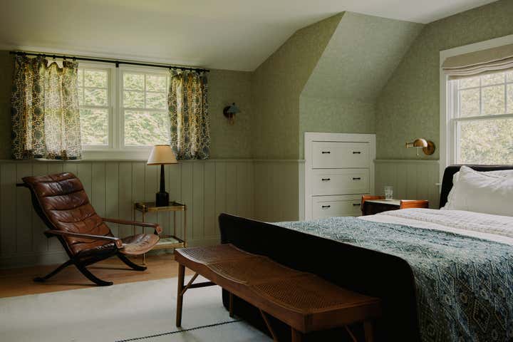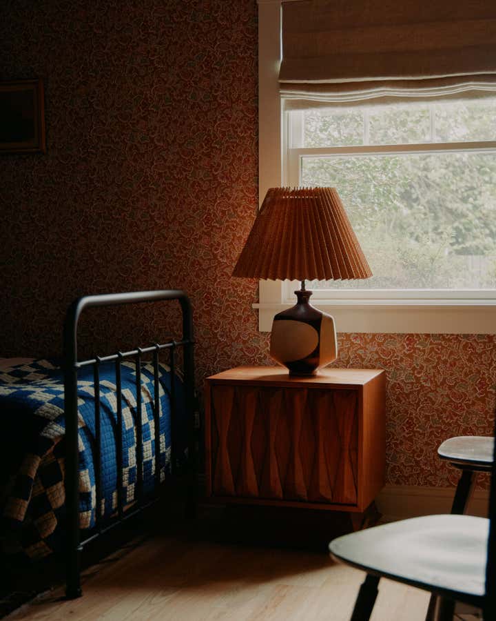 Familiar elements echo through all the rooms in the house weaving a common thread: back on the ground floor, a guest room is papered completely, wall to ceiling, in the most beautiful red floral pattern “Wild Tulip” from Soane, with a green wall sconce hanging above two wrought iron twin beds, completed with indigo quilts and a pair of antique French brutalist wooden chairs. In an adjacent office, wainscotting is treated in color blocks - the plank portion is painted in Benjamin Moore, Pearl and the upper sector in Farrow Ball, “Oxford Stone”, with a 1940s Italian Botanical pendant providing a soft glow for the moody hues.