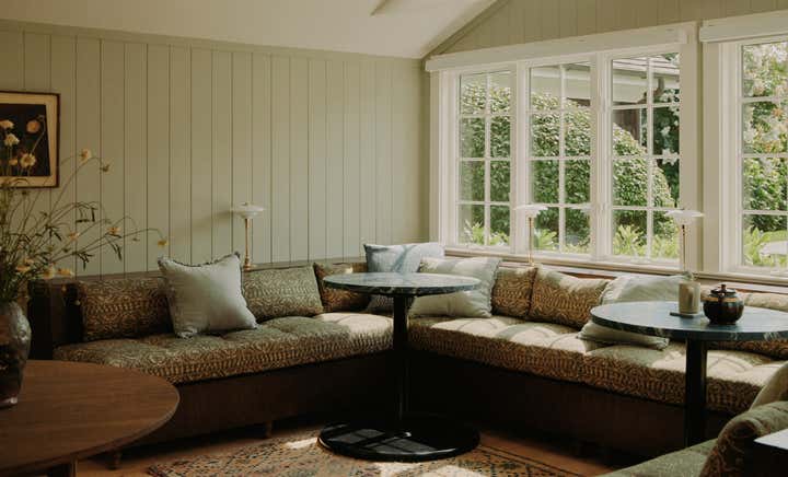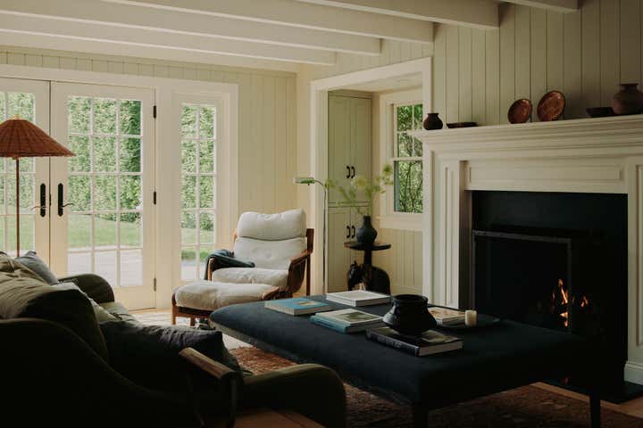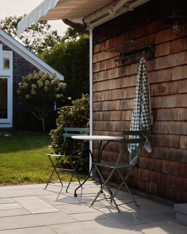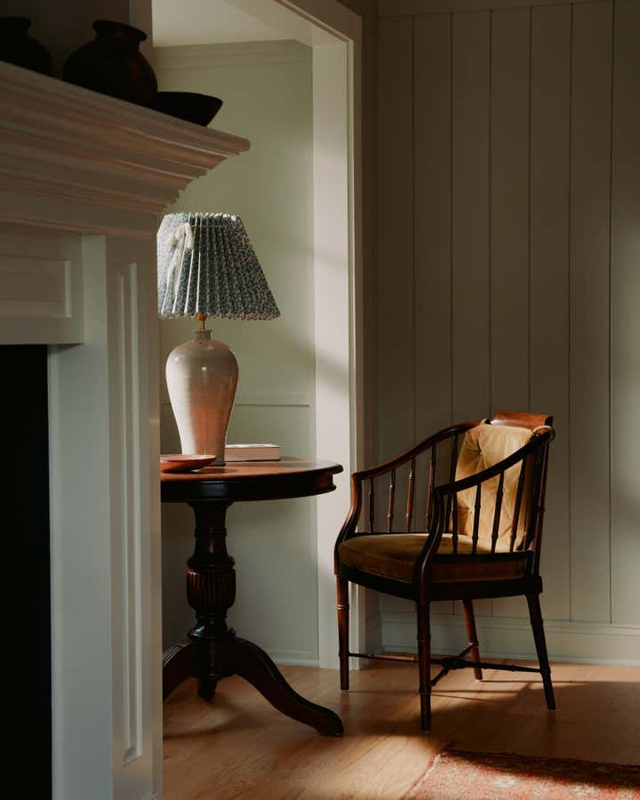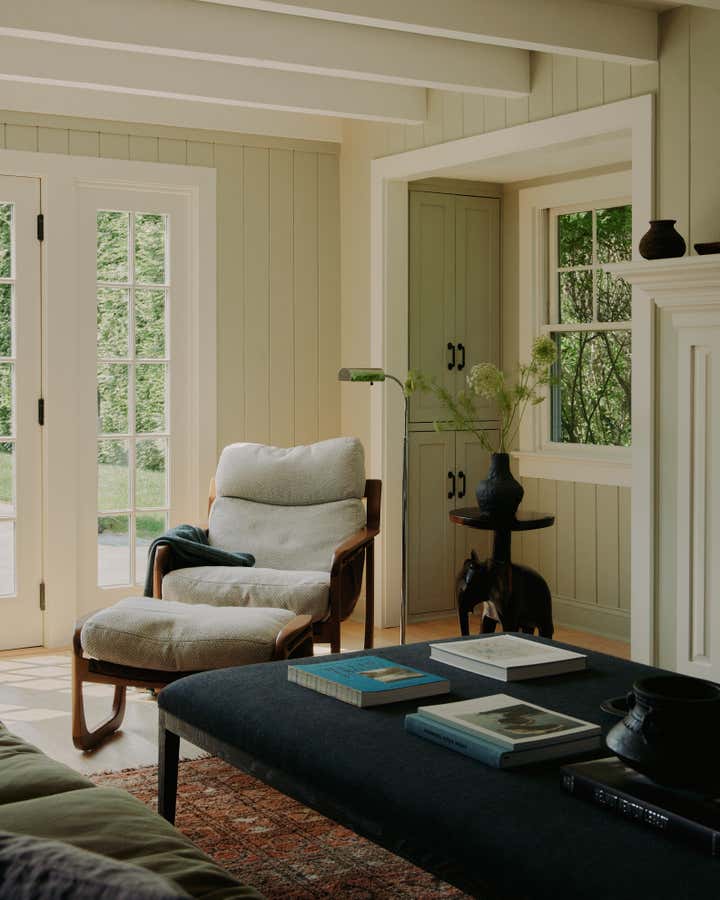 Sitting on an unusually lengthy grassy lot surrounded by towering hedges, this property embodies a quintessential Hamptons setting with multiple satellite structures including a pool house, modern barn and a wellness shed. Built in 1975, the main house is a modestly proportioned shingle style dwelling. Inside, classic wide tongue and groove walls are brought back to the first floor and painted in pale sage, setting the tone of a distinctly cottage aesthetic. In the living room, the lower ceiling with exposed rafters naturally creates a cozy feeling with a fireplace anchoring the space and a set of French doors opening onto the yard. Together, exquisite antiques including an elephant shaped end table carved entirely out of a single piece of timber from Africa and a table lamp made of a chinese porcelain jar in crackle glaze topped with a hand-sewn concertina shade, are mixed with simple upholstery pieces in modern form. Every corner of the room is an intriguing vignette in its own right.