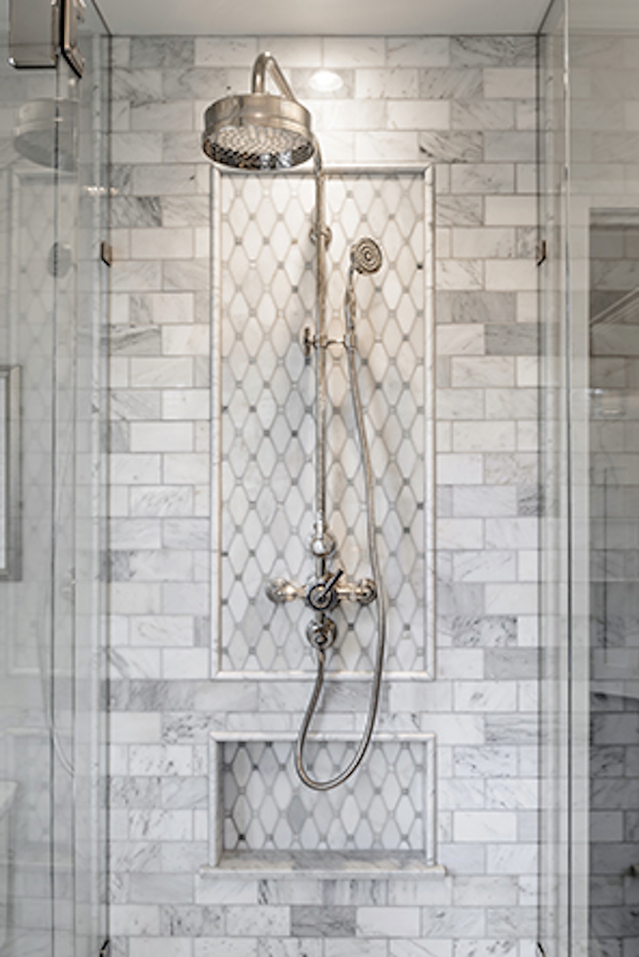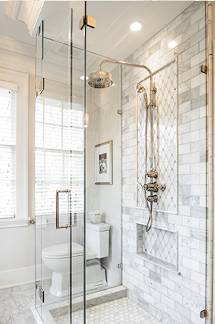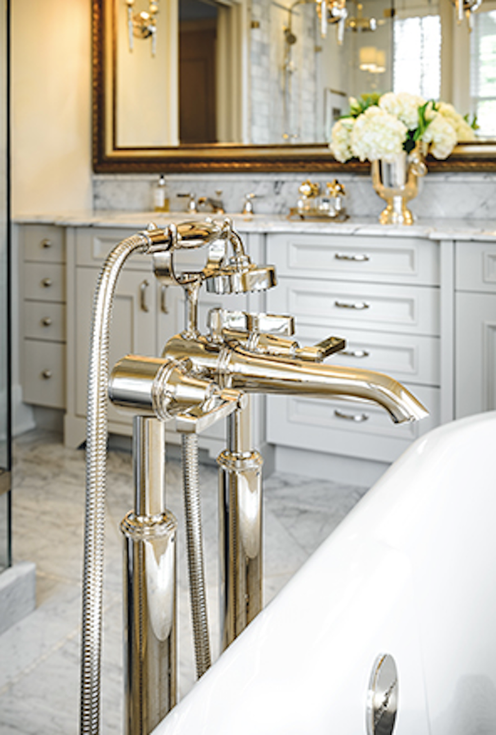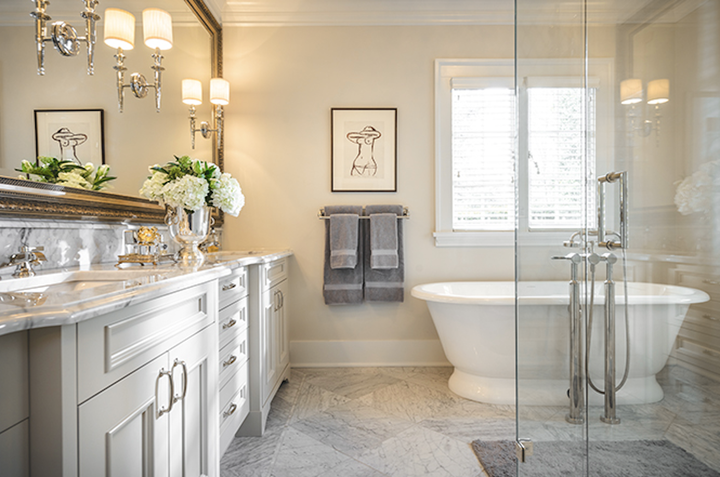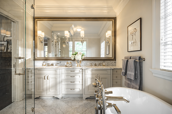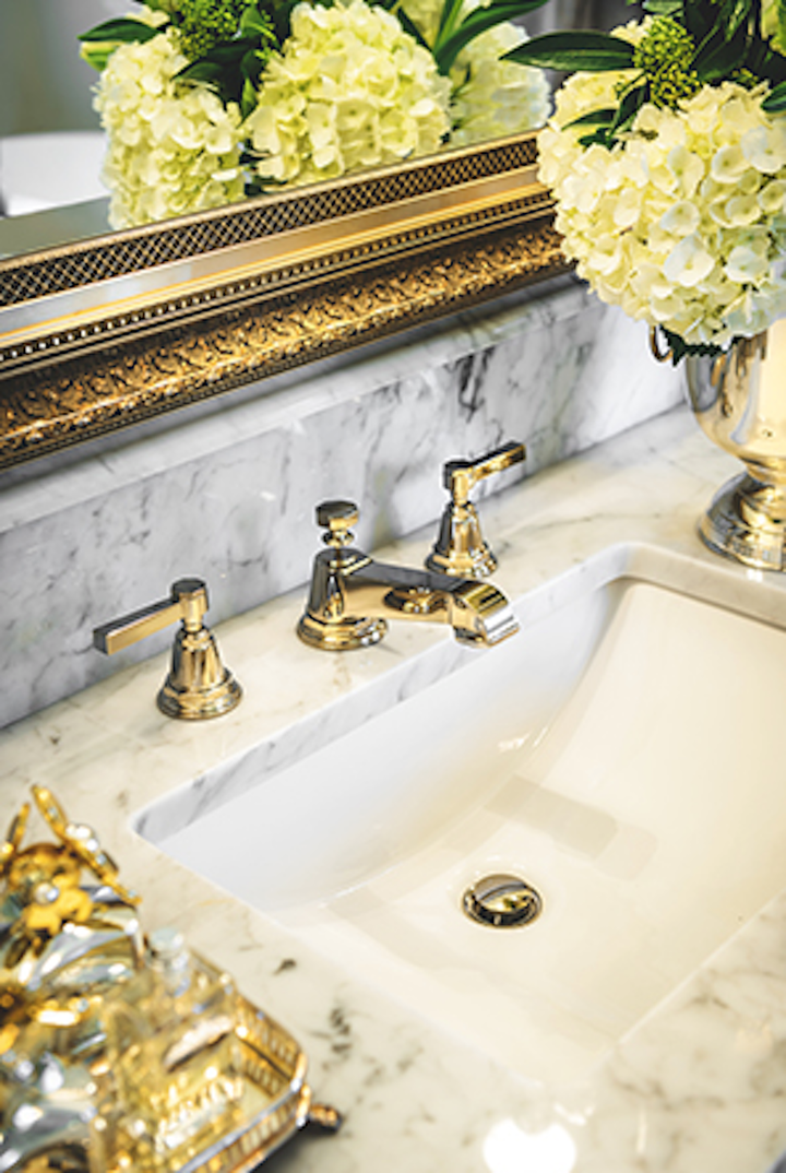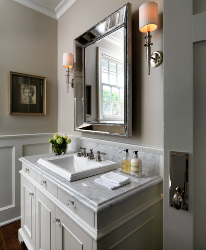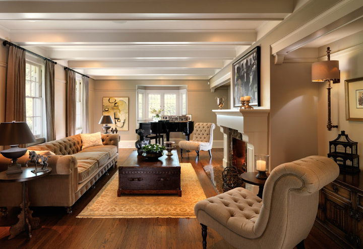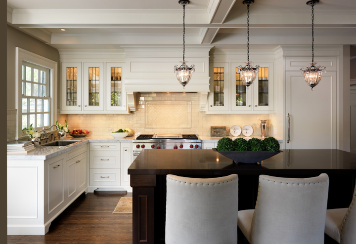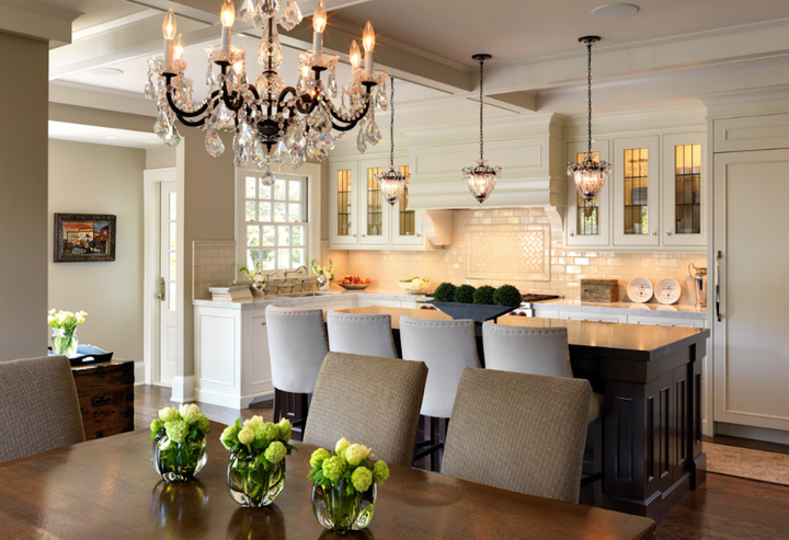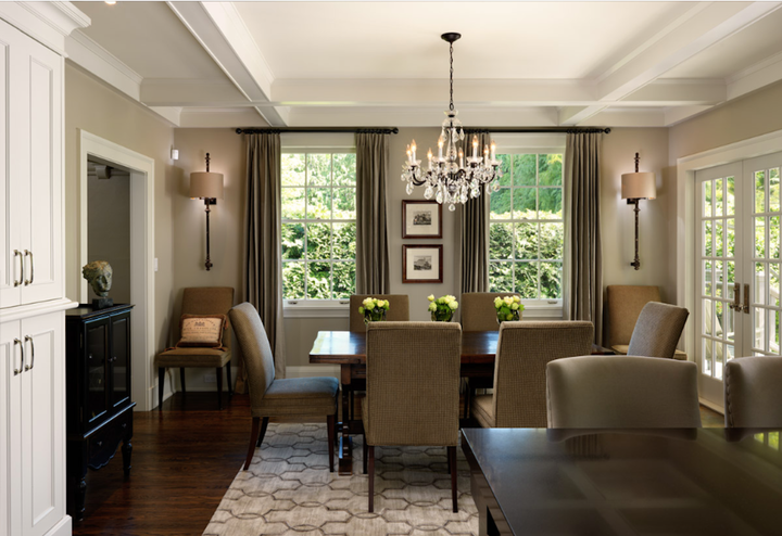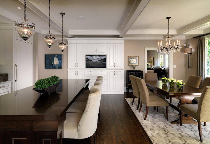 Transitional west coast home. Stunning coffered ceiling with three antique looking pendant lights over the large island. Two toned countertops with large Wolfe cooktop with architectuaral vent hood. White and espresso cabinetry. Chrome faucets with marble countertop and stainless sunken sink. Spacious kitchen and dining area, with large built in cabinets in white to hide the TV. Dark hardwood flooring. Classic dining room with over sized upholstered chairs. Elegant powder room with large mirror and lights on either side and marble countertop with wainscoting on the walls.