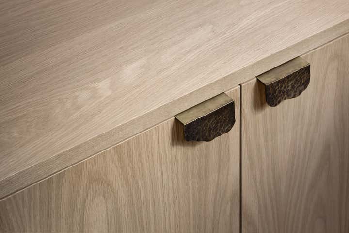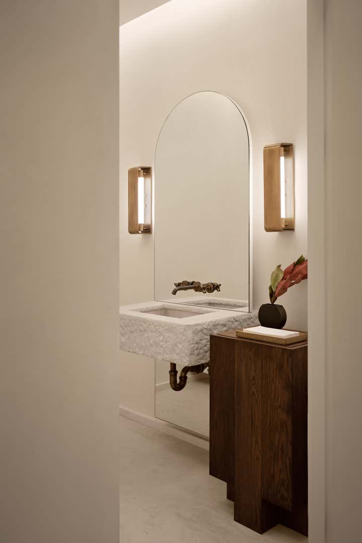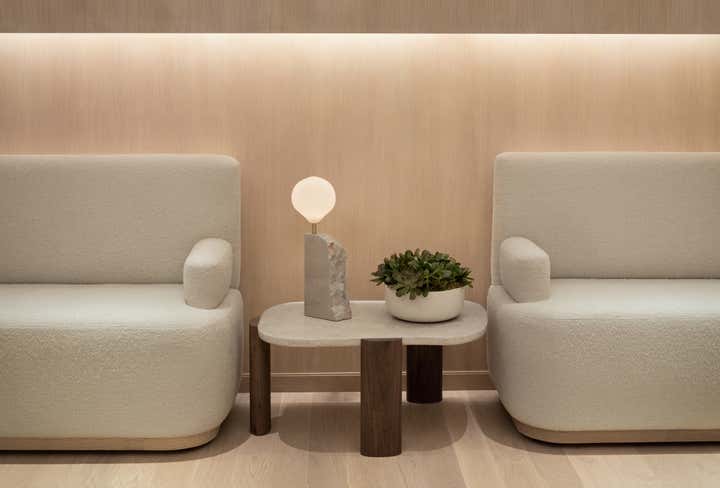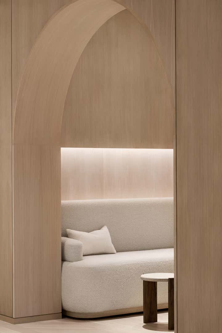 We approached this unique combination through a number of strategies. First, we saw an opportunity in creating a central element that would invite visitors into the space. We worked with a local millworker to clad the space’s existing steel support columns in white oak paneling to form a colonnade whose arches mirror the windows of the building’s facade. In addition to functioning as an introduction for incoming visitors, the colonnade subdivides the elongated space into a series of intimate rooms or “nests” where salespeople can have more direct and personal conversations with visitors or where private consultations can take place.