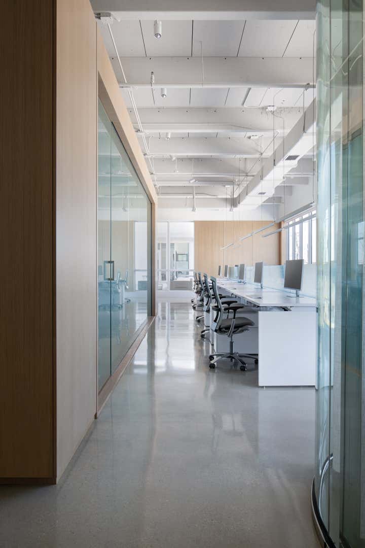Two smaller private offices sit in opposite corners of the office. Their glass walls are gently curved to encourage more fluid circulation in between their perimeter and the sharp corners of the conference room. The radius of the curved glass walls in each private office is replicated throughout the space – gentle little ripples that offer a quiet reminder of this unique detail. Visitors may notice the same curvature in the custom-designed lozenge-shaped coffee table made from travertine in the rear lounge. A similar rounded edge is seen in the travertine top crafted for the credenzas in the private offices, custom oak pieces we designed and had fabricated by our millwork partner in New York.