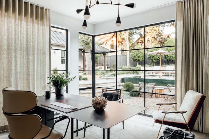 When our dear past client told us they were moving from California to Austin, TX and asked if we would help design their new home, we gladly hopped on a plane and embarked on a three year-long design adventure! The complexity of the project required many trades s talents and expertise, and while this was truly the work that took an entire village the bulk of the burden was carried by Risinger Build, under the watchful eye of Kyzer Construction, and with the help of Austin s finest pool landscaping expert Designecology. The task at hand was least to say AMBITIOUS and it included a total transformation of a generic, builder-grade development property to an exquisite all-custom home that radiates with old world Flemish charm. Clustered around an emerald green pool, paved with amalgam of reclaimed stones brought from Europe and encircled within lush gardens (that feel as if they were there for decades), this home is an oasis of privacy that celebrates the marvelous connection between the indoors and the nature that surrounds it. Even though the design of the home took as much time as the design of the outdoor spaces and surrounding landscape, it was impossible to touch one without the other. In order to seamlessly blend indoors and outdoors, drastic changes were made to the existing layouts and we relied on the use of custom Riviera Bronze metal doors windows to add expansiveness and light to the space. Bespoke, custom designed furniture and lighting fixtures, coupled with carefully curated materials that celebrate materiality as much as the hand of the artist have been used throughout the interiors in order to create a layered, texture abundant, inviting ambiance.