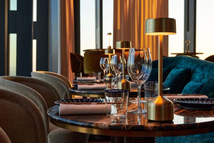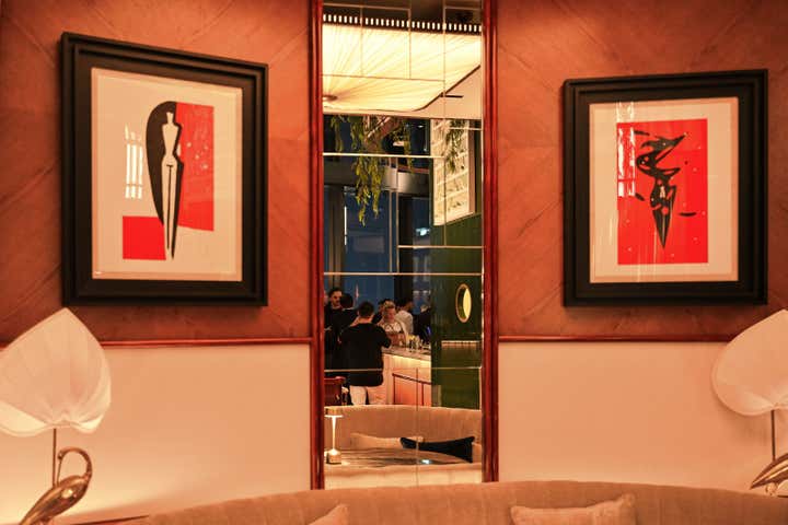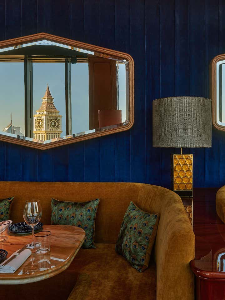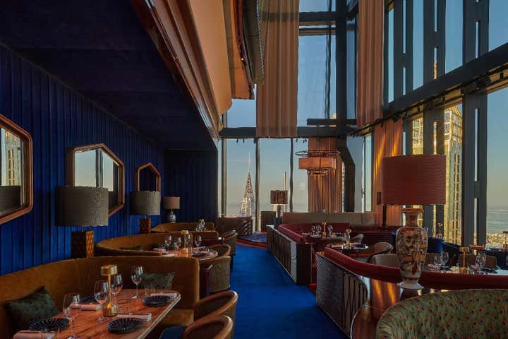 Bar des Prés in Dubai blends French "savoir-faire" and Asian finesse with the city’s vibrant energy. Sinuous lines and Art Nouveau-inspired green velvet lead from the lounge to a wooden bar with marble top. Bistro tables, sofas, and intimate lighting echo bar materials, while high-ceilinged dining spaces feature sushi bars, sculptural lamps, caramel and amber seating, and Klein blue velvet walls. A VIP platform with gold-flecked carpets and organic sofas creates an exclusive retreat, making the interior a seamless harmony of elegance, colour, and culture.