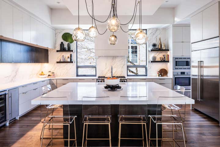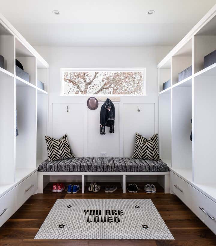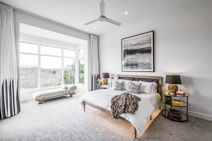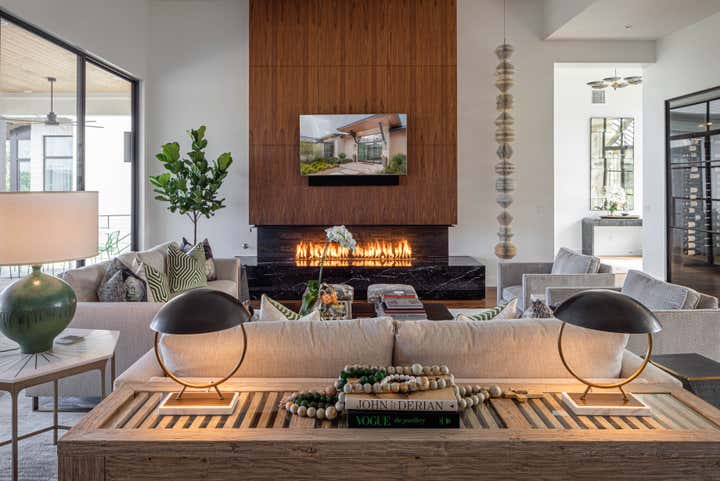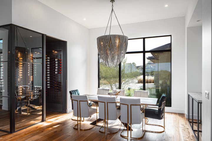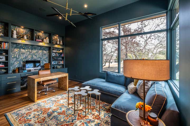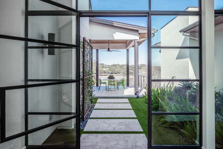 Modern, expansive upside-down style home overlooking a golf course in the hill country. This 5 BR, 4.5 bath house includes a private master suite wing and a downstairs area for the kids rooms bunk room. Tall, floor to ceiling windows and glass doors open up the space and fill it with natural light. Featured on the 2020 Austin Modern Home Tour.
