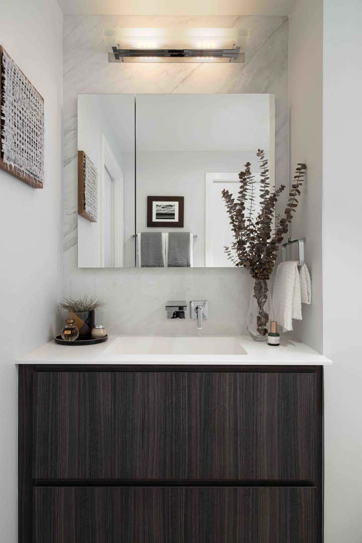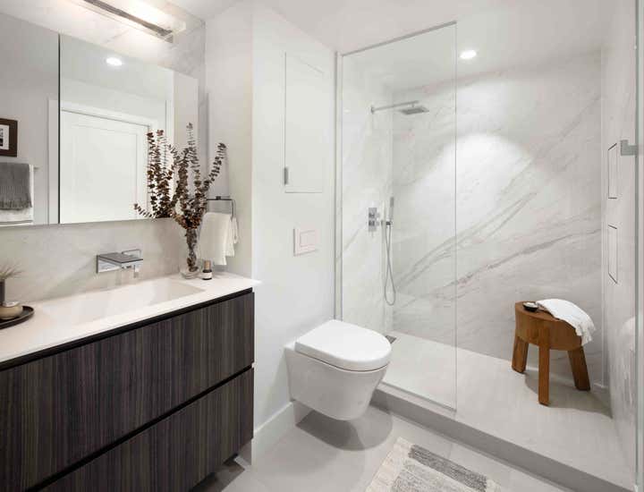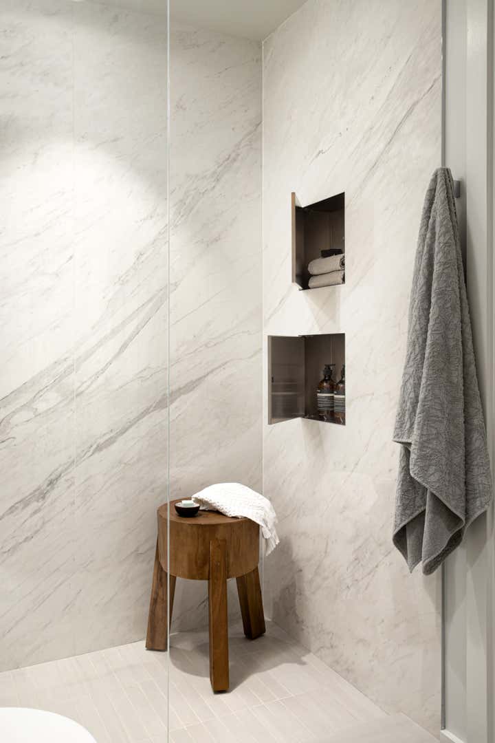 A spa-like primary bathroom was the request from our client so we delivered with slabs of porcelain, new fixtures, soft modern lighting, and hidden niches for storage.