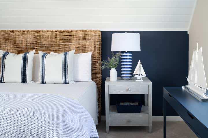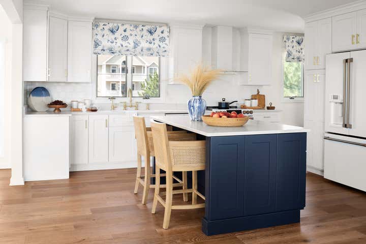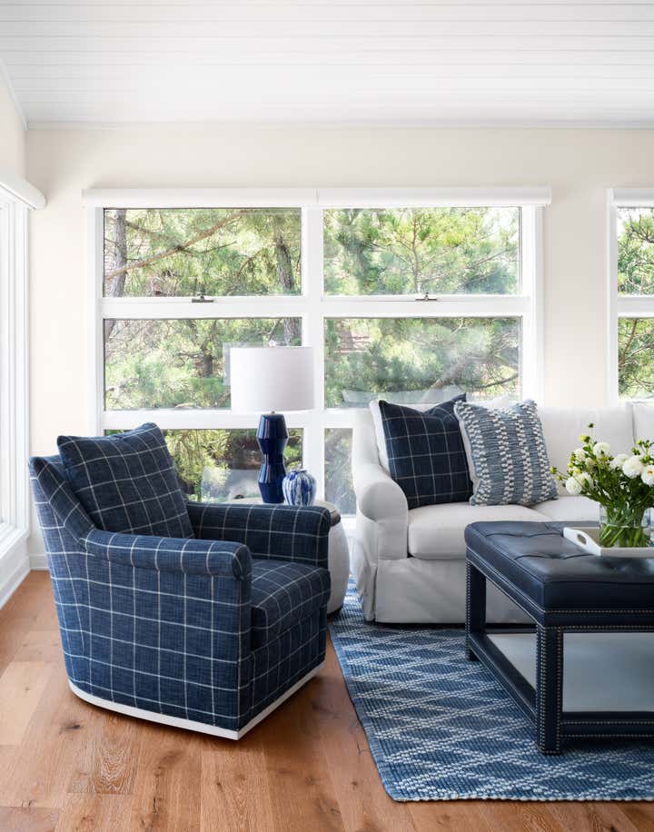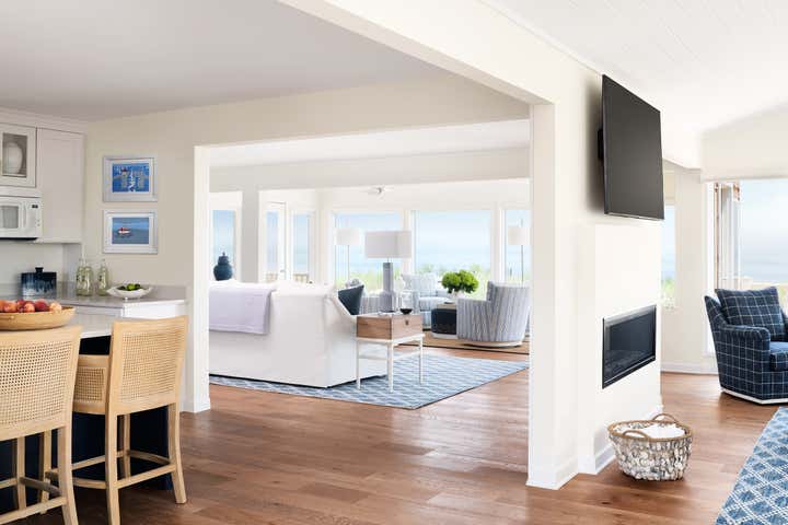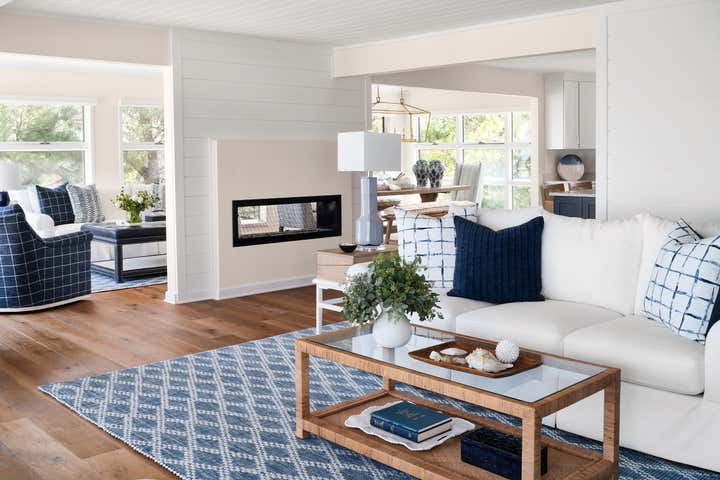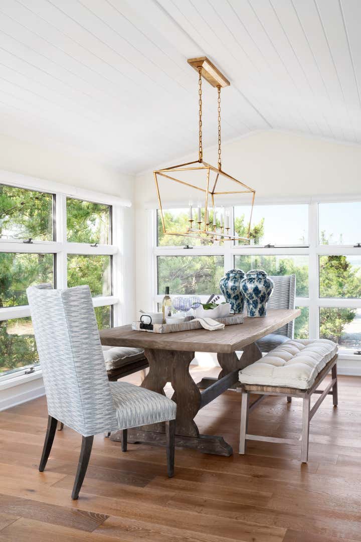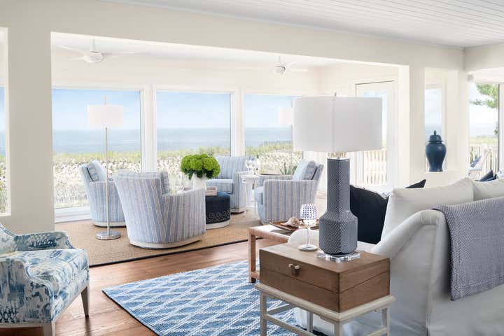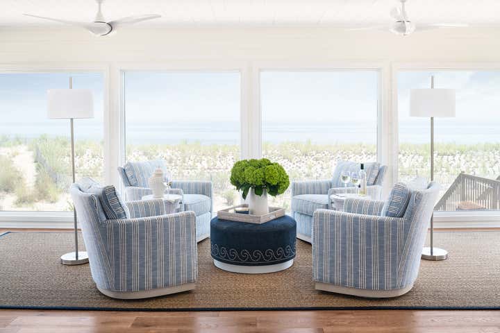 We tackled the top-to-bottom redesign of this Delaware beach house with two goals in mind: create an elegant, comfortable retreat and maximize the stunning water views. Mission accomplished! Lead designer Leigh Mayhew used a classic coastal color palette of blue, white, and sand. The wood floors and accent pieces bring warmth to the space. The finished result is a beautiful home in harmony with its beachfront setting.