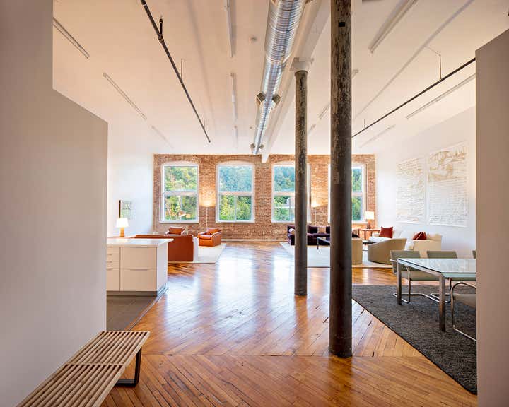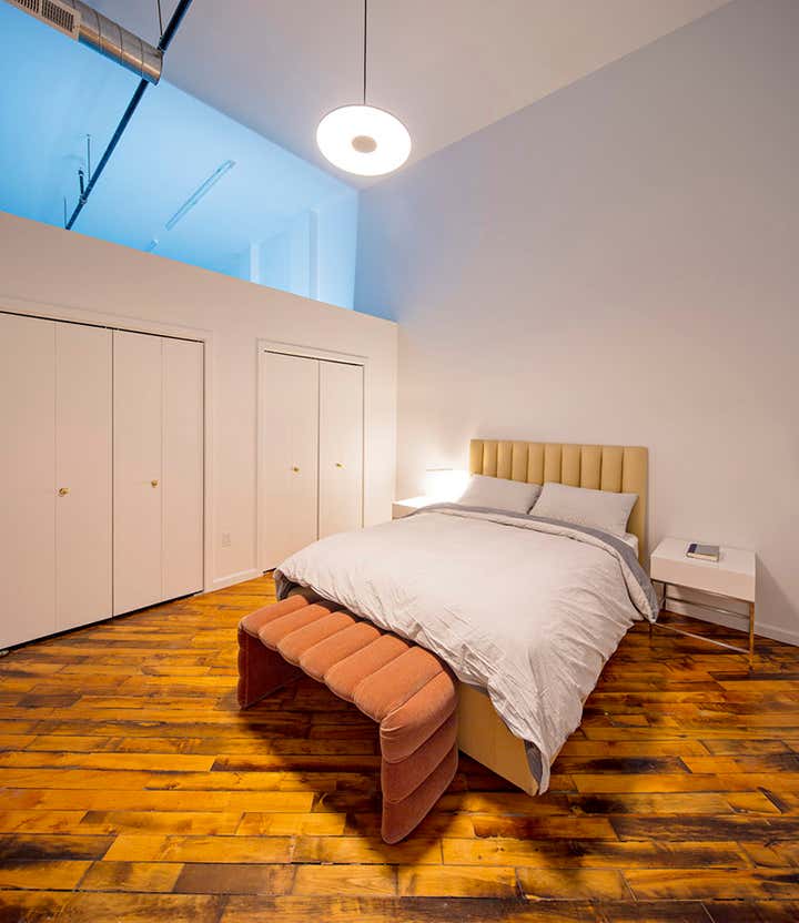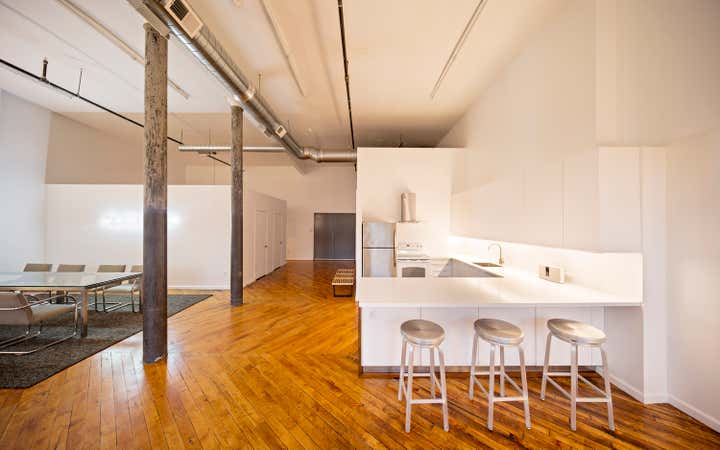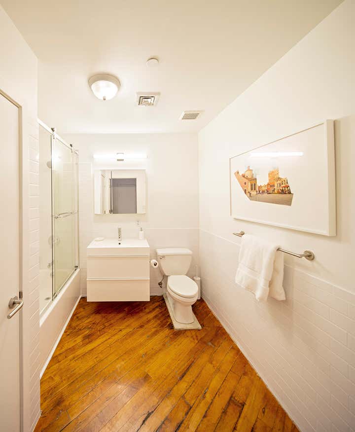 The renovation and refurbishment of this rental unit had to deal with a very low budget so we had to focus on upgrading the bare minimum to make the space livable. The program required a live/work space with the intent of having receptions and art presentations, hence the conversion of a one bathroom into a bathroom and powder room. With the idea of a public space in mind, we decided to have the kitchen at the center of the open space, and we put the effort on a generous white countertop. Most of the furniture was recycled from an Estate Sale, and in order to control expenses we decided to maintain the existing lighting except for two accent fixtures (one in the bedroom and one in the kitchen). The rest of the project included upgrading the existing bedroom and bathroom and providing maximum surfaces for art display.