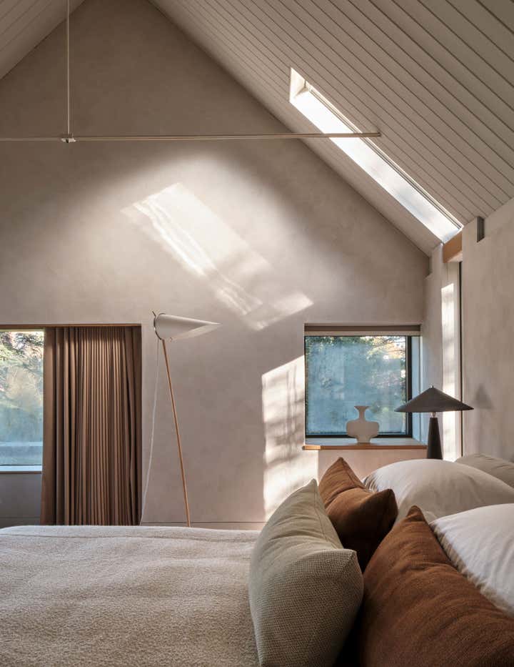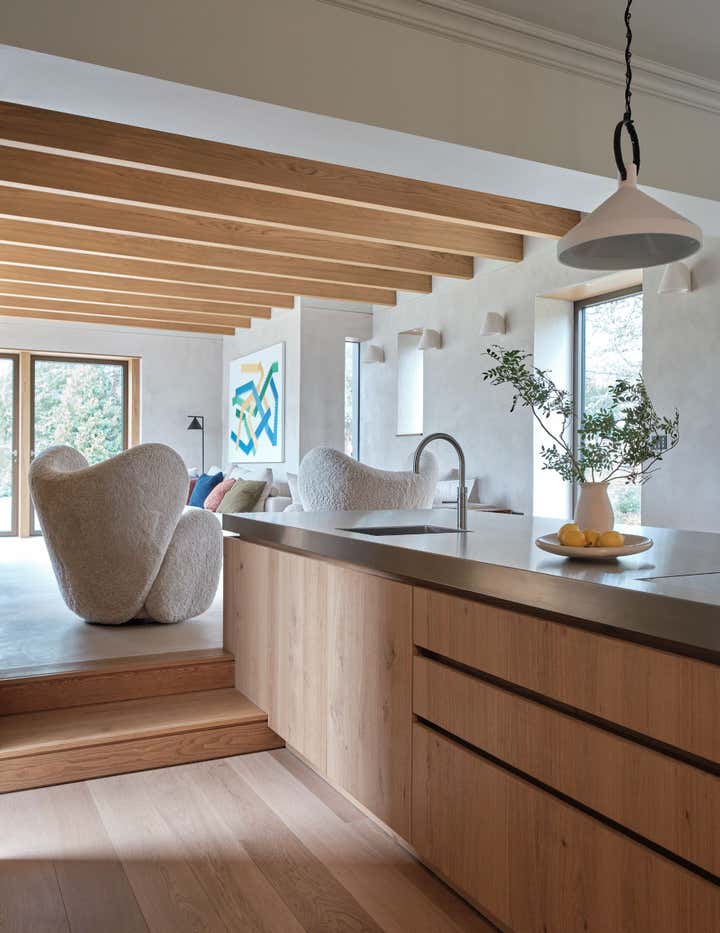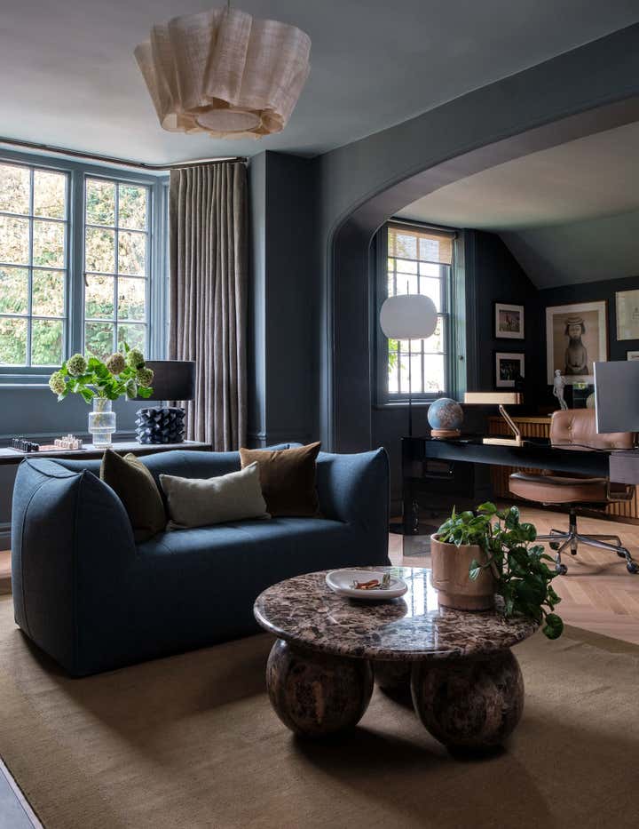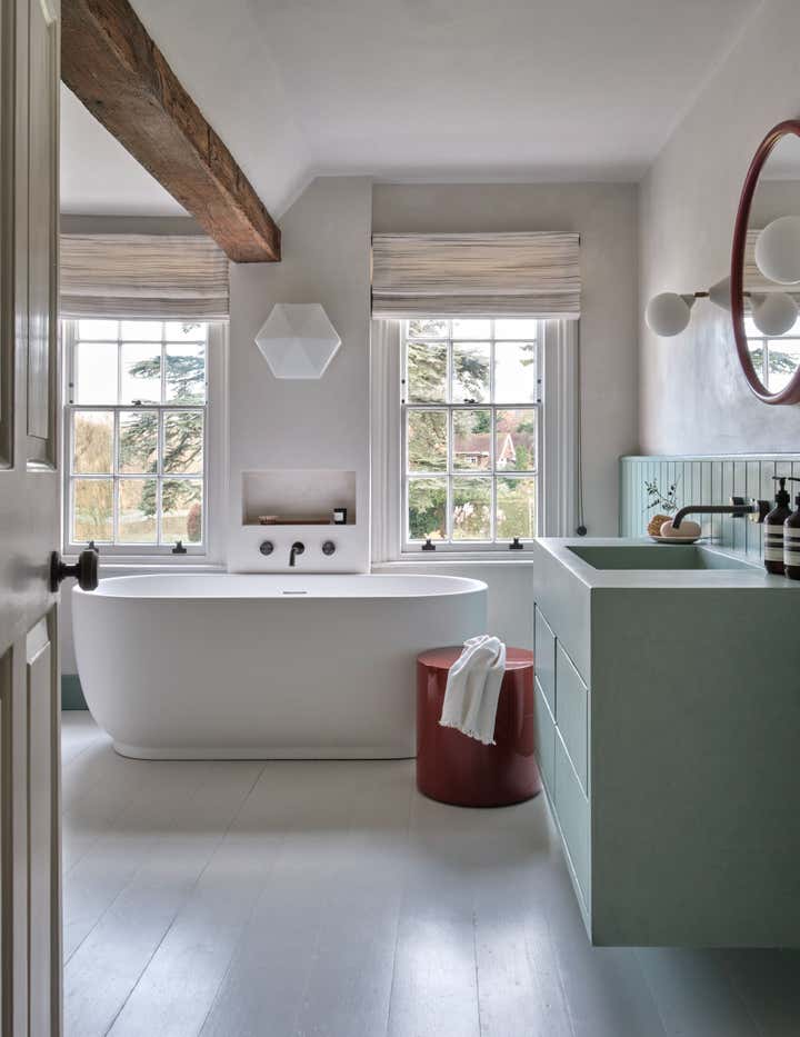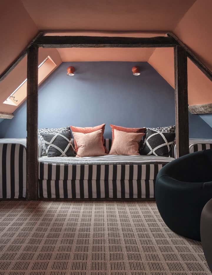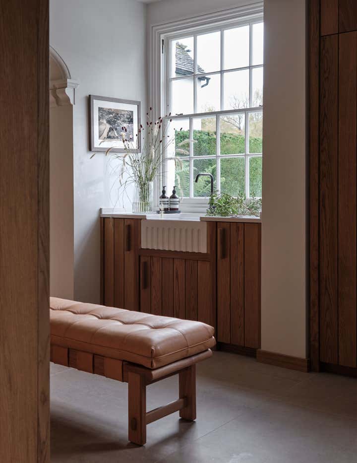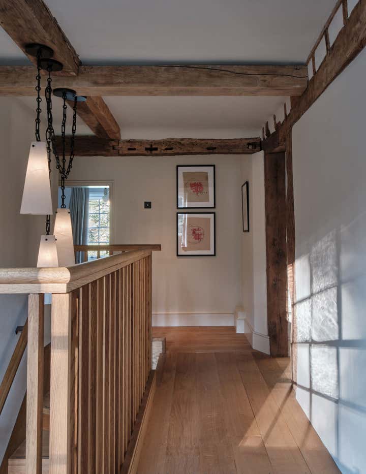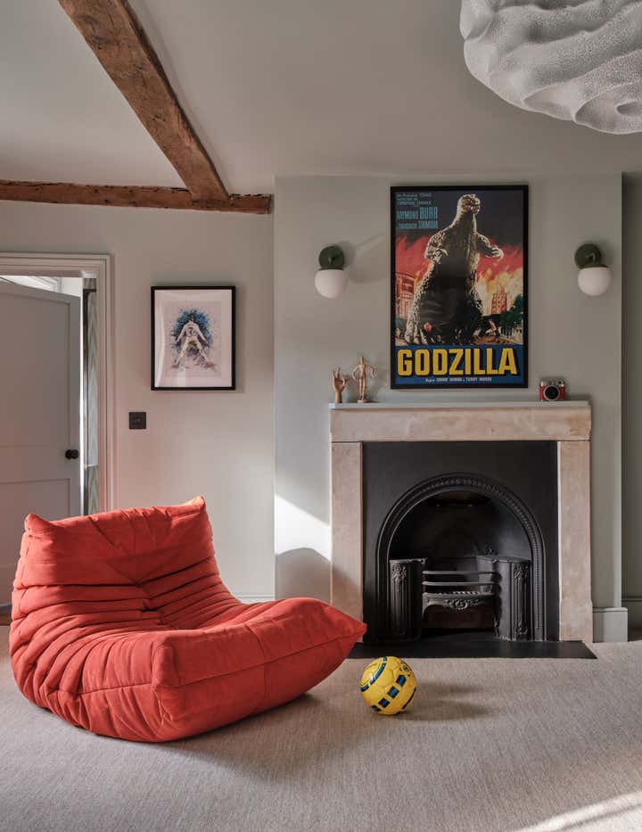 Historic 15th century Berkshire home reimagined for 21st century family life Once owned by Queen Elizabeth I and occupied by the same family for over 300 years, this stunning riverside home was a mouthwatering commission. Working in close collaboration with its new owners and their architects, we brought a simple, elegant interior vision to life. The family wanted a liveable space, so with 3 boys sharing the house with mum and dad, open plan was definitely off limits. Four very individual bedrooms gave the boys their own zones to be themselves – to be noisy without impinging on the rest of the house. Those other rooms – for dining, cooking and relaxing – have a peaceful, relaxing colour palette and smooth materiality. We upholstered soft, sumptuous seating in muted colours and specified pale wooden floorboards in reception rooms in the new extension and an oak herringbone hallway floor for the original part of the house. It’s in that space that the interior design language is established – a statement of restrained taste, with a statement contemporary table to balance the vintage tapestries inherited with the house. The minimal aesthetic is echoed throughout the ground floor – soft, neutral tones when relaxation is the priority, with darker, brooding shades demarcating the cinema room and office. We designed and handcrafted much of the home’s furniture and soft furnishings and specified statement lighting throughout. Upstairs, the boys’ bedrooms are subtly different, yet each maintains the home’s simple, pared back style, with traditional features retained to provide a backdrop for modern colours, textures and storage solutions. The family bathroom also features a stunning storage unit, created by the talented contractors, who sealed the units with micro-cement. Glance up as your wander through this landmark home and you’ll see the original beams, still doing their job, while looking fabulous doing it. These were sand blasted to reveal their original glory.