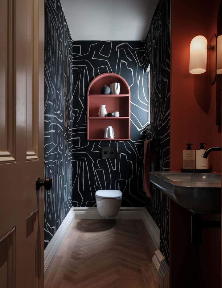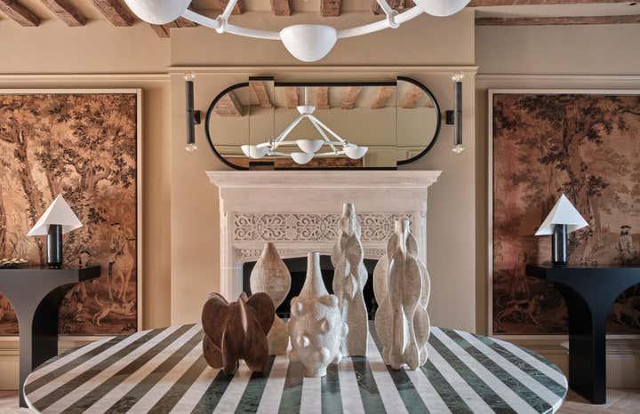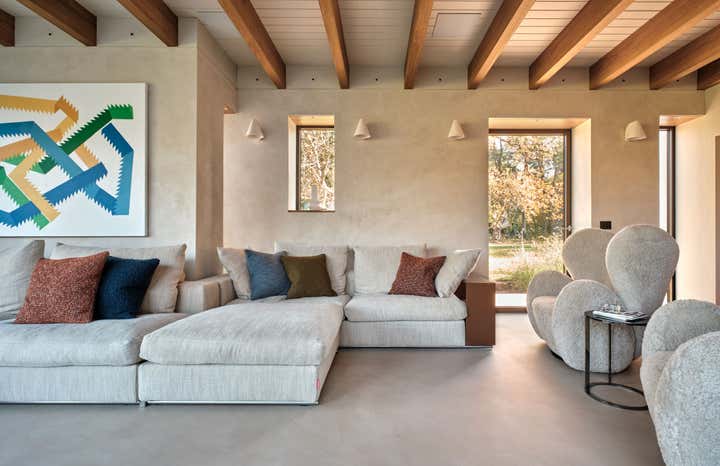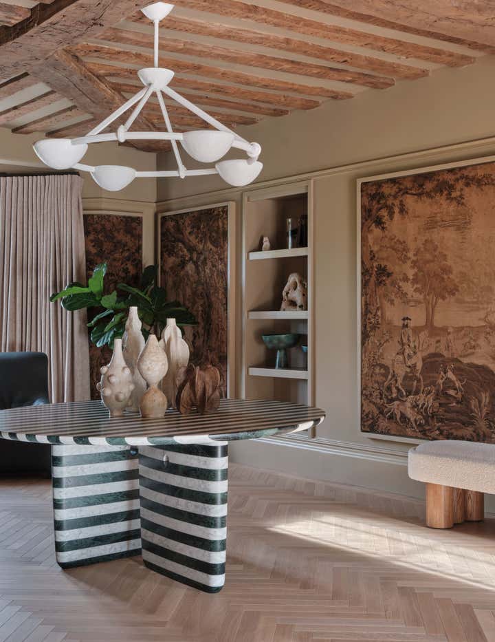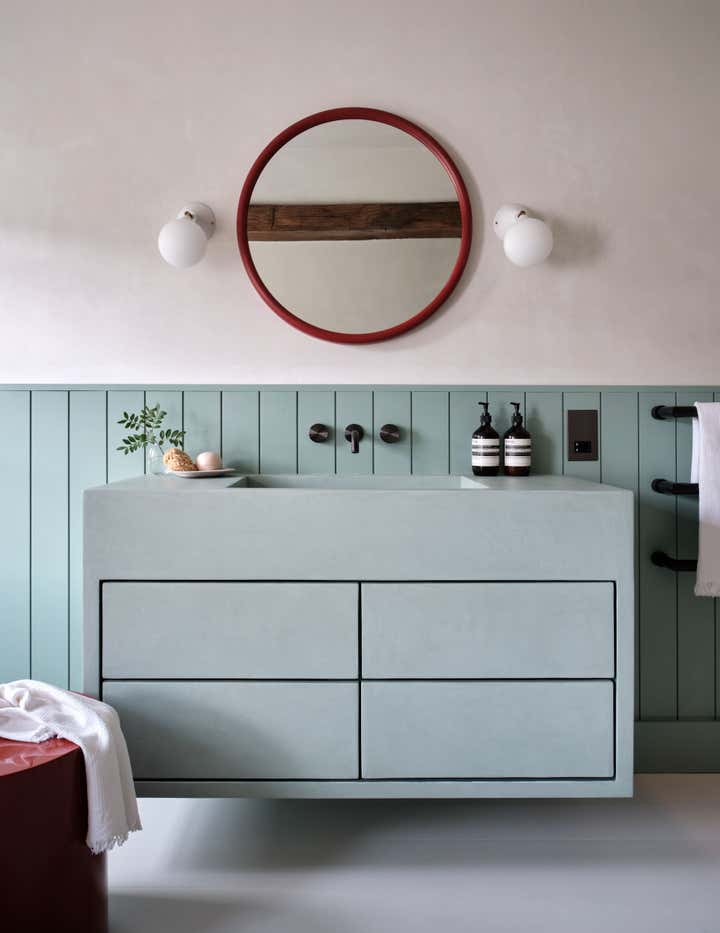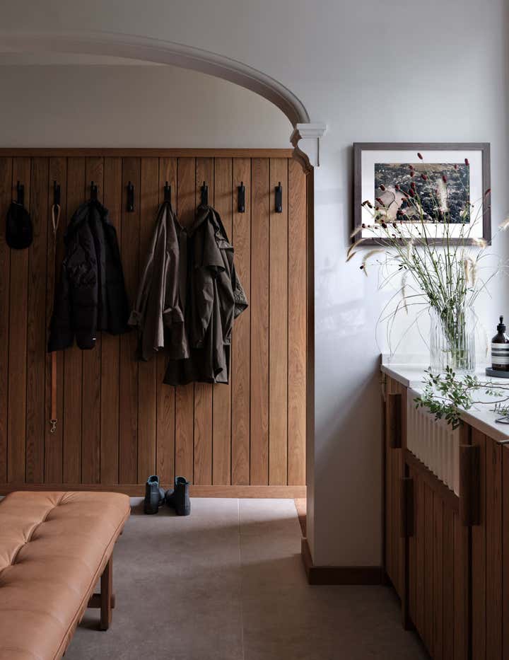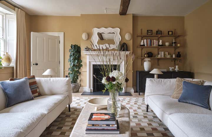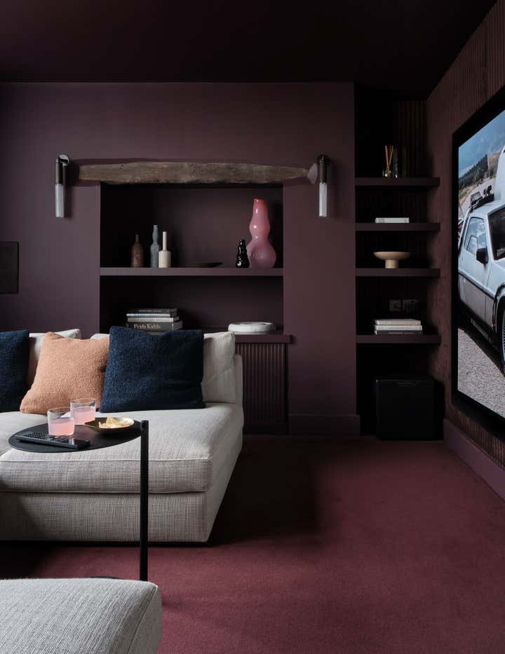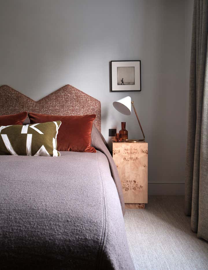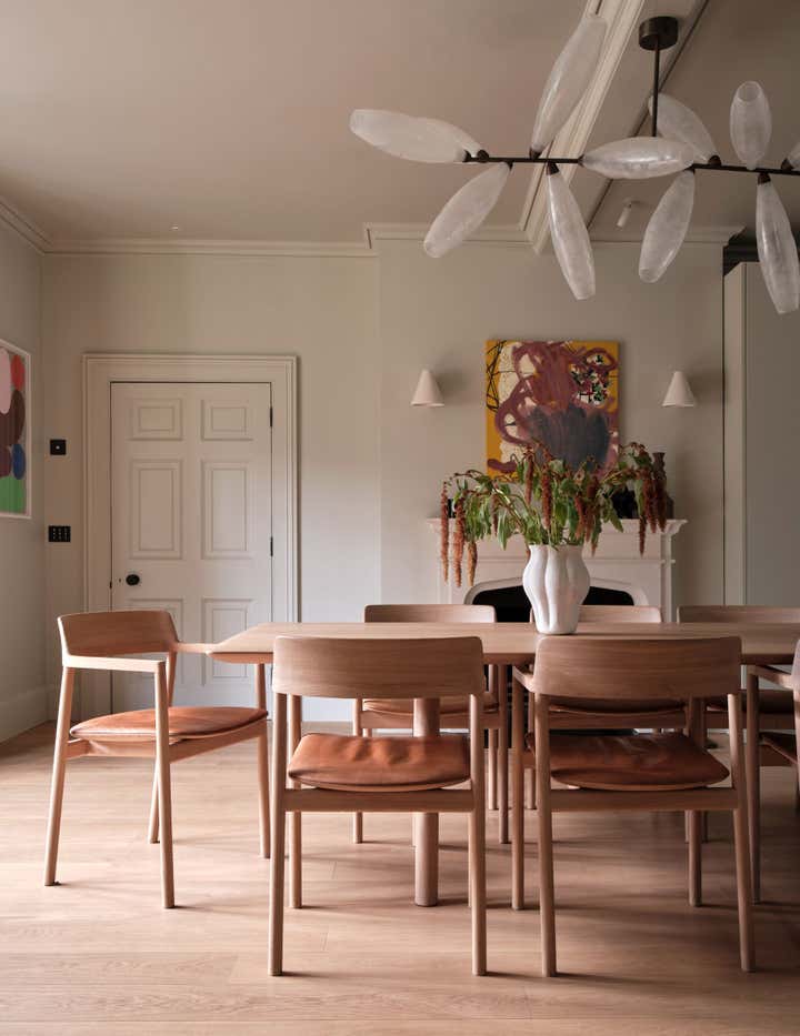 Historic 15th century Berkshire home reimagined for 21st century family life Once owned by Queen Elizabeth I and occupied by the same family for over 300 years, this stunning riverside home was a mouthwatering commission. Working in close collaboration with its new owners and their architects, we brought a simple, elegant interior vision to life. The family wanted a liveable space, so with 3 boys sharing the house with mum and dad, open plan was definitely off limits. Four very individual bedrooms gave the boys their own zones to be themselves – to be noisy without impinging on the rest of the house. Those other rooms – for dining, cooking and relaxing – have a peaceful, relaxing colour palette and smooth materiality. We upholstered soft, sumptuous seating in muted colours and specified pale wooden floorboards in reception rooms in the new extension and an oak herringbone hallway floor for the original part of the house. It’s in that space that the interior design language is established – a statement of restrained taste, with a statement contemporary table to balance the vintage tapestries inherited with the house. The minimal aesthetic is echoed throughout the ground floor – soft, neutral tones when relaxation is the priority, with darker, brooding shades demarcating the cinema room and office. We designed and handcrafted much of the home’s furniture and soft furnishings and specified statement lighting throughout. Upstairs, the boys’ bedrooms are subtly different, yet each maintains the home’s simple, pared back style, with traditional features retained to provide a backdrop for modern colours, textures and storage solutions. The family bathroom also features a stunning storage unit, created by the talented contractors, who sealed the units with micro-cement. Glance up as your wander through this landmark home and you’ll see the original beams, still doing their job, while looking fabulous doing it. These were sand blasted to reveal their original glory.