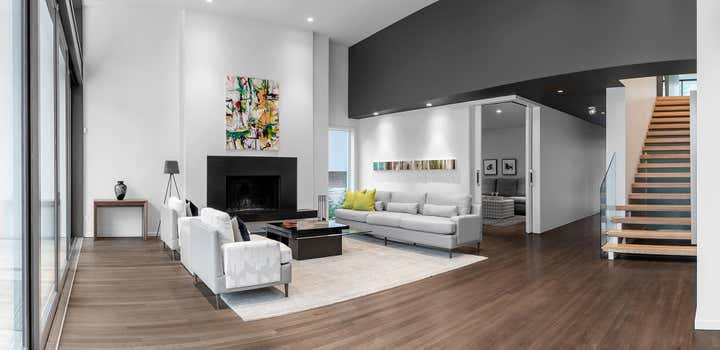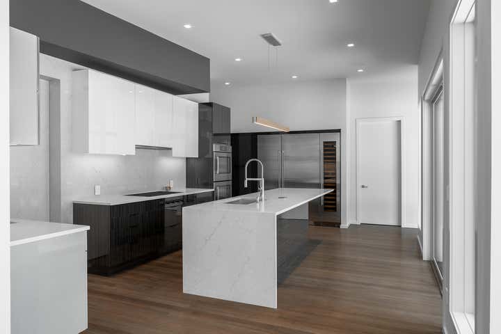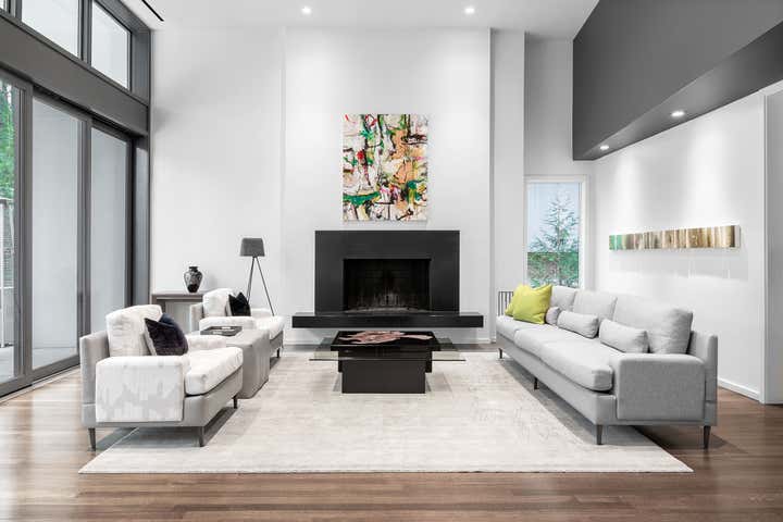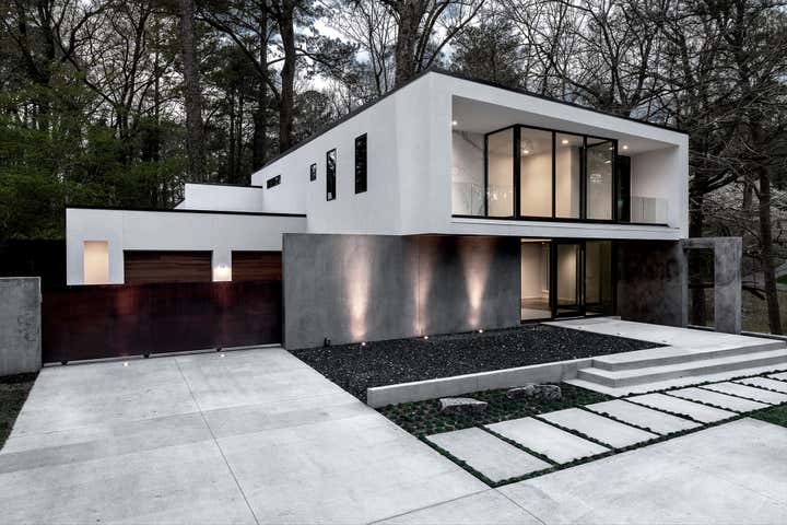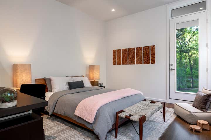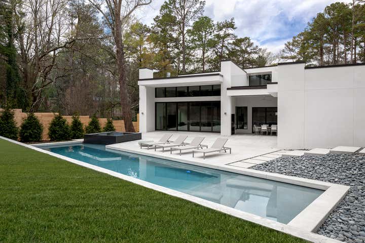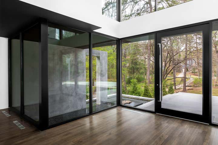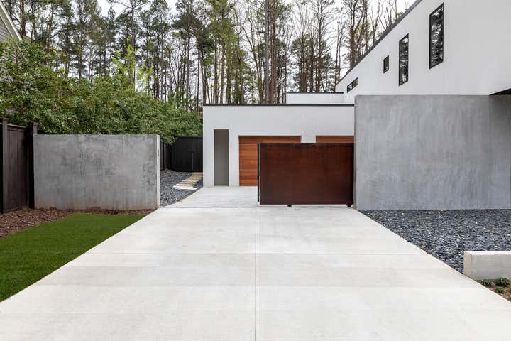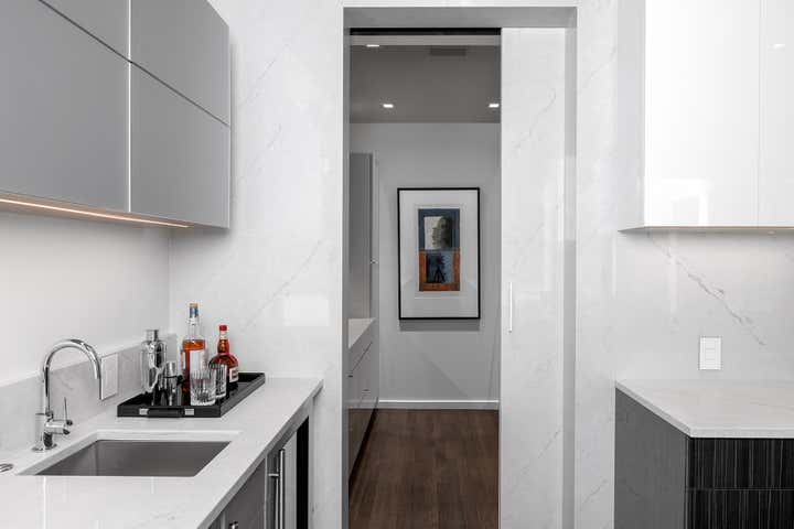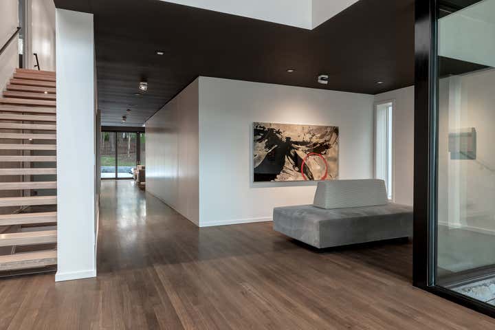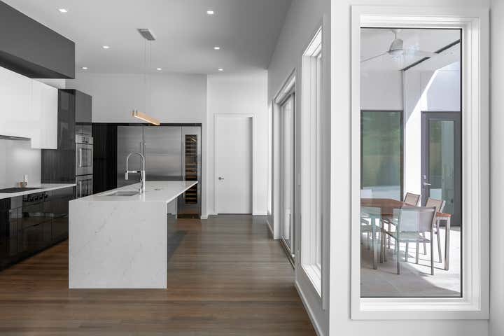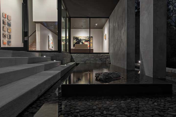This home s owner loves the modern aesthetic. What s unique about this home, besides all of it, when greeting guests in the front entry gallery, the primary living areas are private. This house is all business in the front, all big open entertainment spaces in the back. Be sure to look at the "glass cube" powder room under the stairs and the two staircases that begin in the front and the back, to meet together on the second floor.