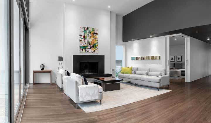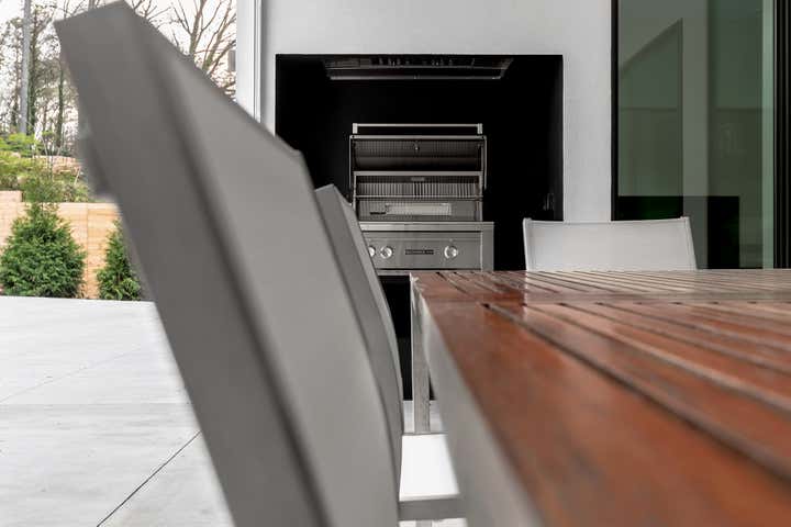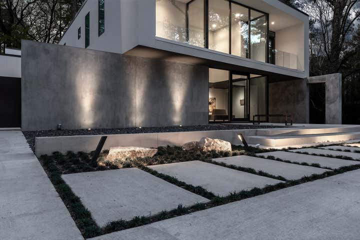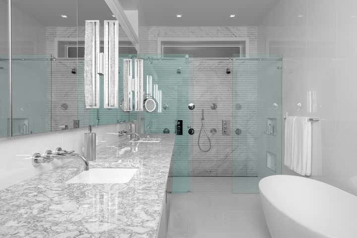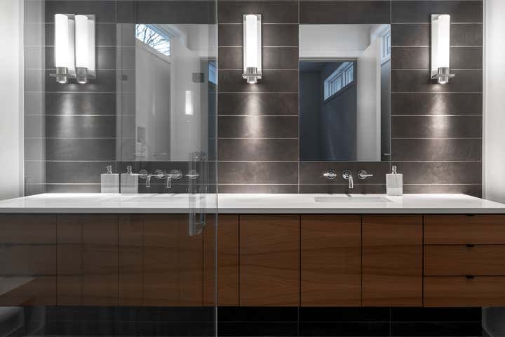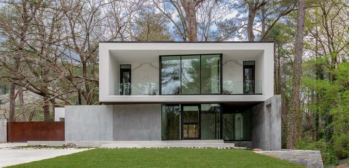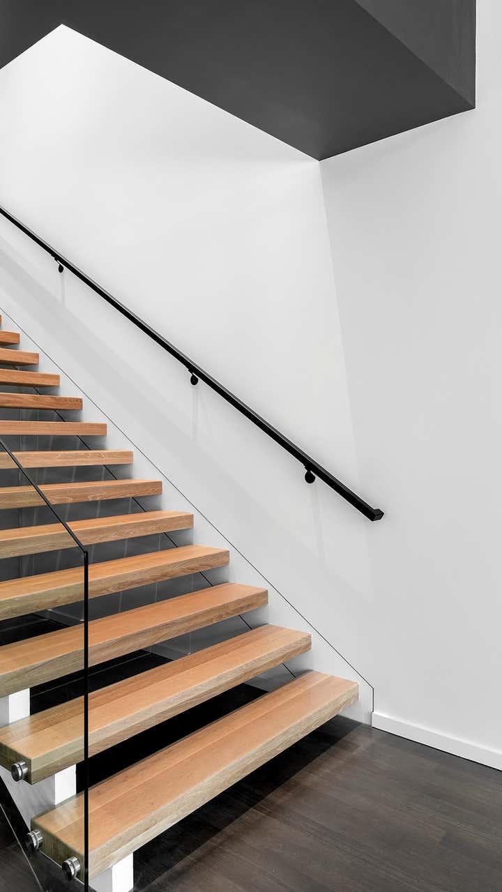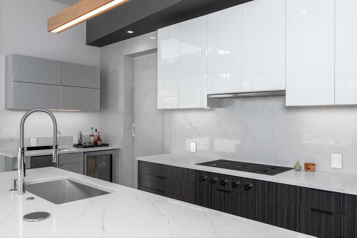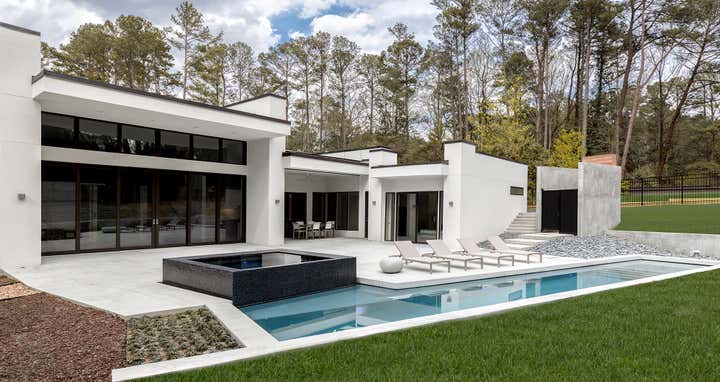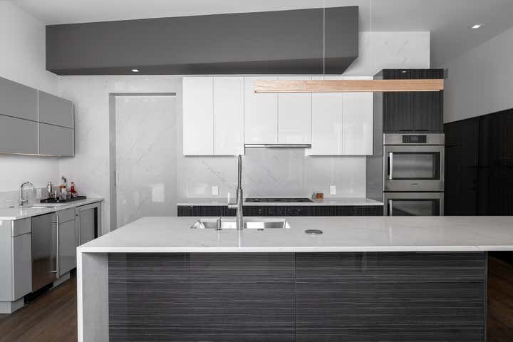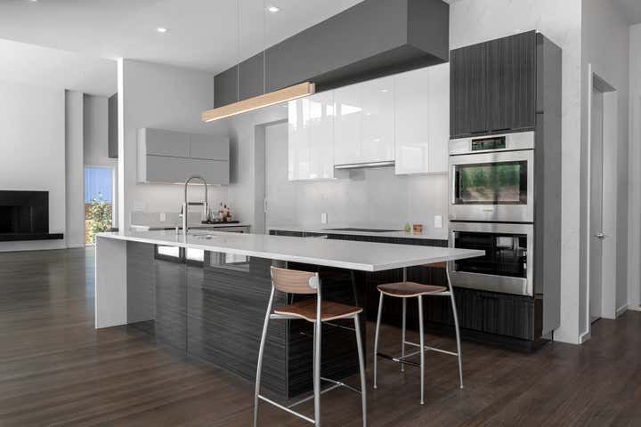 This home s owner loves the modern aesthetic. What s unique about this home, besides all of it, when greeting guests in the front entry gallery, the primary living areas are private. This house is all business in the front, all big open entertainment spaces in the back. Be sure to look at the "glass cube" powder room under the stairs and the two staircases that begin in the front and the back, to meet together on the second floor.