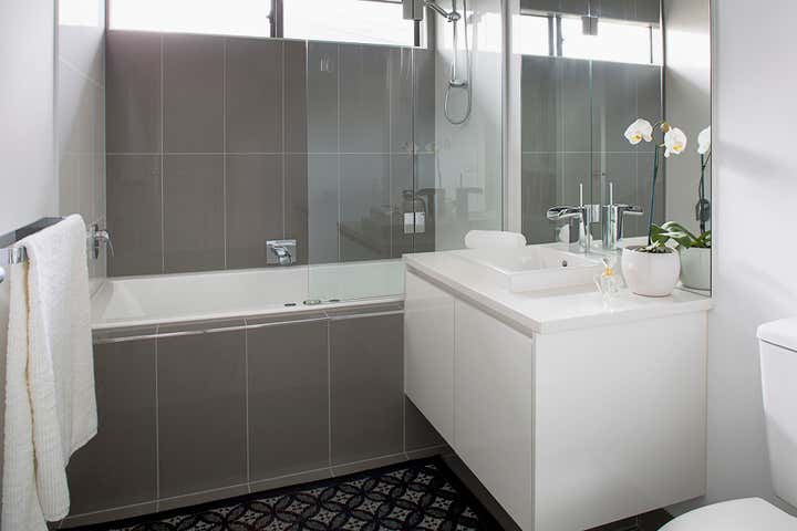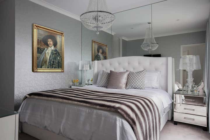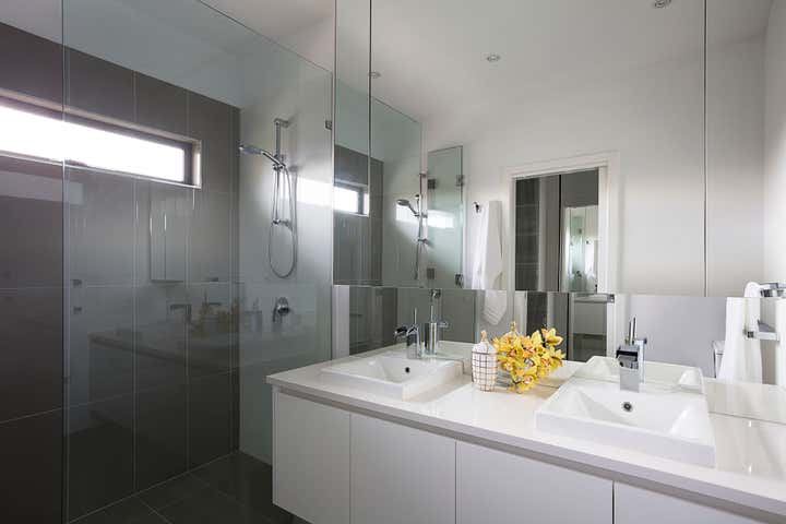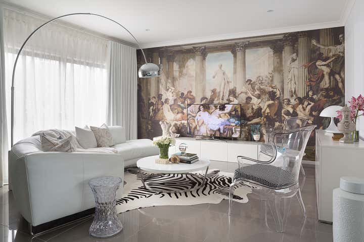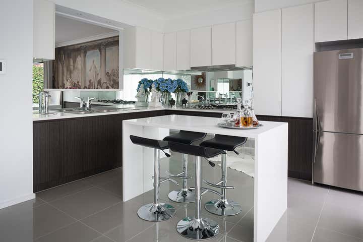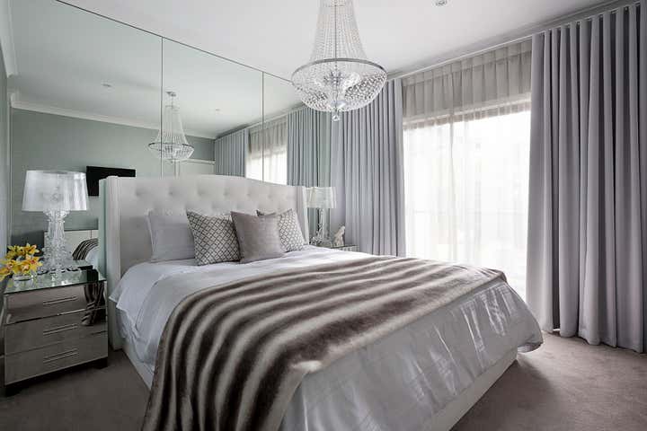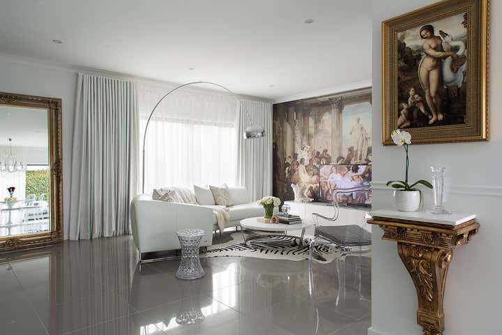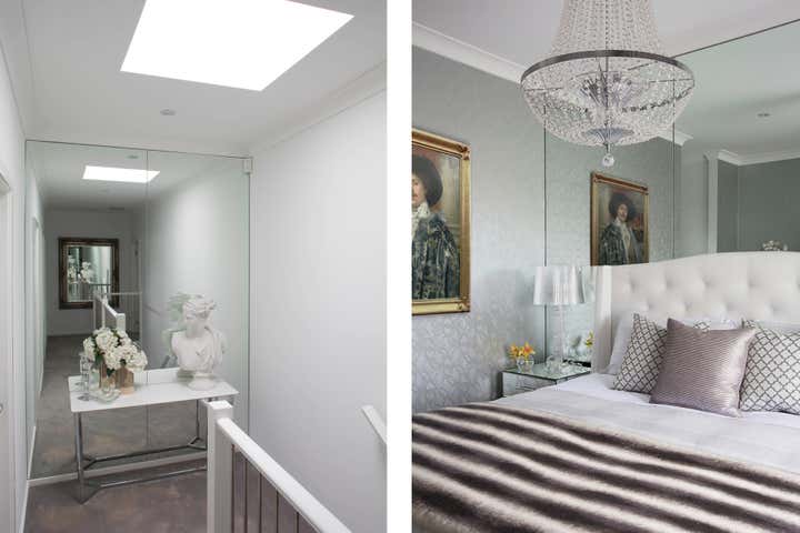 The "Bespoke Masterpiece" lounge-room is one of the most impressive in the home; a large feature wall mural dominates the room. The furniture used here while sleek and sophisticated, maintain a neutral palette and the overall visual feel of the home continues upstairs. With walk-in wardrobe, balcony and ensuite, the master bedroom evokes the ambience of a high-end hotel suite. Silver-embossed wallpaper and a floor-to-ceiling mirror wall create a textural, spatially unique and glamorous look for the room.