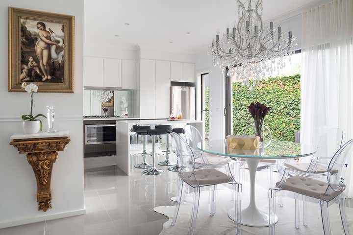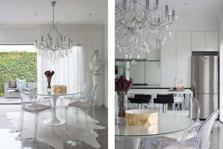 High-gloss ceramic tiles were used as a neutral foundation, establishing an anchor point for the rooms and providing a low-maintenance solution. Kitchen and dining areas are light and spacious. A mirrored splashback creates added depth within the kitchen and reflects diffused light back into the rooms.