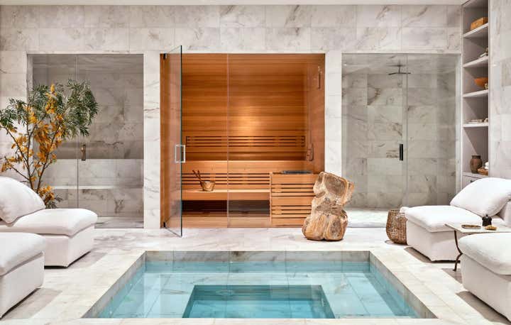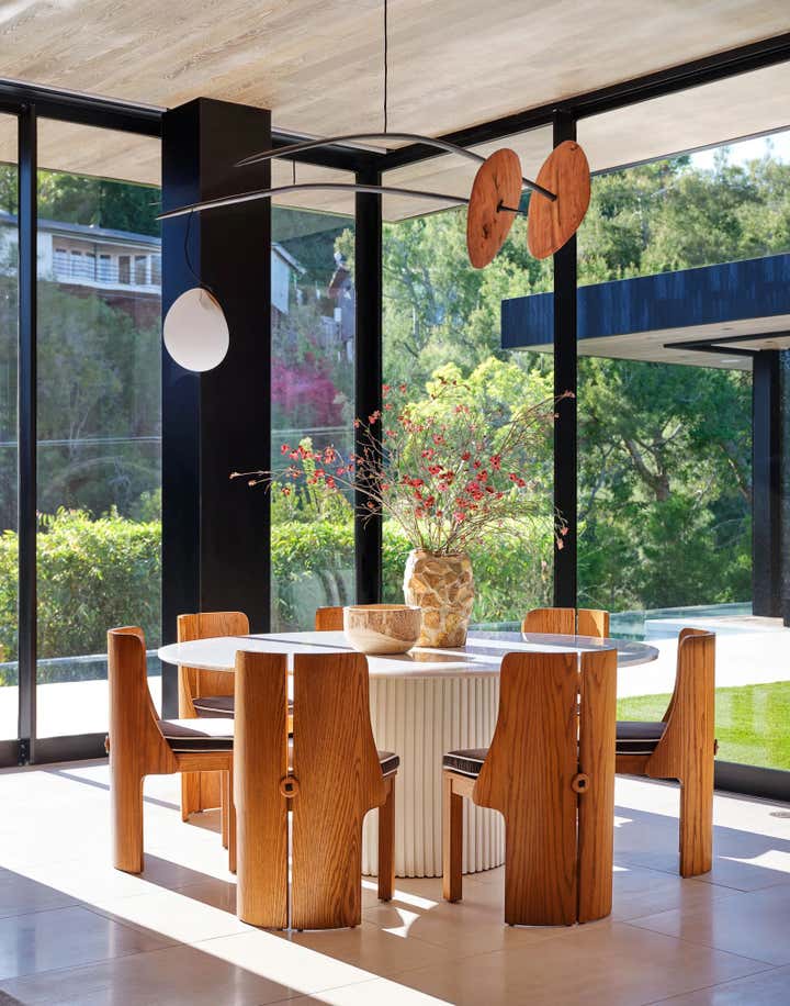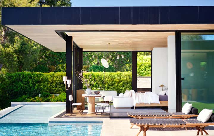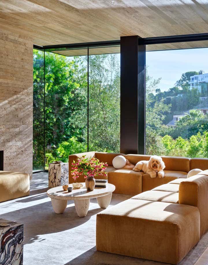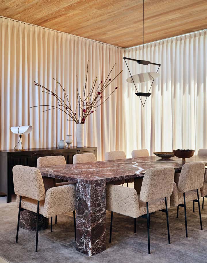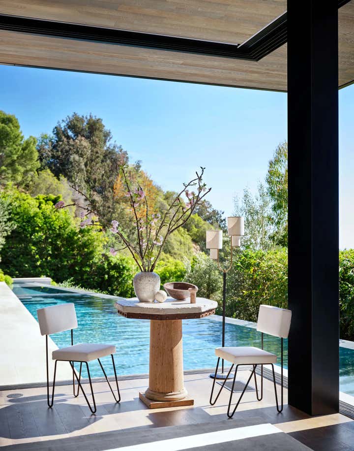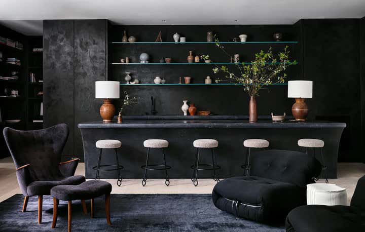 For Brian Robbins and Tracy James home in Beverly Hills, Nate and Jeremiah focused on "...bringing a sense of warmth and coziness to a pristine contemporary house." The designers orchestrated an unpretentious, decades-spanning symphony of chic, eminently comfortable furnishings, many reused from the homeowners’ previous residence. Berkus and Brent’s biggest moves involved the transformation of the kitchen with new bronze cabinetry and floating shelves, and the replacement of a reflecting pool on the subterranean level with a verdant Japanese garden. More subtle gestures throughout the home were calculated to lend intimacy and texture to specific rooms without overshadowing the integrity of the architecture. The designers cloaked the four walls of the dining room in suede curtains, for instance, and sheathed a powder room in a coat of paint resembling mottled Venetian plaster. They also converted the lower-level lounge into a seriously alluring grown-up playroom awash in black plaster, Nero Marquina marble, and bronze details. “That space is the yin to the yang of the rest of the house. It’s the perfect place for after-dinner hangout time,” says James, who is launching a namesake collection of breezy silk dresses and vacation wear next spring.