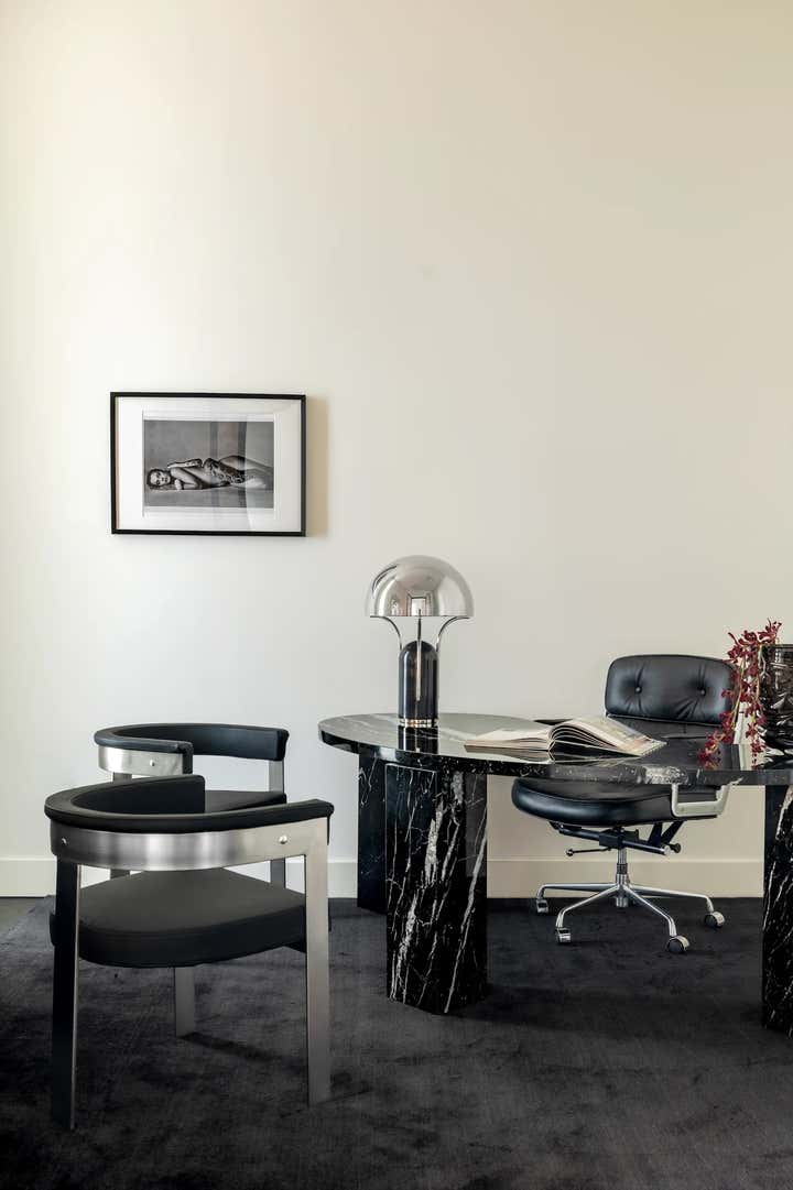 The centerpiece of Bilal s private office is the custom-designed desk, hand-crafted of solid Nero Marquina Marble by Yellowstone in Houston, TX. The design of this desk was the work of Bilal and the entire Bilal Rehman product design team.