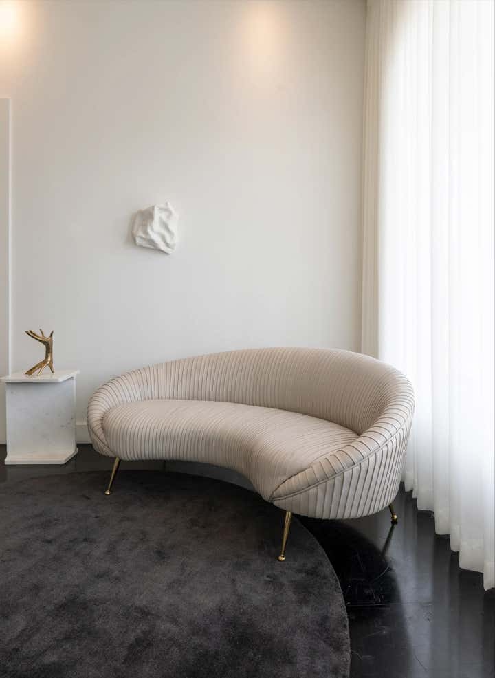 Adorning the ceiling is a geometric Kelly Wearstler chandelier.