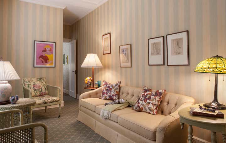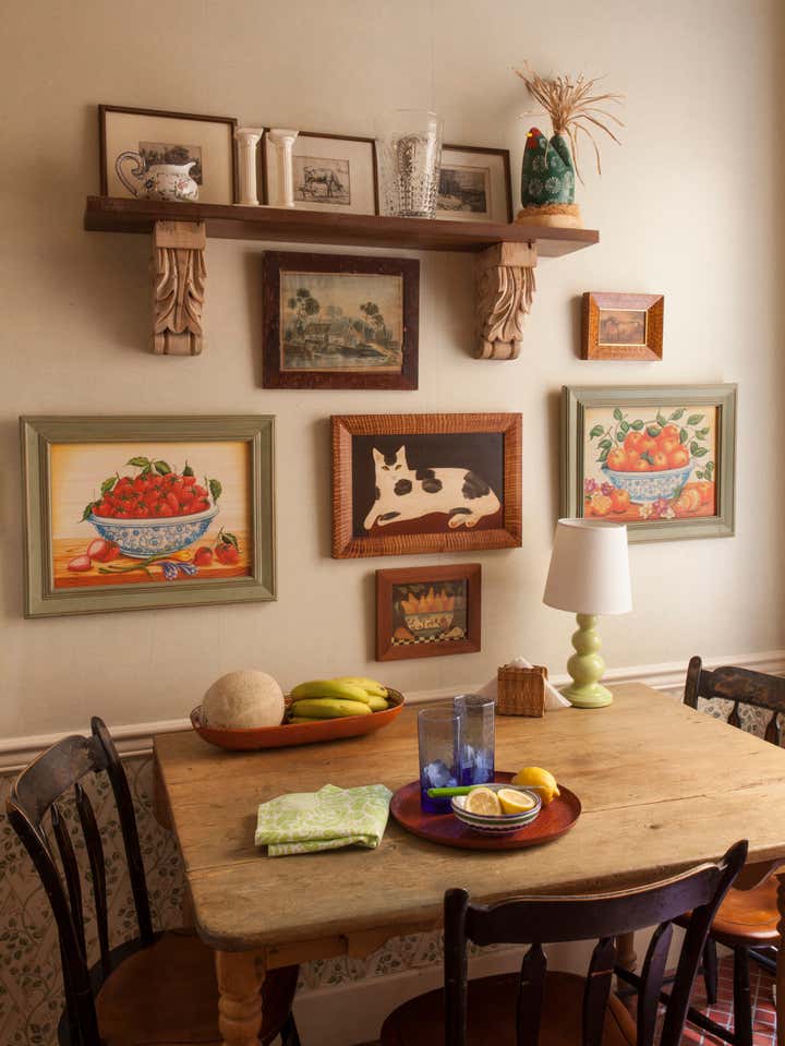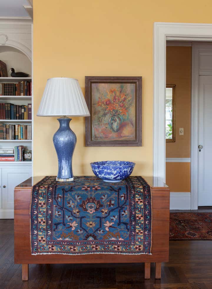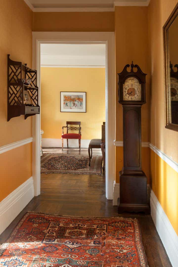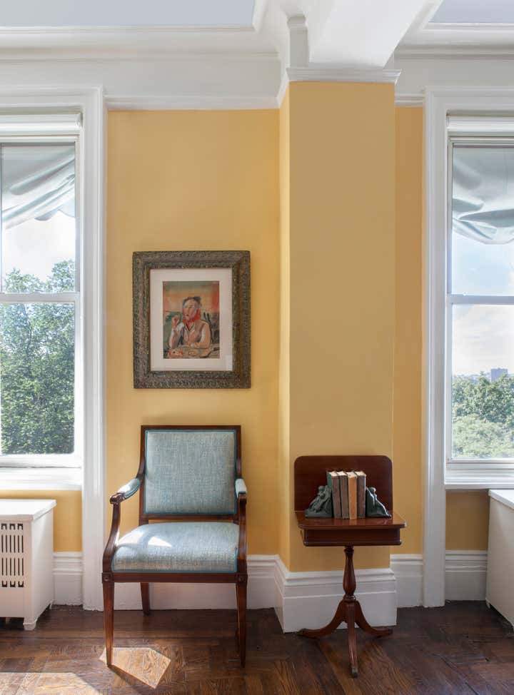 A peaceful perch overlooking the Hudson. Looking out you see boats chugging and bobbing along. Across the Hudson, acres of trees, urban hubbub and fantastic sunsets. Looking in, radiant gold walls, classic furniture and a whimsical perspective. Mrs. S has had the good fortune of this view for more than 50 years and for most of the past 20 when the sun starts to set, she walks 18 blocks south for dinner with family and then back home along Riverside. The rhythm conjures an image of a sophisticated, mature “Madeline”. The goal was to revitalize the interiors after a number of years of deferred maintenance. “Life intrudes!” Good bones and many great pieces were already in place, but most of the elements needed new life. Mrs. S’s own paintings were the inspiration. She had studied and painted at the Art Students’ League for many years. Influenced by Matisse and Gauguin, her paintings have naive, animate, witty, and illustrative qualities. I worked to interpret her perspective. As the project was concluding, sofas having just been installed, Mrs. S sat down trying them out, and offered me the greatest compliment, “I feel like I am sitting in one of my paintings!”