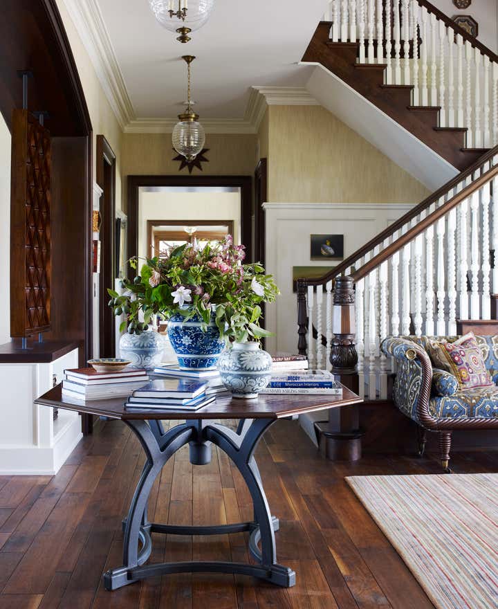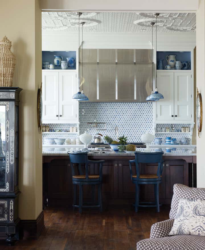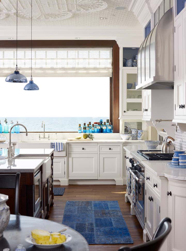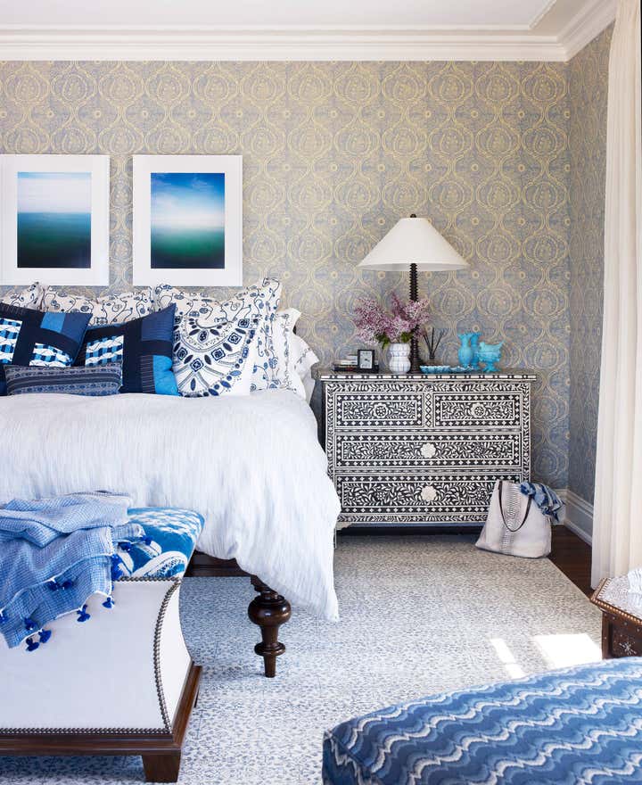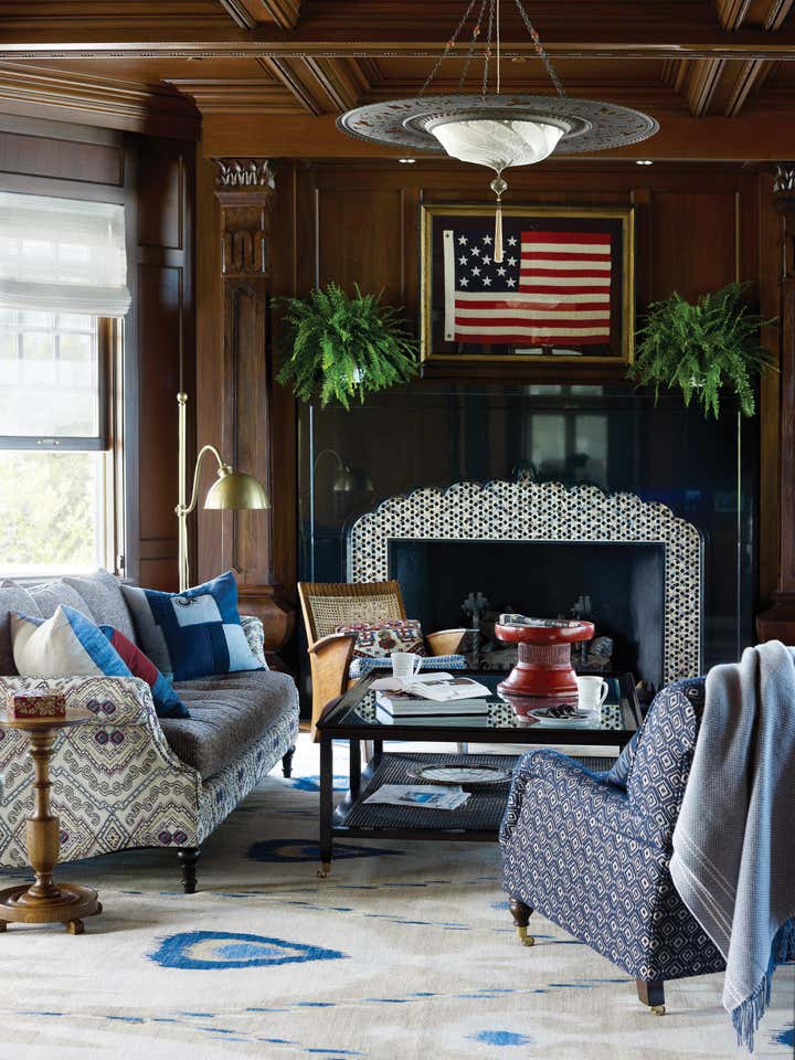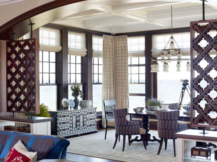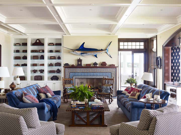 This family retreat nods to its lakeside location without resorting to nautical cliche, thanks to vividly patterned, richly textured fabrics, furnishings, antiques, art and rugs – some fine, some found, some custom, and some even from Pottery Barn. With five sons and a host of regular visitors, its owners demanded fuss-free interiors that nonetheless display their sophisticated sense of style. From vintage textiles to hand-dyed, rice paper-clad walls, this home delights and surprises at every turn. Even the custom interior of the Sabre docked outside is anchored by a thoughtfully conceived design that echoes the residence just steps away.