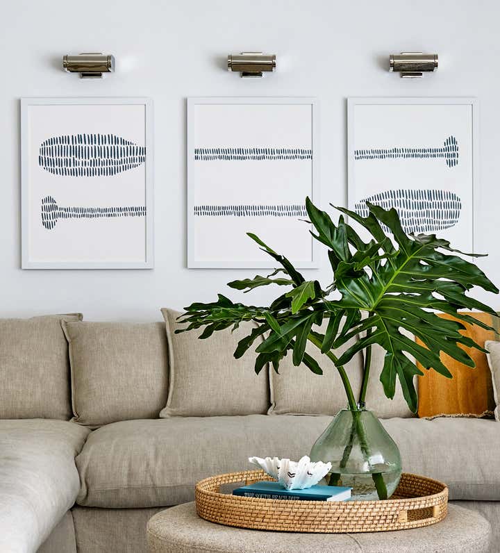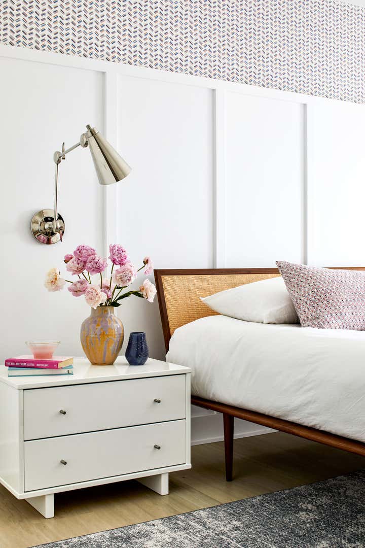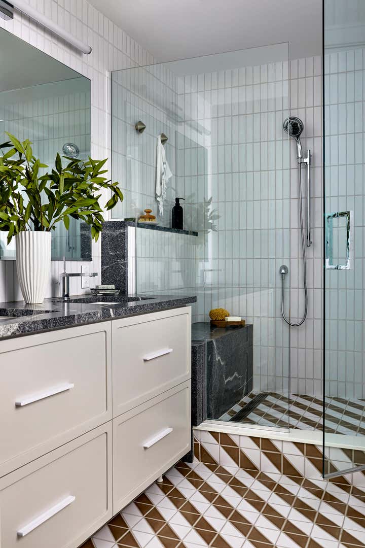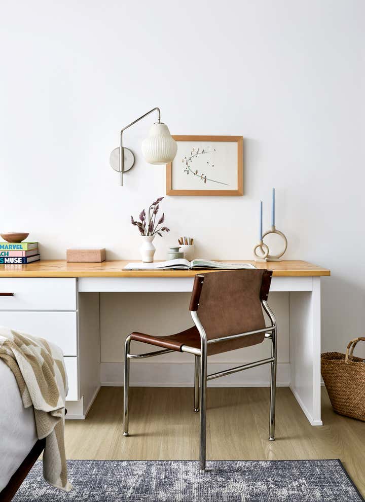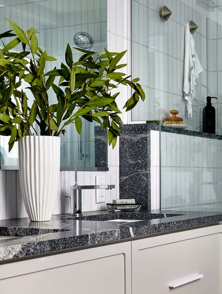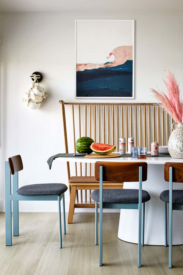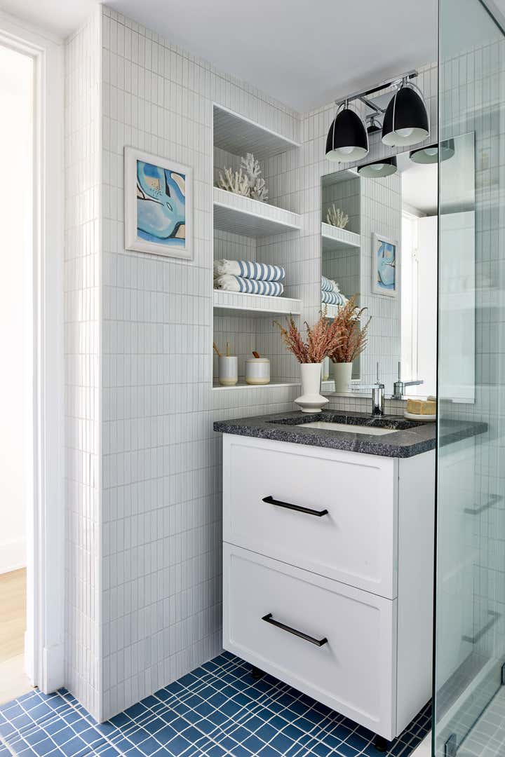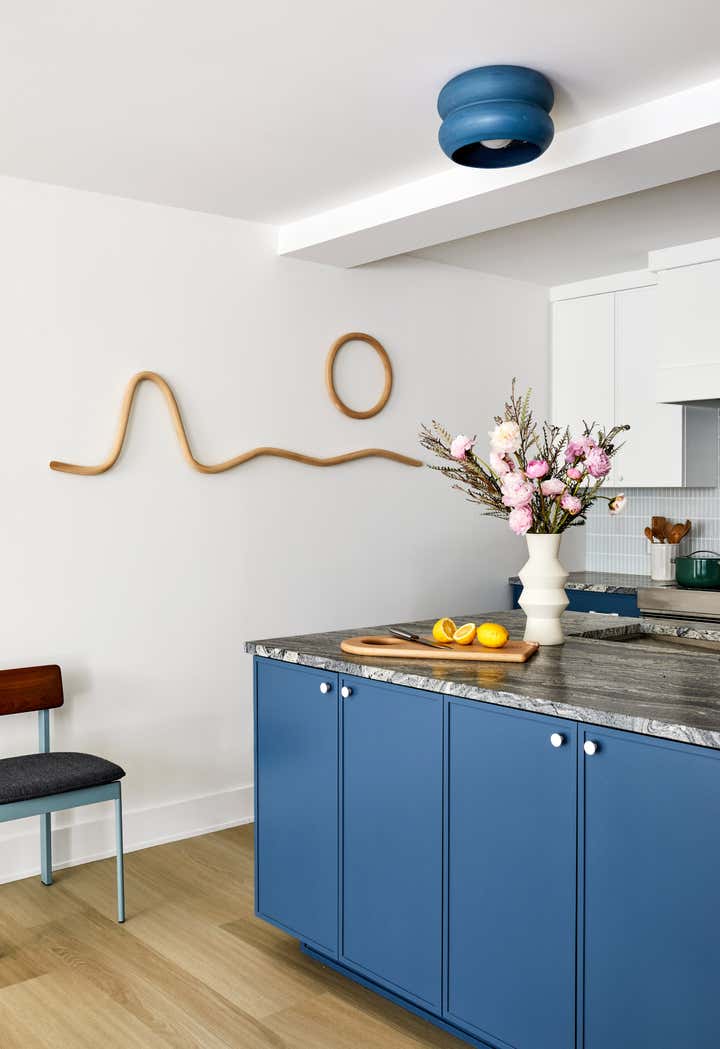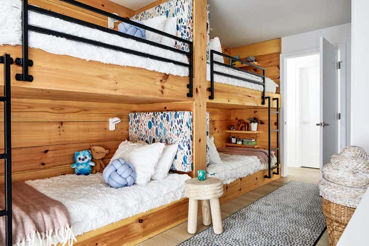 Stormy blue, bright touches and playful patterns energize this weekender on Delaware’s Rehoboth Beach Boardwalk. A structural column in the kitchen is embraced with knotty pine, a raw finish that repeats elsewhere in the residence, wrapping bunkbeds, serving as shelving, and creating a seamless transition from desk to dresser in primary bedroom.