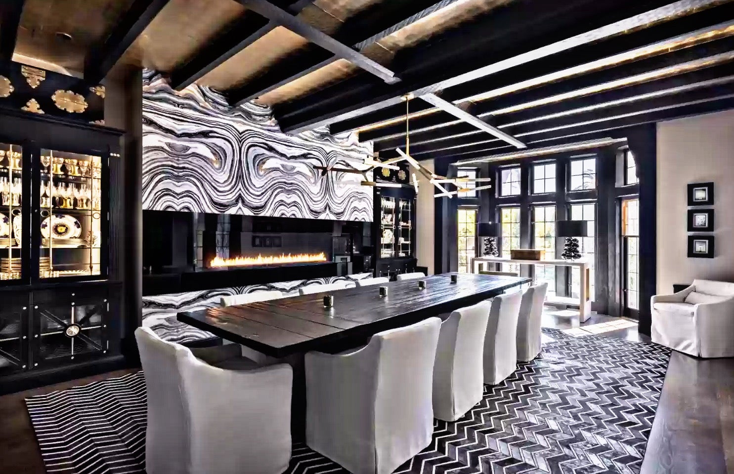 Bold. Bold. Bold. If Dark and Stormy were an overall design, this would be it. Deep dark wood accents adorn book-matched stone with a contemporary fireplace flanked by ornate China cabinets to allow for the perfect table setting to be made at this custom dining room table. Linen seats provide a more casual and welcoming flare while allowing the custom hide rug to be the true showstopper.