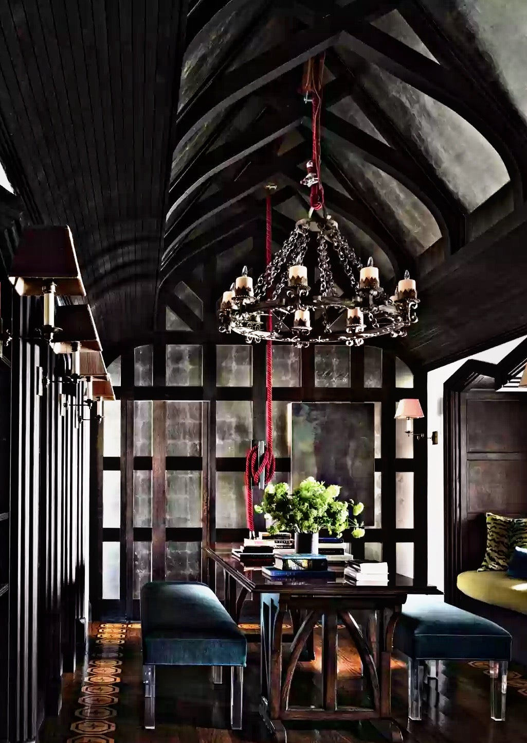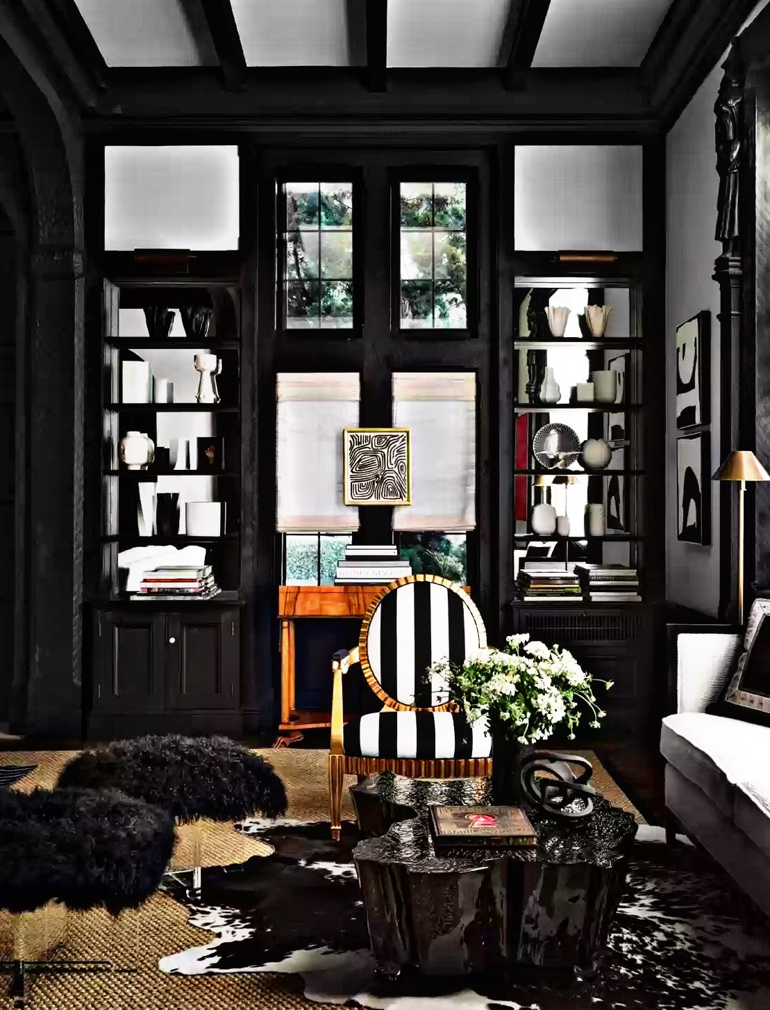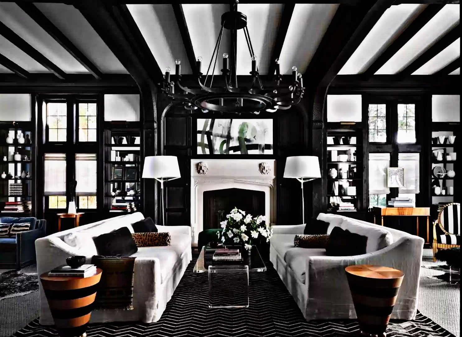 The Family Room is Boldly, Black, and White! Classic black and white design with pops of natural woods, custom-made hide rugs, unique patterns, and beautiful textures bring together this stunning design in a fest that meets one’s eyes at every corner. Layers upon multi-dimensional layers envelop guests as they enjoy one of the multiple seating areas in this great room. The overall design was meant to be decadent and luxurious while boldly playful all at the same time.