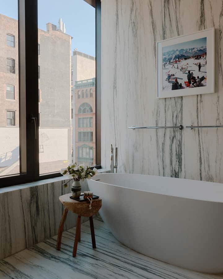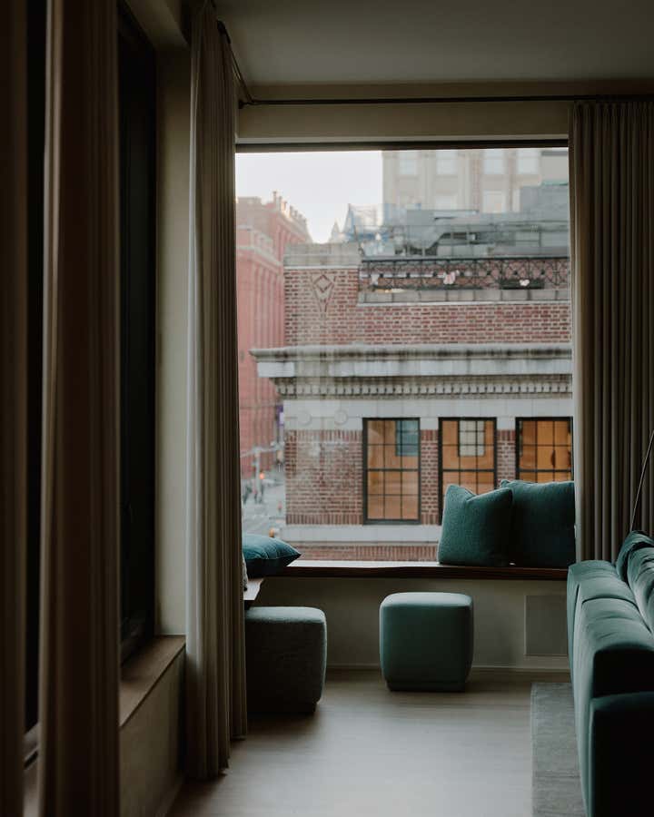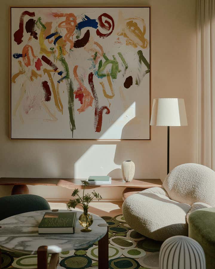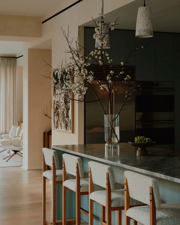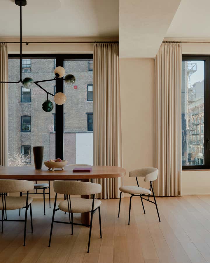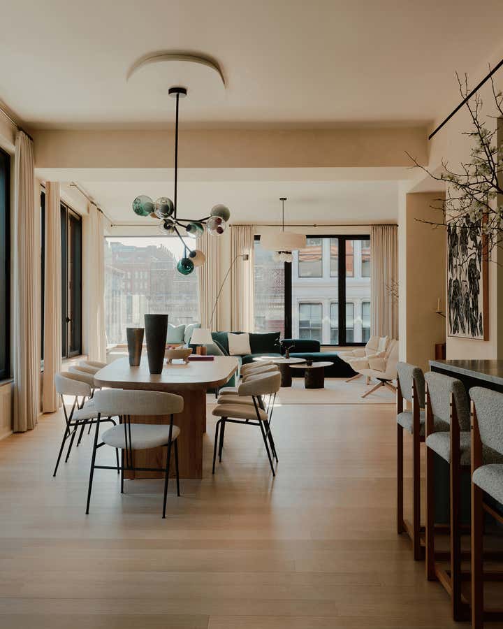 The combination of these subtle textures aimed to evoke a feeling of calm and establish a soft, plush oasis in the heart of New York City. Beaudry Collier successfully navigated the challenge of designing a spatial layout within the expansive, open, and irregular floor plan, ensuring distinct areas for entertaining, dining, and a lounge, despite the absence of dividing walls.
