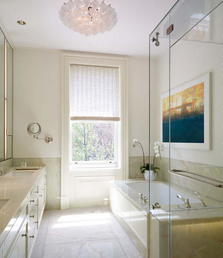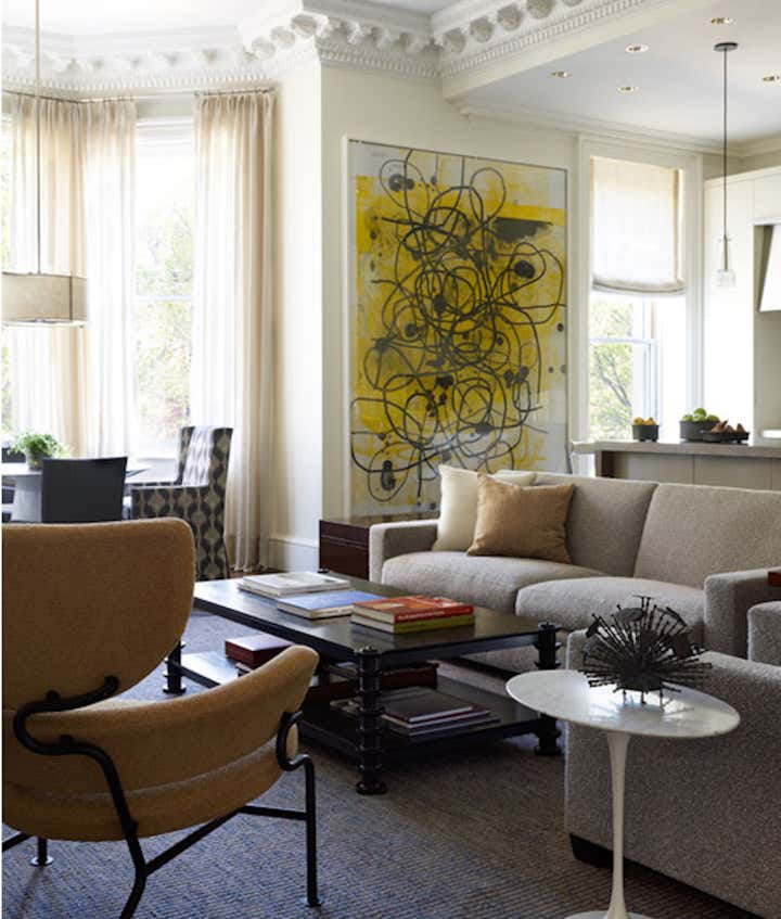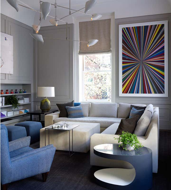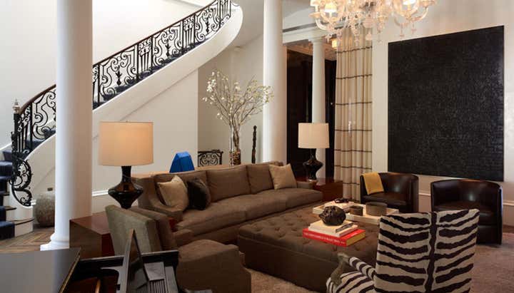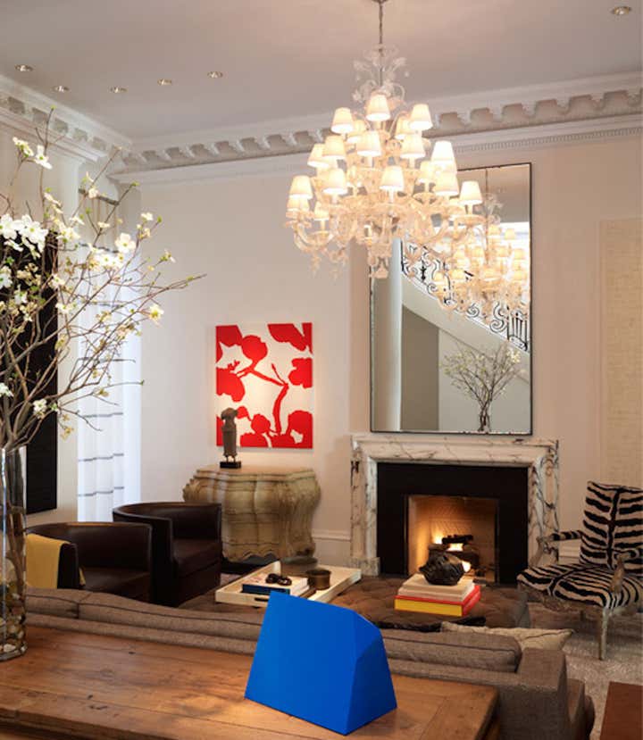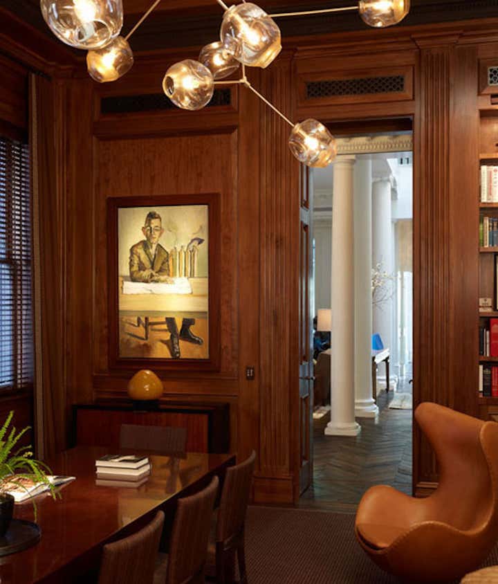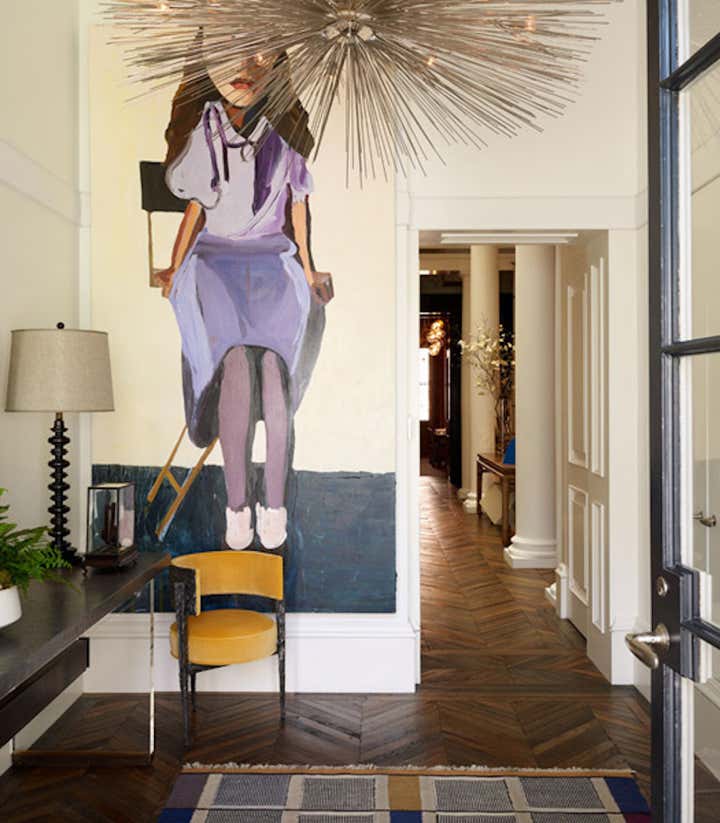 Our client, a contemporary art collector, wanted a space that would showcase large artworks without relying on a conventional white-box gallery interior. We began by studying the paintings to select colors, materials, finishes, and furnishings. Patterns abound, from animal-print chairs to chevron French oak flooring. Although the building’s original details were lost in earlier renovations, we worked with the architect to restore its soul. Intricate plaster work, wood-paneled rooms, and details like onyx wainscot give the home a sense of history. The direct result of a shared vision, this project shows what’s possible when design, architecture, and the client align.
