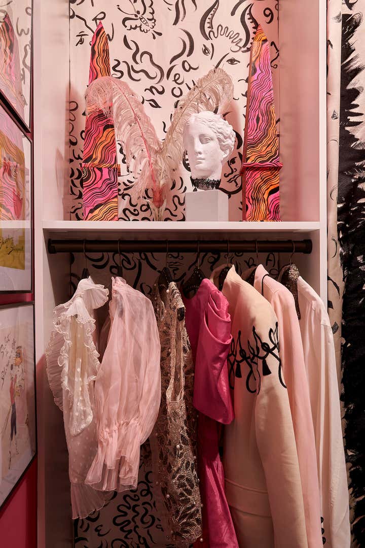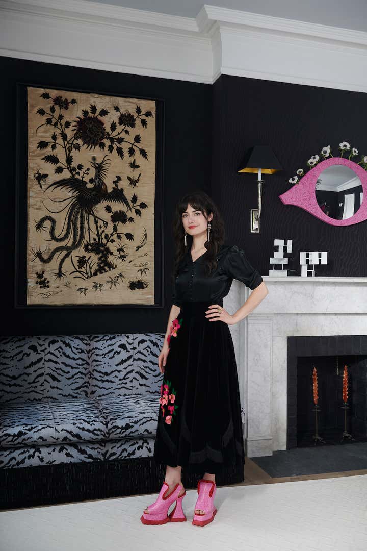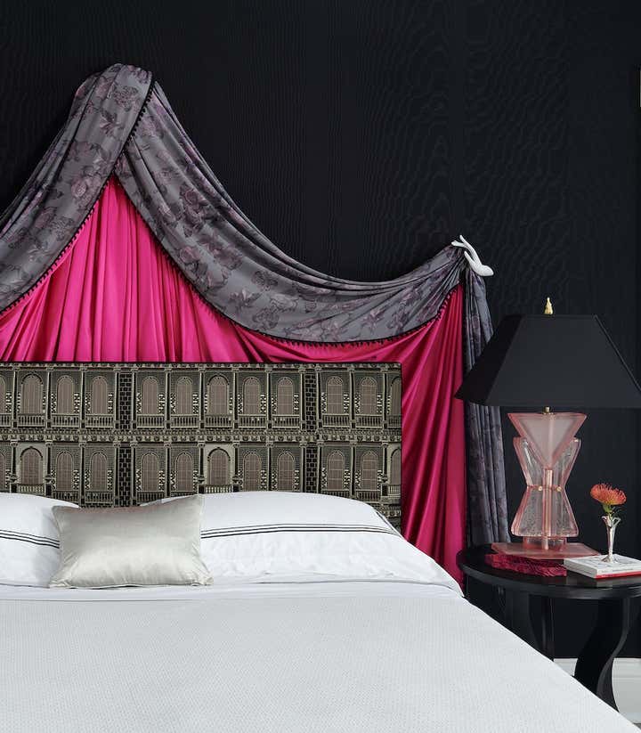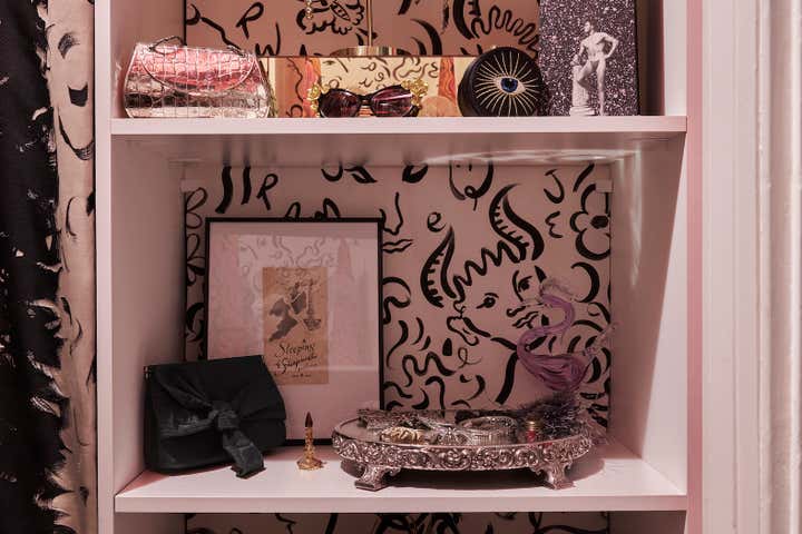The imaginary client I’ve kept in mind from Day One has been Elsa Schiaparelli, the fashion designer whose garments themselves, it could be argued, were Surrealist works. I’ve drawn just as much inspiration from her couture dressmaker details as from the offbeat, humorous touches she regularly added with élan. The black moiré silk lining the bedroom walls was a frequently used fabric in Schiaparell’s work, and her signature color “Shocking Pink” makes numerous appearances throughout my design. In fact, this fictional collaboration has revealed itself to be kismet. In my research, I discovered that Schiaparelli designed a perfume in 1940 called “Sleeping” which was meant to be spritzed moments before drifting into slumber. The scent was intended to illuminate the subconscious and “light the way to ecstasy."