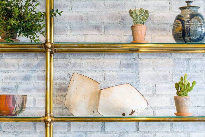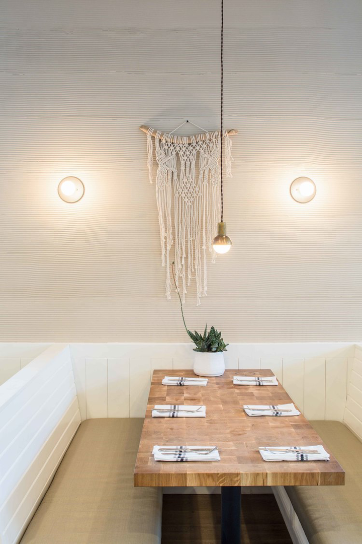 Café Gratitude is located in a corner unit space within Michael Maltzan’s airy One Santa Fe complex. Our main goal in designing the Café Gratitude restaurants is that the spaces feel clean, bright and welcoming. Ideally, the dining experience should support the food, which is organic vegan grown mostly on the Be Love farm in Vacaville. To achieve this, the materials tend towards simple and organic with saturated muted colors. We tried to infuse a mix of textures in the space to contrast to the stark exterior. The paneling on the take out bar is reclaimed oak and the tiles behind are handmade by Fireclay. We worked with several local artisans to contribute to the space: Heather Levine’s handmade ceramic pendants above the bar; The encaustic cement bathroom and patio tiles by Kismet; The sconces by Atelier de Troupe.