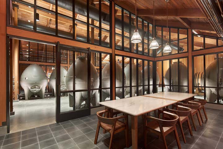 The main floor of the addition comprises a large barrel storage room, a light-filled state-of-the-art wine laboratory, and a suite of private tasting rooms, ranging from light-filled and airy to industrial and atmospheric. The tasting rooms and reception’s great hall feature a significant collection of mid-century furnishings by Adrian Pearsall, Johannes Andersen, Carlo Molino, Carlo de Carli, Renzo Fauciglietti and Grazielle Bianchi. In addition to architectural design services, BCV also provided: purchasing; custom furniture, casework, and lighting (fixture) design; as well as coordination with the client’s considerable art collection.