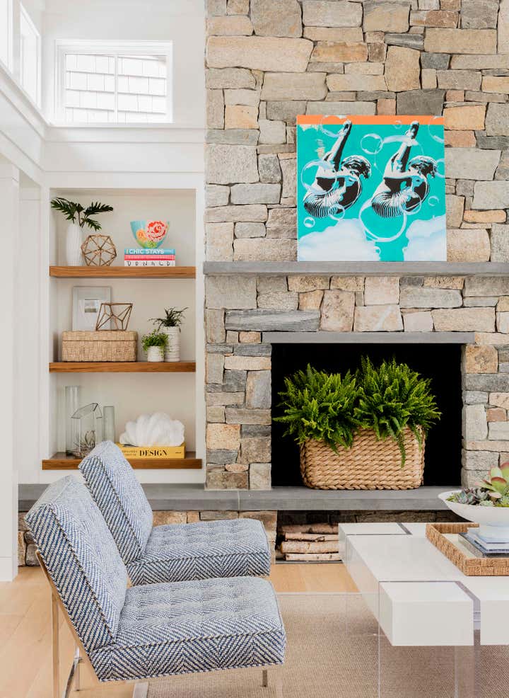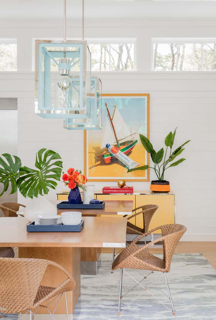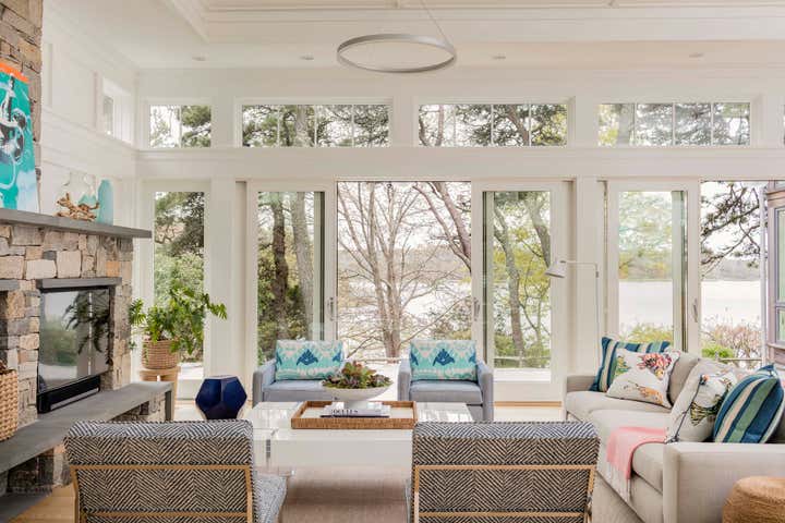 The exterior of this waterfront home on Cape Cod was designed to disappear into the landscape, so as not to compete with the view. Inside, Robin used the same restraint. White walls and pops of the owners favorite colors coexist nicely with the natural beauty just outside the wall of windows. Featured in the September-October 2018 issue of New England Home!