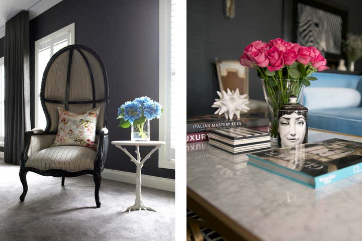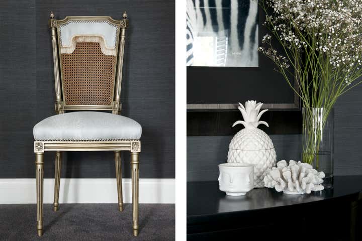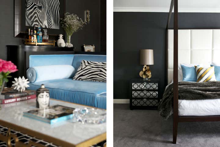 The design is a curated collection of antique, vintage and contemporary furniture, giving the room a unique style. The lush blue velvet sofa creates a regal, child free zone and the zebra pattern from the photograph is echoed in the fabric of the two lumbar cushions. On the marble top coffee table, an edited array of accessories, books and flowers bring warmth and sophistication, and a wink candle by Fornasetti adds a light-hearted reference to the room.