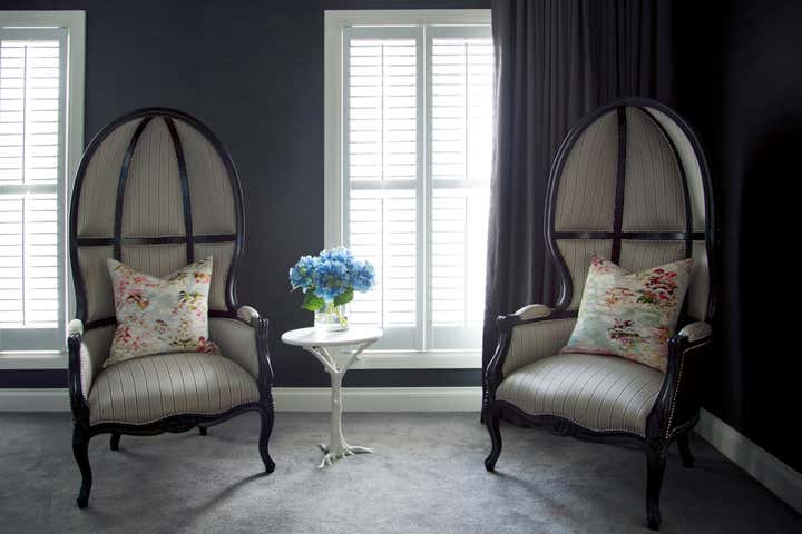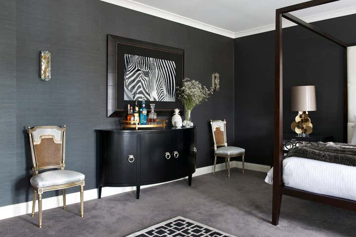 The large space is transformed with the introduction of furniture, perfect for creating separate sitting areas and an inviting atmosphere. The four-post bed creates a statement at the back wall while the blue velvet upholstered sofa takes centre stage, anchored by the custom designed geometric rug. The two grand armchairs, across the entry, provide a beautiful vignette by the windows. The dark and sexy atmosphere is brought to life by the charcoal grass-cloth wallpaper, warm brass accents and two vintage Italian 1940’s wall sconces in Murano glass.