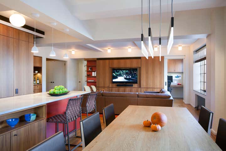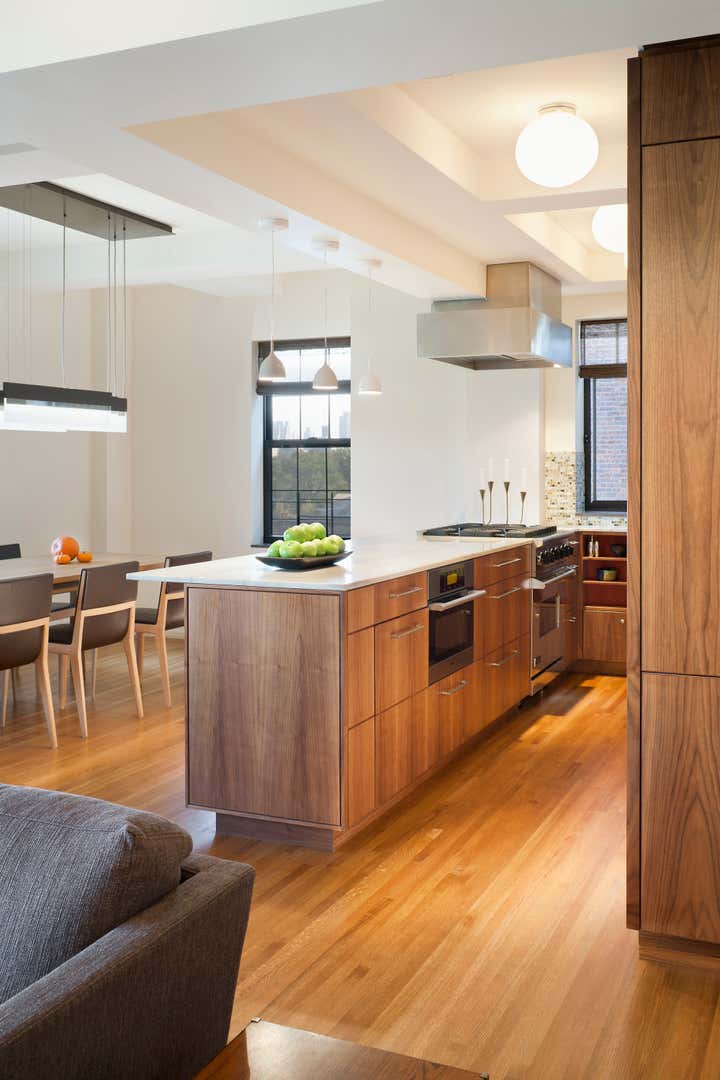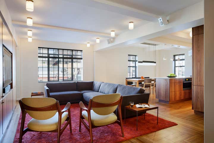 Through careful layout changes and the relocation of bathrooms and a kitchen, three small studios and one-bedroom units were combined into an open, loft like three-bedroom apartment. Using a simple palette of materials while maximizing multiple exposures to gain park views, the residence feels far larger than it is. Central air-conditioning was integrated in spite of the 7-foot beams and low, 8-foot ceilings.