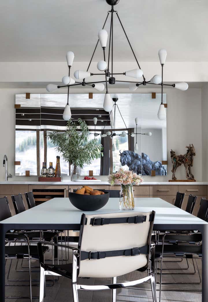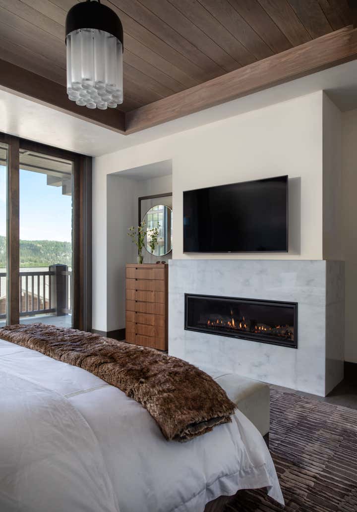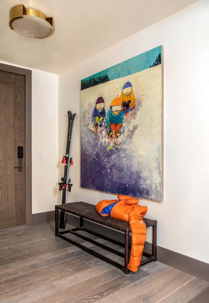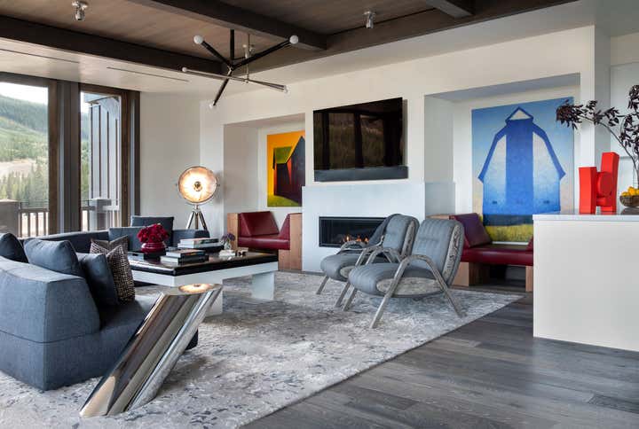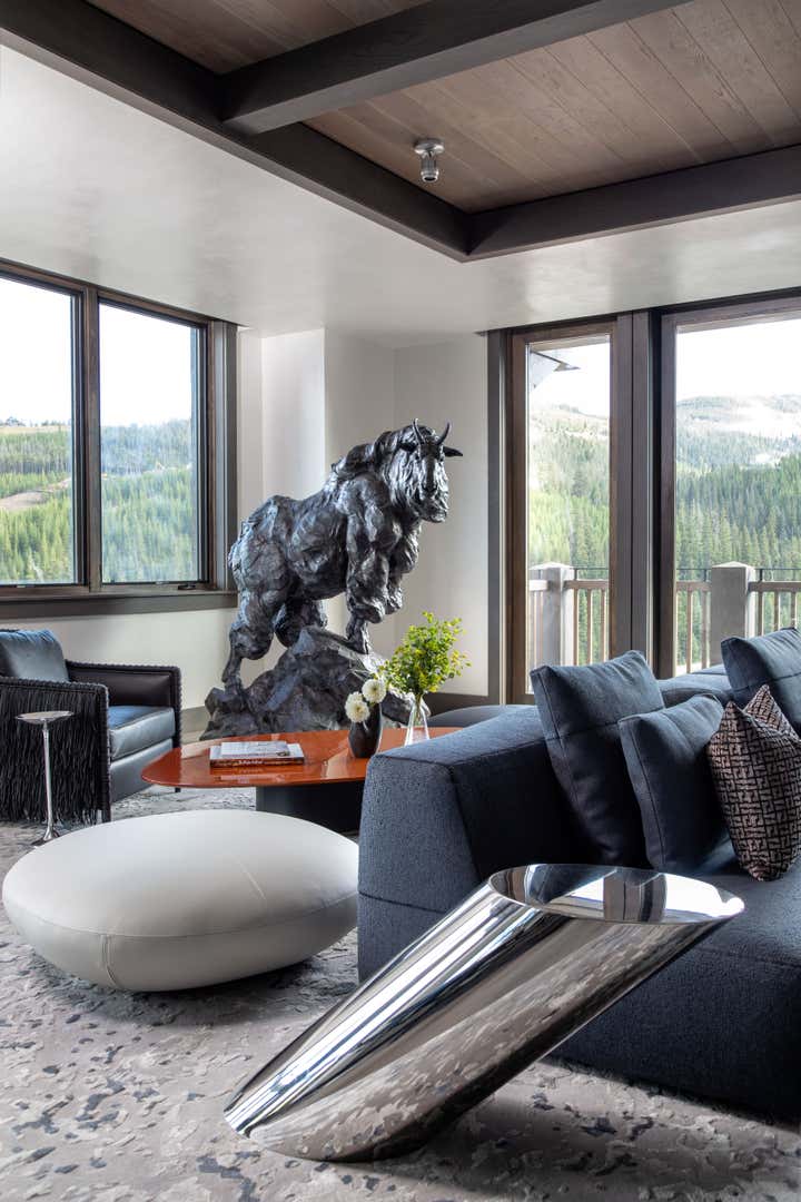Perched atop Big Sky Mountain in Montana, this vacation chalet was designed to be everything but cliché. With the clients love of art, the sculptures and paintings directed the design path of a boasting contemporary interior with subtle nods to nature. The first item selected for the project was a 400lb bronze mountain goat sculpture, by Tim Shinabarger, that was craned straight from a local gallery into the home. Its positioning is meant to continue the landscape from the exterior to the interior. The home needed to be luxurious enough to host its significant neighbors but durable enough to handle grandchildren, wet jackets and the bulk of ski attire. With these requirements we decide to incorporate a cool furniture palette of alpaca wools, chrome and lacquered finishes in juxtaposition with the deep textured wall plaster and wooden trim detailing. In the master we designed a soft haven with a full Silk rug and furniture that reads sculpturally itself. The smooth modern headboard is wrapped with a simple cow patterned hide and the table lamps bring in warm metals and suede. This chalet was meant to be shared, so we included bunk rooms whenever possible to host the maximum amount of guests for this couple’s winter retreat.