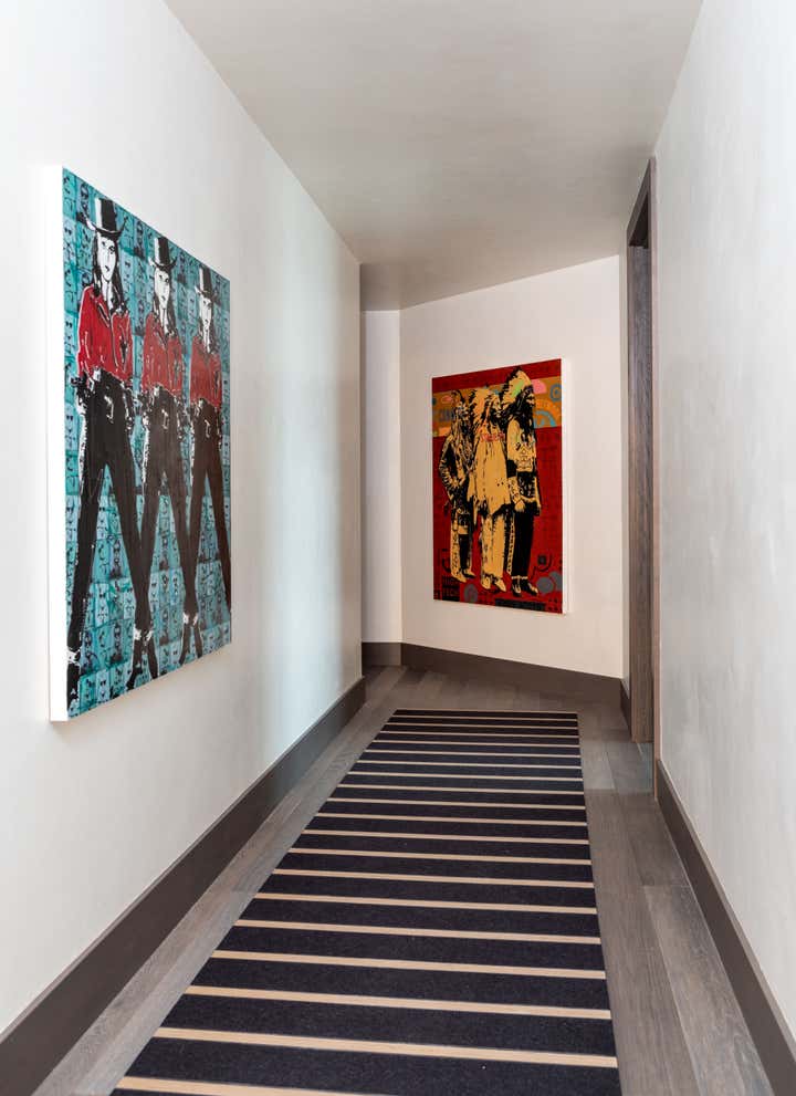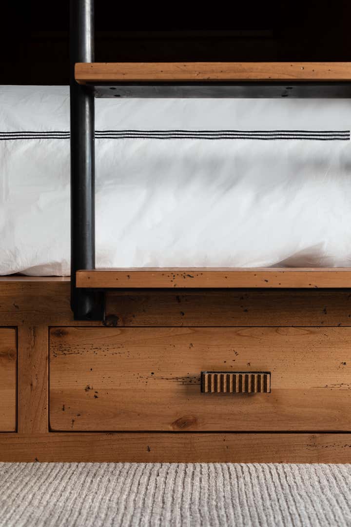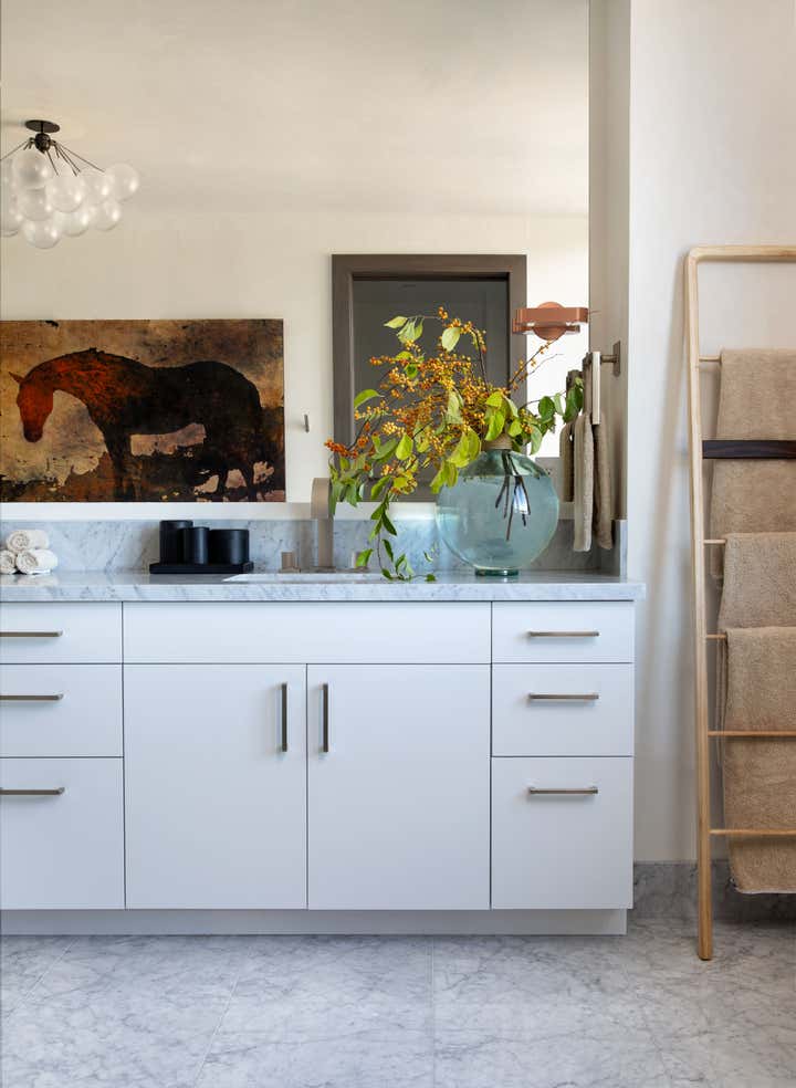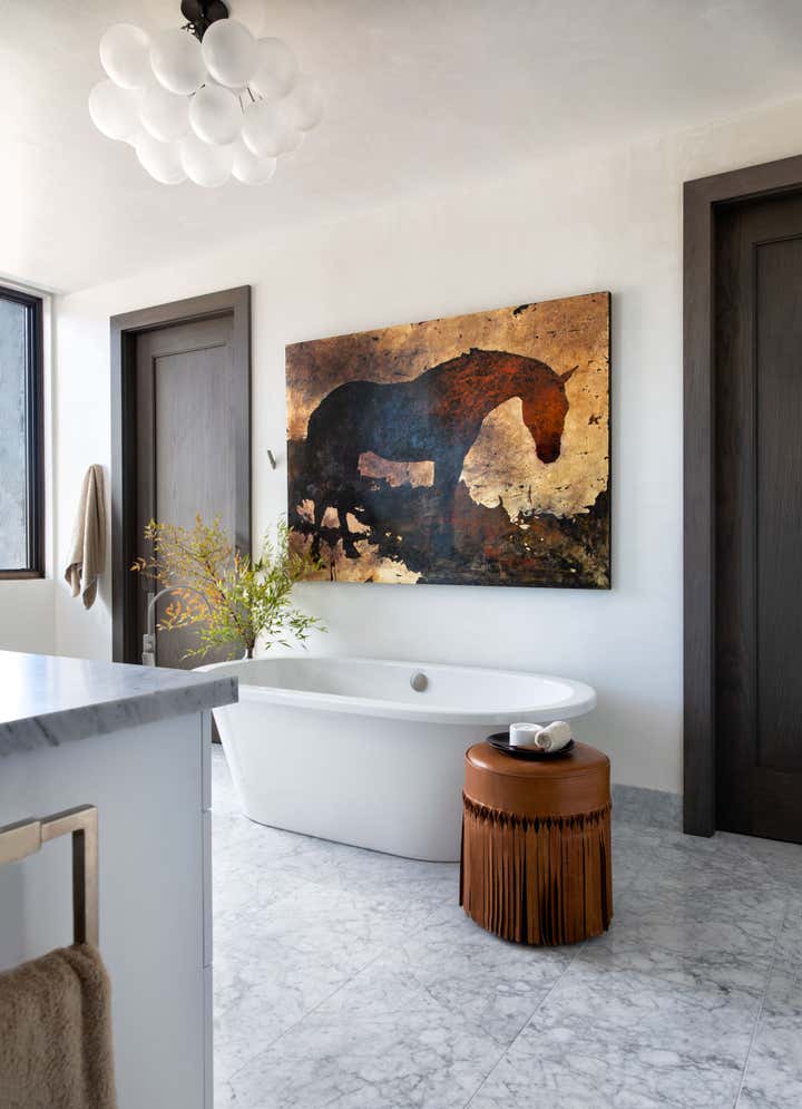 Perched atop Big Sky Mountain in Montana, this vacation chalet was designed to be everything but cliché. With the clients love of art, the sculptures and paintings directed the design path of a boasting contemporary interior with subtle nods to nature. The first item selected for the project was a 400lb bronze mountain goat sculpture, by Tim Shinabarger, that was craned straight from a local gallery into the home. Its positioning is meant to continue the landscape from the exterior to the interior. The home needed to be luxurious enough to host its significant neighbors but durable enough to handle grandchildren, wet jackets and the bulk of ski attire. With these requirements we decide to incorporate a cool furniture palette of alpaca wools, chrome and lacquered finishes in juxtaposition with the deep textured wall plaster and wooden trim detailing. In the master we designed a soft haven with a full Silk rug and furniture that reads sculpturally itself. The smooth modern headboard is wrapped with a simple cow patterned hide and the table lamps bring in warm metals and suede. This chalet was meant to be shared, so we included bunk rooms whenever possible to host the maximum amount of guests for this couple’s winter retreat.