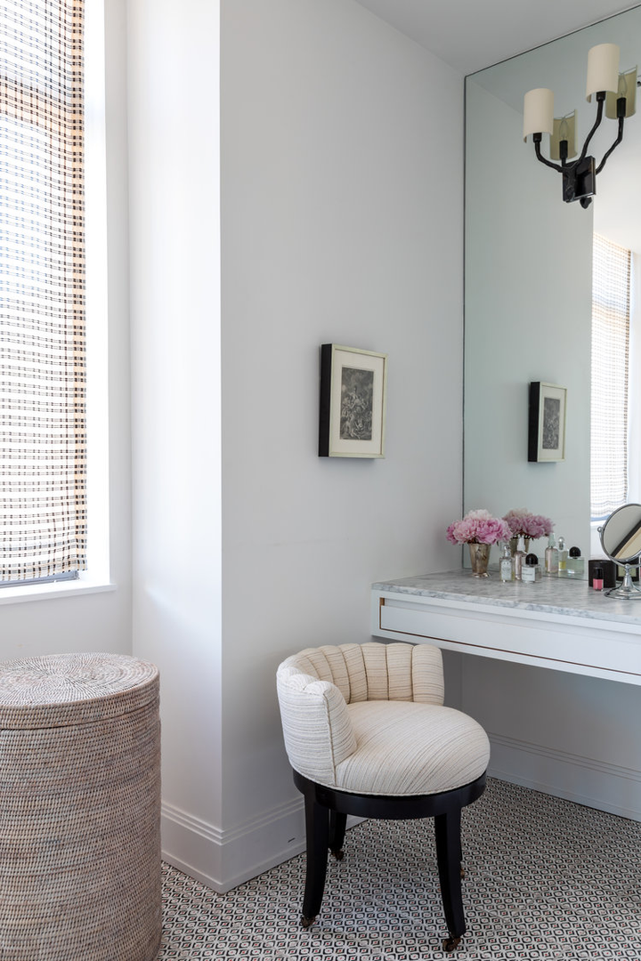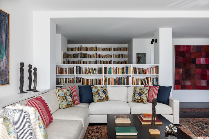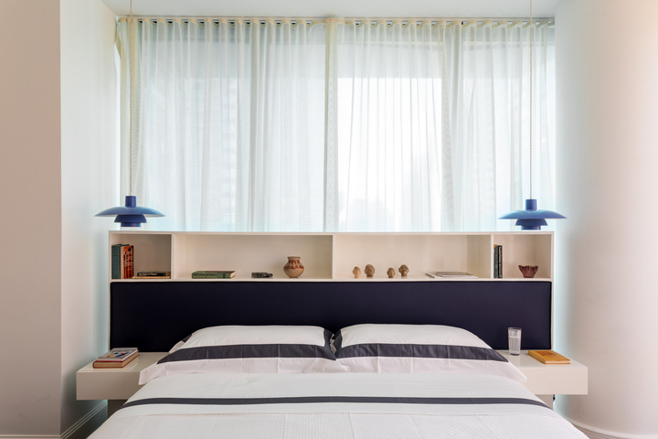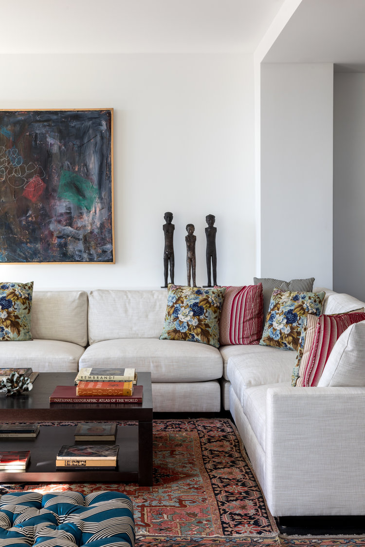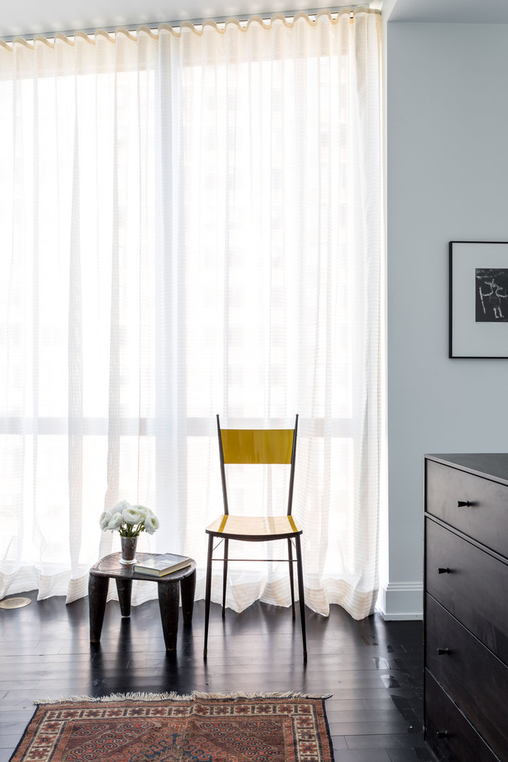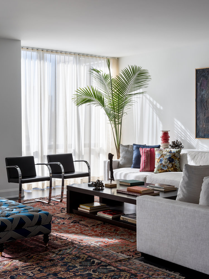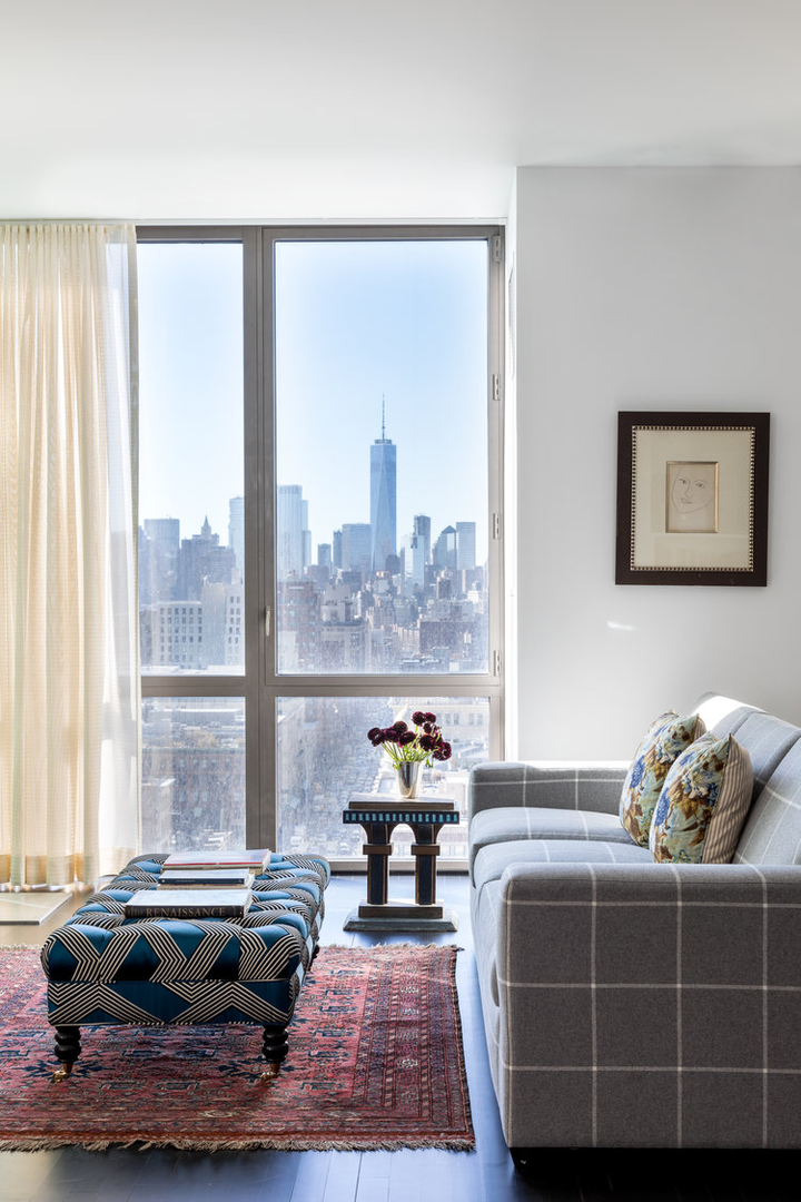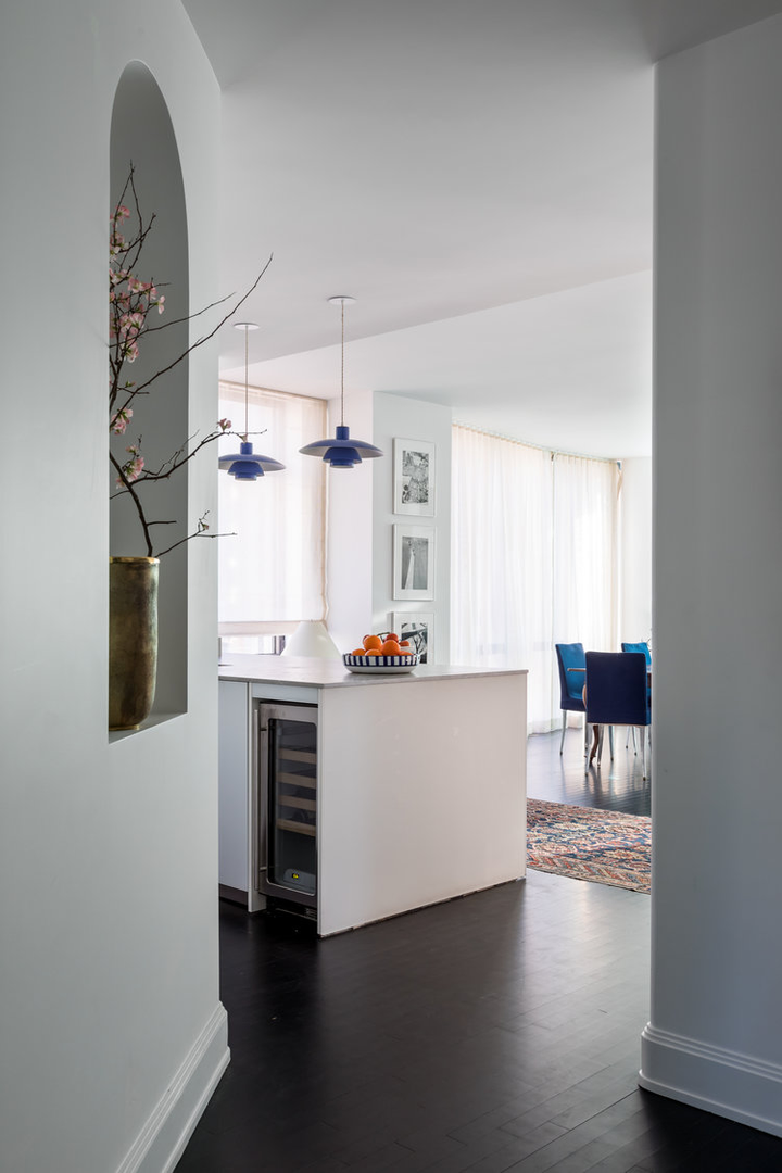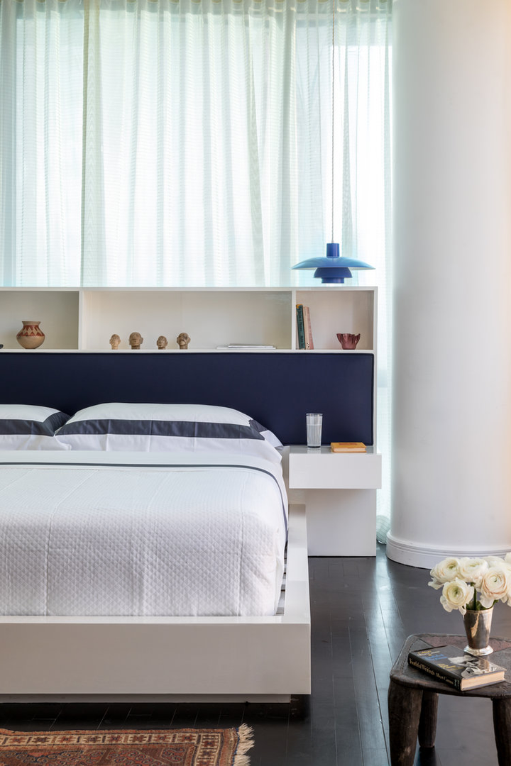 "There is a distinct sense of airiness thanks not only to McGrath’s fresh floor plan but also to existing elements he was gifted: walls of windows contributing northern, southern, and eastern exposure, as well as showstopping views of the entire downtown skyline from their 20th-floor perch. At the start McGrath pulled images of Calvin Klein’s Miami house to illustrate his concept of wide white spaces with oversize furniture. Vast amounts of glass called for delicate Dedar Milano sheers throughout, and stark white walls (after painting began, in a creamier hue, they halted and switched to a whiter white), the combination of which created an ideal environment for both the lady of the house’s large, vivid paintings and the saturated splashes that attract the couple, evidenced in bold Dedar and Le Manach fabrics and iconic Louis Poulsen sconces in an indelible Majorelle blue." (Architectural Digest, January 2019)