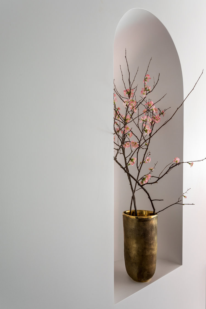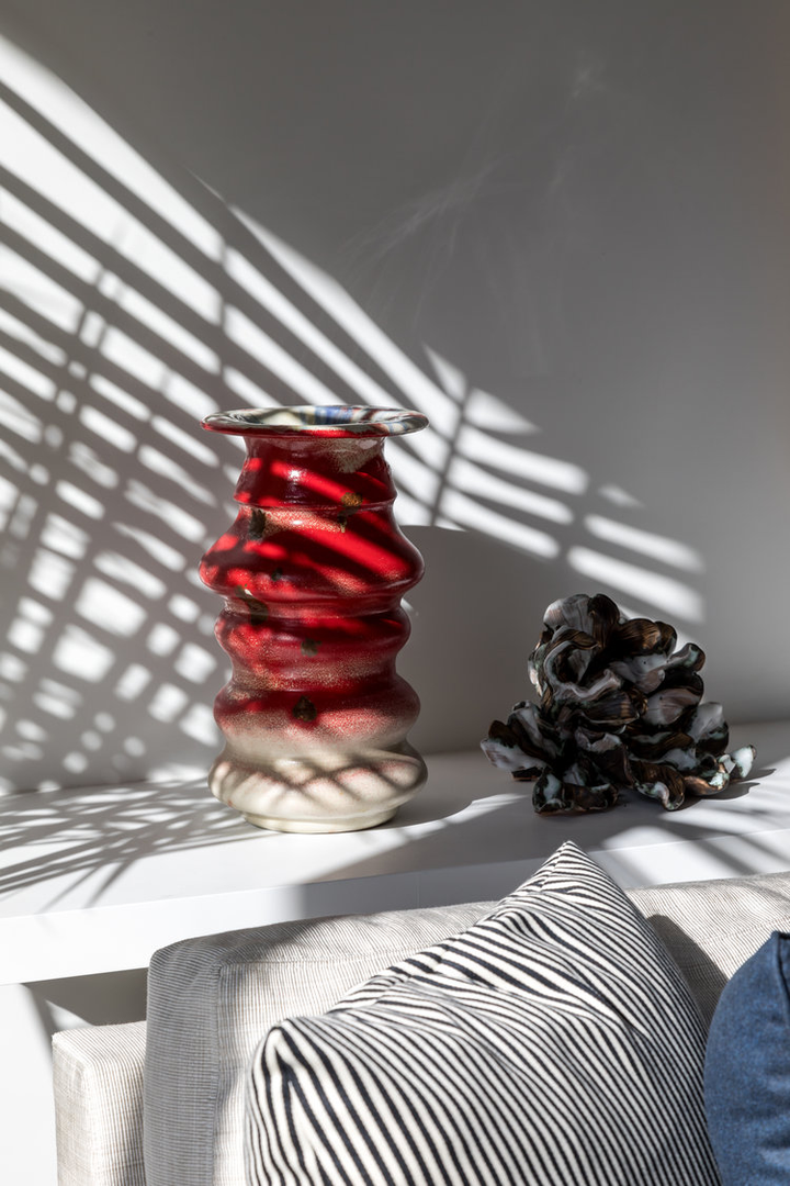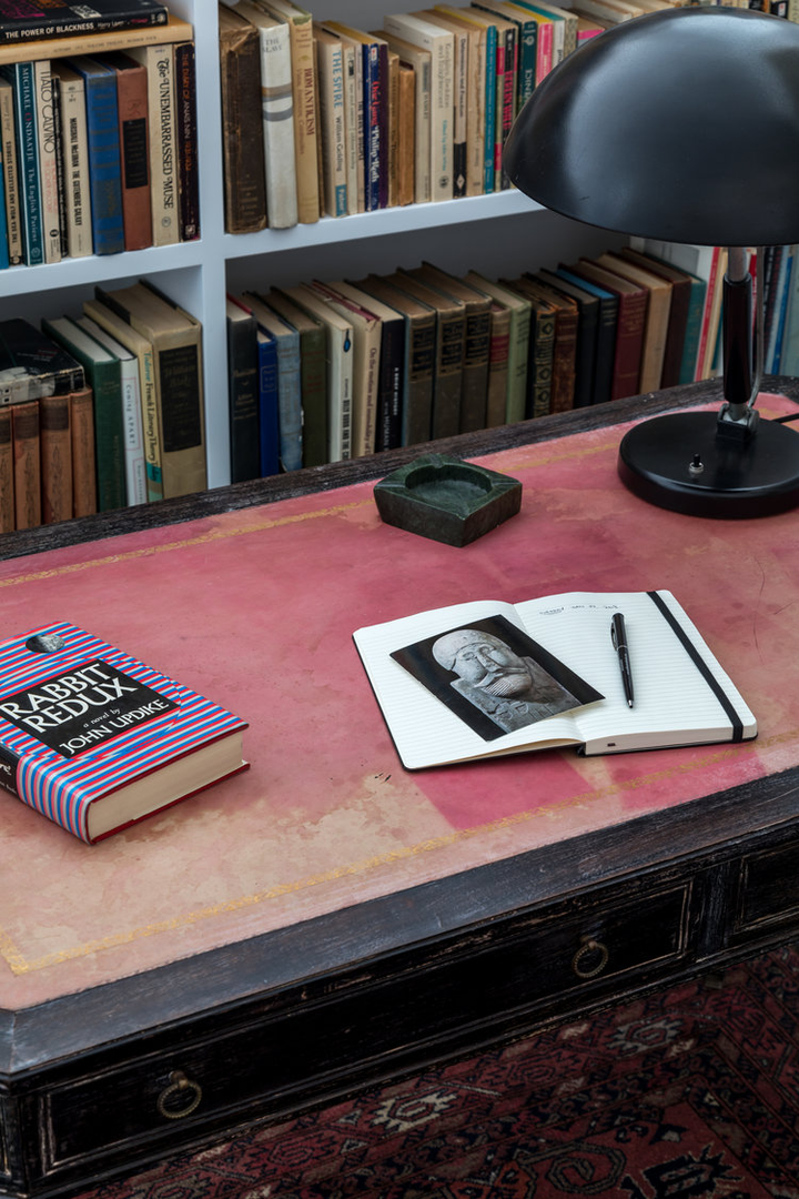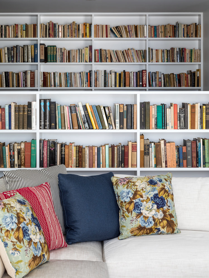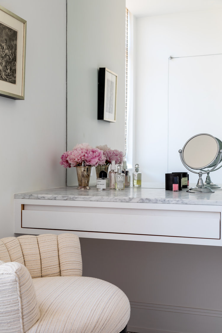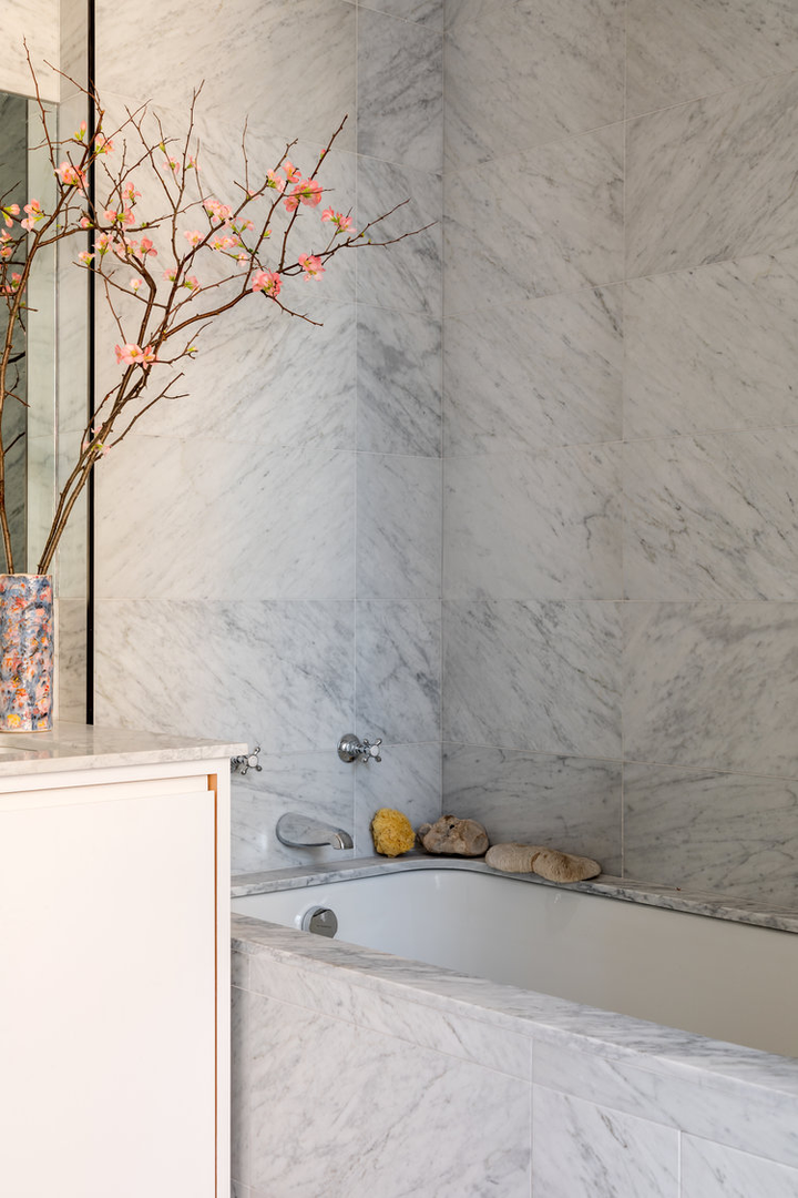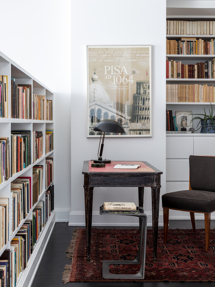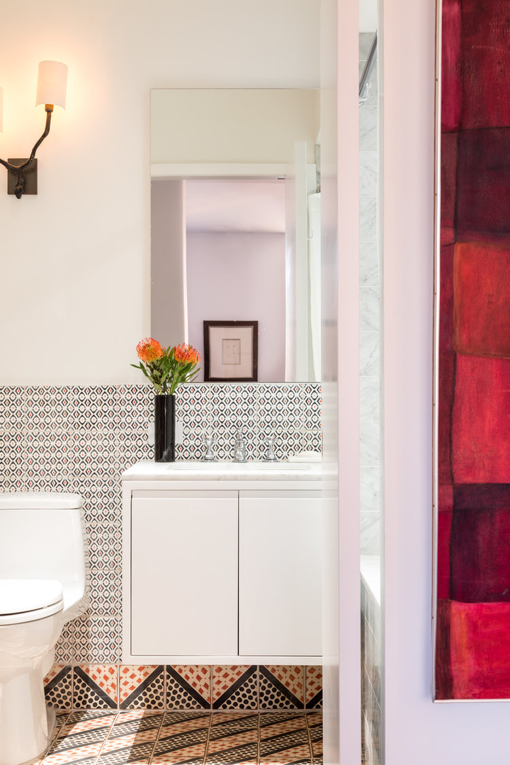 "There is a distinct sense of airiness thanks not only to McGrath’s fresh floor plan but also to existing elements he was gifted: walls of windows contributing northern, southern, and eastern exposure, as well as showstopping views of the entire downtown skyline from their 20th-floor perch. At the start McGrath pulled images of Calvin Klein’s Miami house to illustrate his concept of wide white spaces with oversize furniture. Vast amounts of glass called for delicate Dedar Milano sheers throughout, and stark white walls (after painting began, in a creamier hue, they halted and switched to a whiter white), the combination of which created an ideal environment for both the lady of the house’s large, vivid paintings and the saturated splashes that attract the couple, evidenced in bold Dedar and Le Manach fabrics and iconic Louis Poulsen sconces in an indelible Majorelle blue." (Architectural Digest, January 2019)