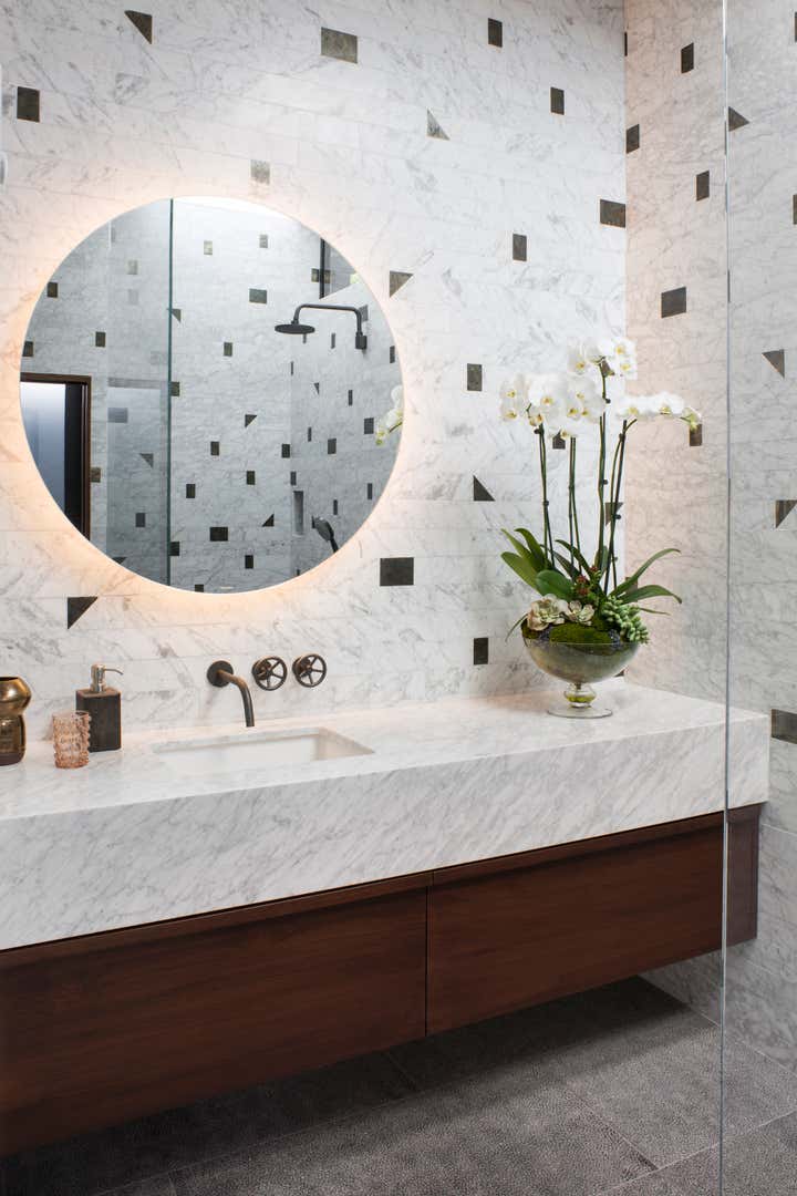Fearlessly edgy and on the highest of the high end, the home is still unquestionably built for the real function of the family—look no further than the master bathroom. Decked in white Carrara marble and industrial fixturing, it’s is a showpiece room that still beckons the relaxation that real life requires.