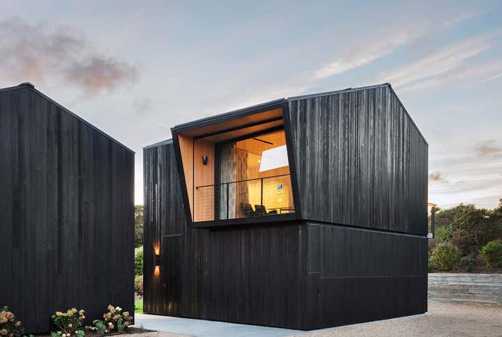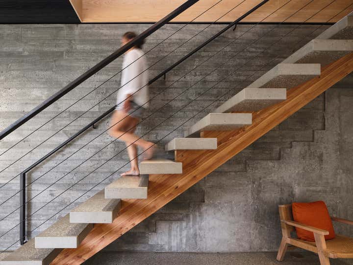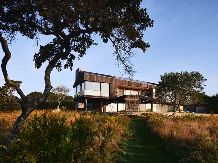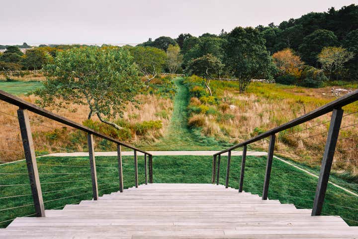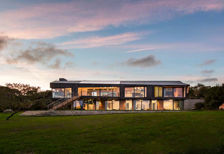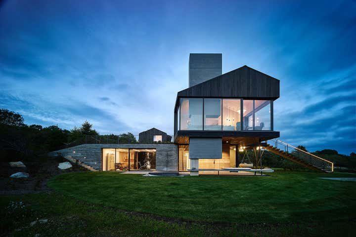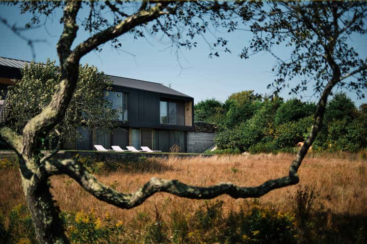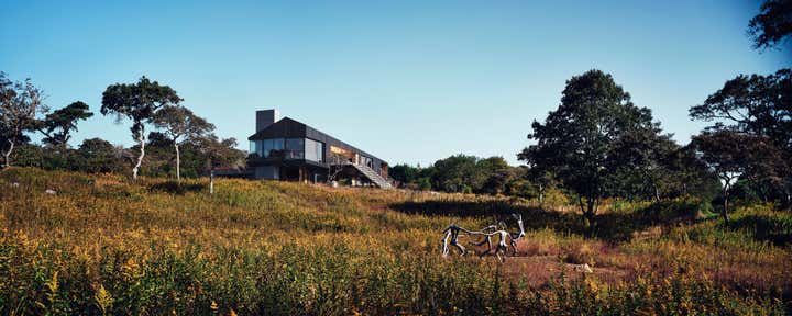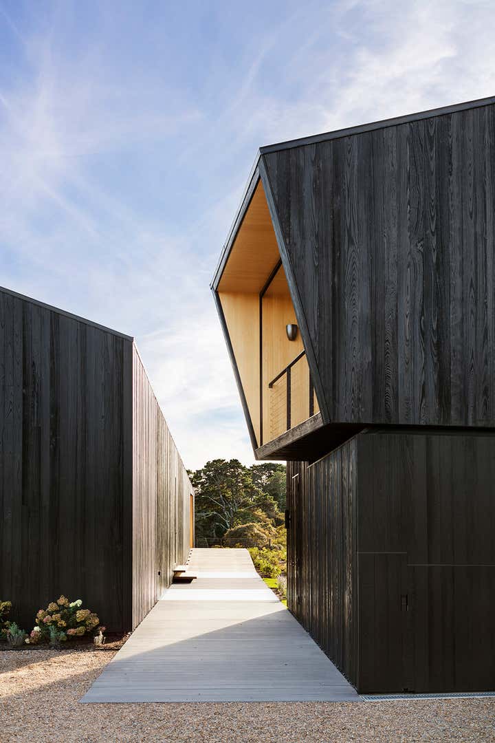 Designed and built in Chilmark, Massachusetts, the Chilmark House project covers almost five acres of previously unbuilt land in the heart of the farming and artistic community that is “Up-Island” Martha’s Vineyard. The site, a former sheep grazing field, overlooks Chilmark Pond, with long views to the Atlantic. I Architectural work was done in collaboration with Gray Organschi Architects of New Haven, Connecticut. Based on a love of the dense aggregation of New England’s farm complexes, we sited the studio and the house barns tightly together, creating a charged outdoor space between them, which provides the approach to the house’s entrance. The ceilings in the public rooms lift to the high ridges, with dropped areas to create a sleeping loft high in the roof. The lower level consists of a series of bedrooms with shared spaces between that look into light wells, landscaped with local rocks and moss. We designed and built many of the freestanding furniture pieces specifically for this project, enlisting great designers and long time collaborators. The house’s striking exterior was achieved used a historic Japanese woodworking method known as shou sugi ban, which preserves and finishes the wood by tactically burning it with fire.