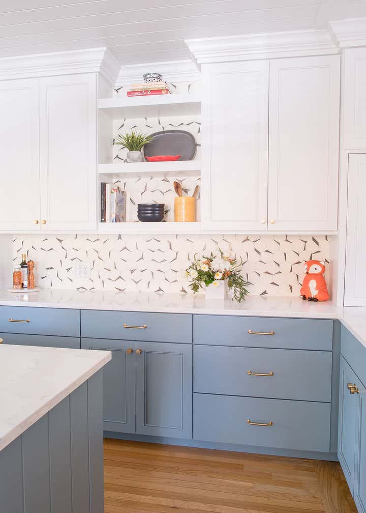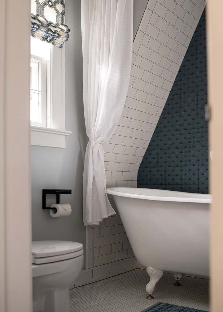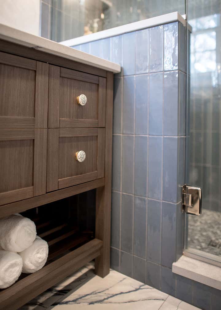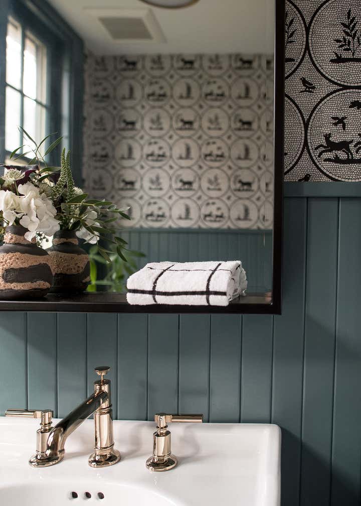 In this 1920’s Dutch Colonial, we overhauled the kitchen dining room to create one large open concept entertaining space. We converted a portion of the entryway into a moody powder room, updated the guest bathroom, and remodeled the primary suite. Our clients wanted unique touches and a little whimsy while staying true to the homes traditional era.