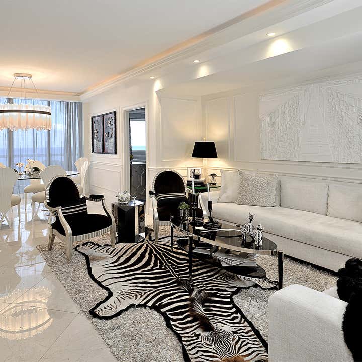 The client had just sold her main house (that was featured in several architectural books) so we brought some of her valued items to the condo like the antique wrought iron gate, the acrylic bedroom nightstands, the silver leaf suede chairs and the Chinese screen.