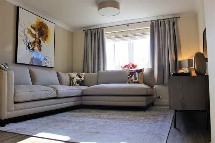 We added a roman blind with curtains to soften the windows and a contemporary rug to warm the seating areas.