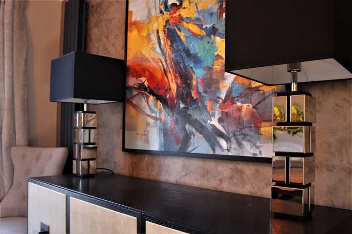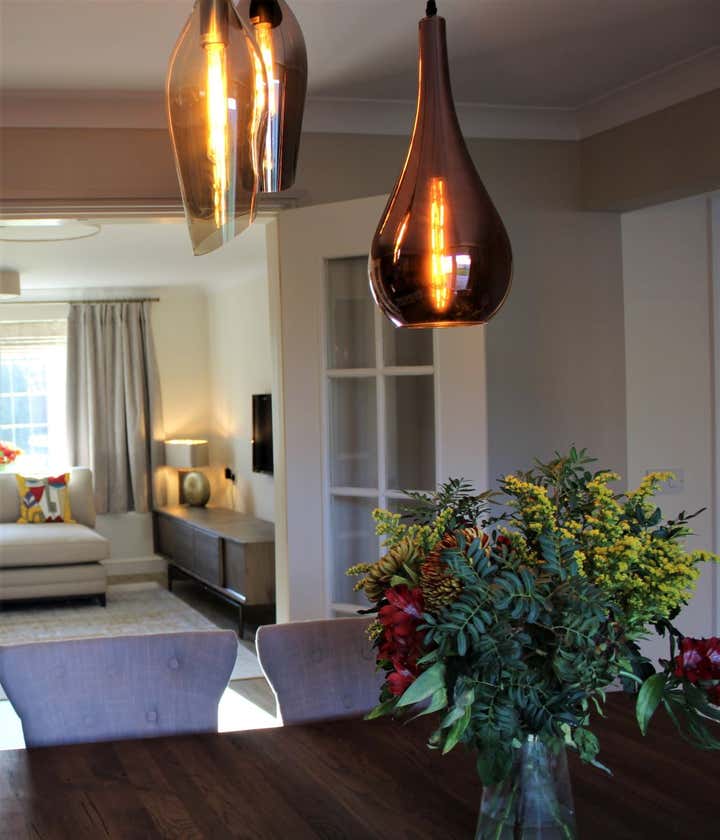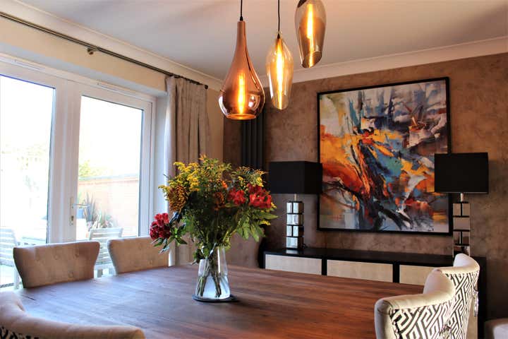 We added venetian plaster to the dining room and created a bespoke light fitting incorporating some pendants from a valued supplier to attain all the shapes into one collective we wanted to achieve.